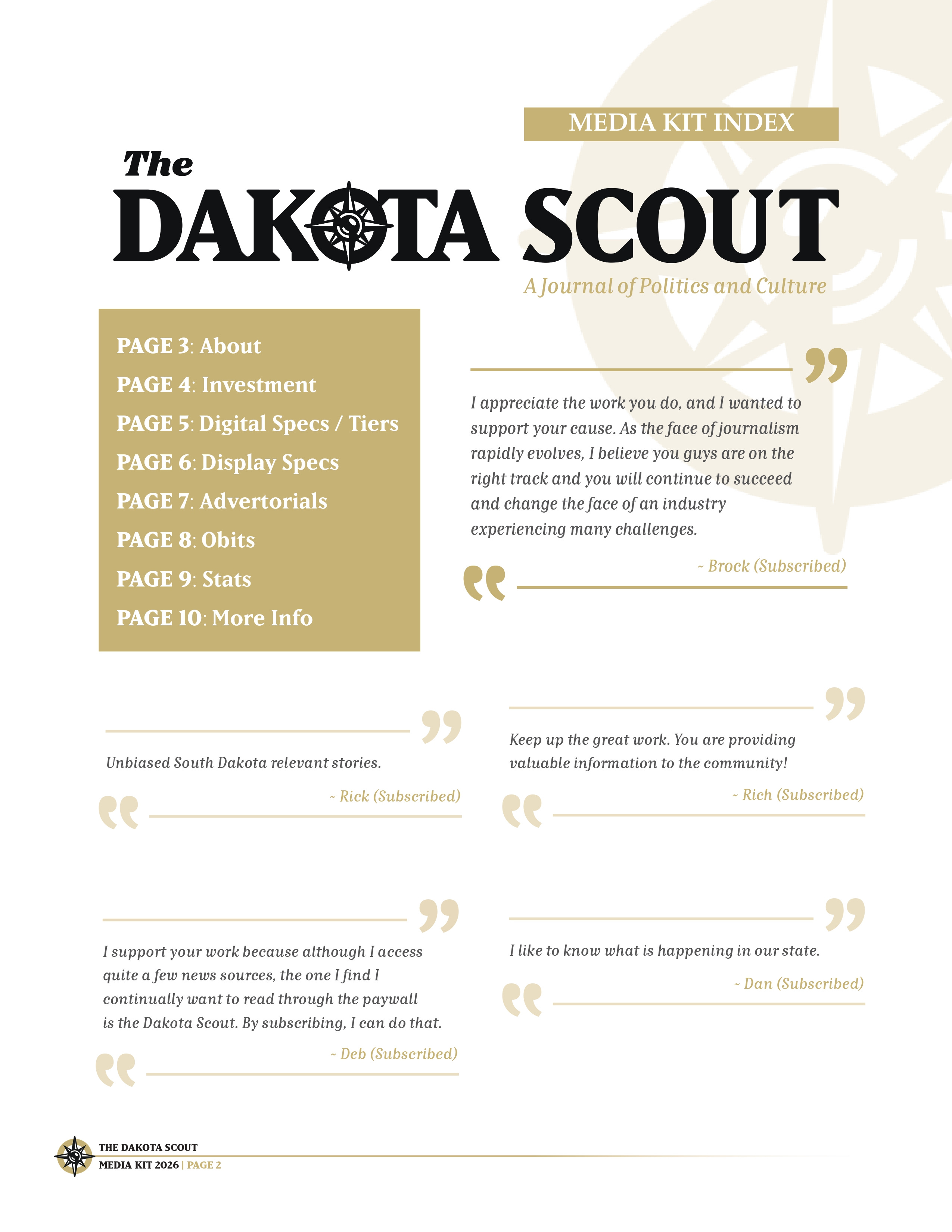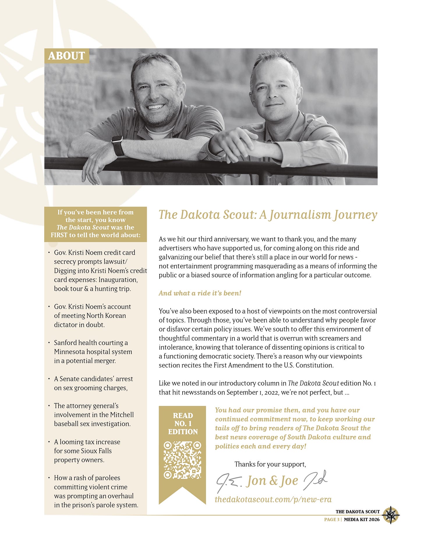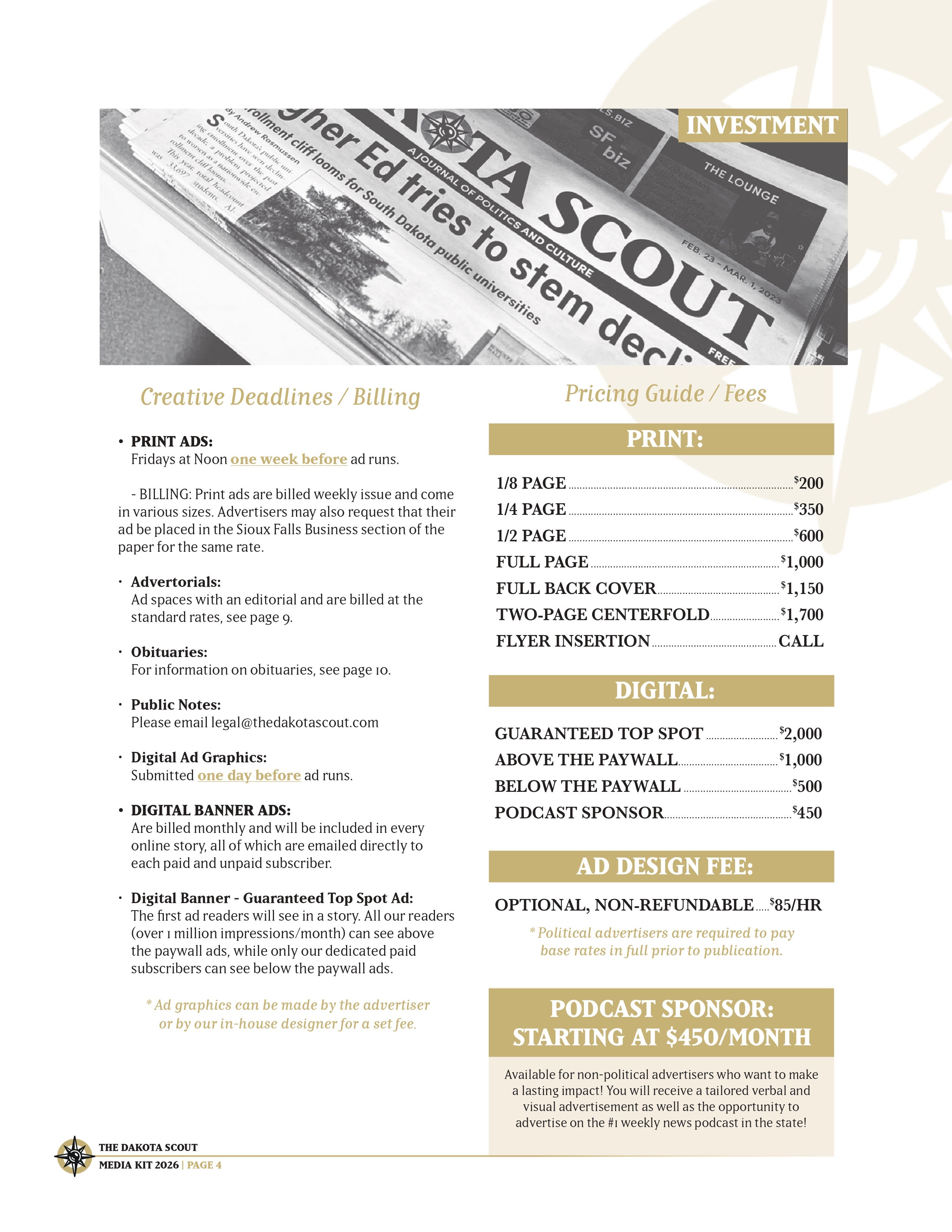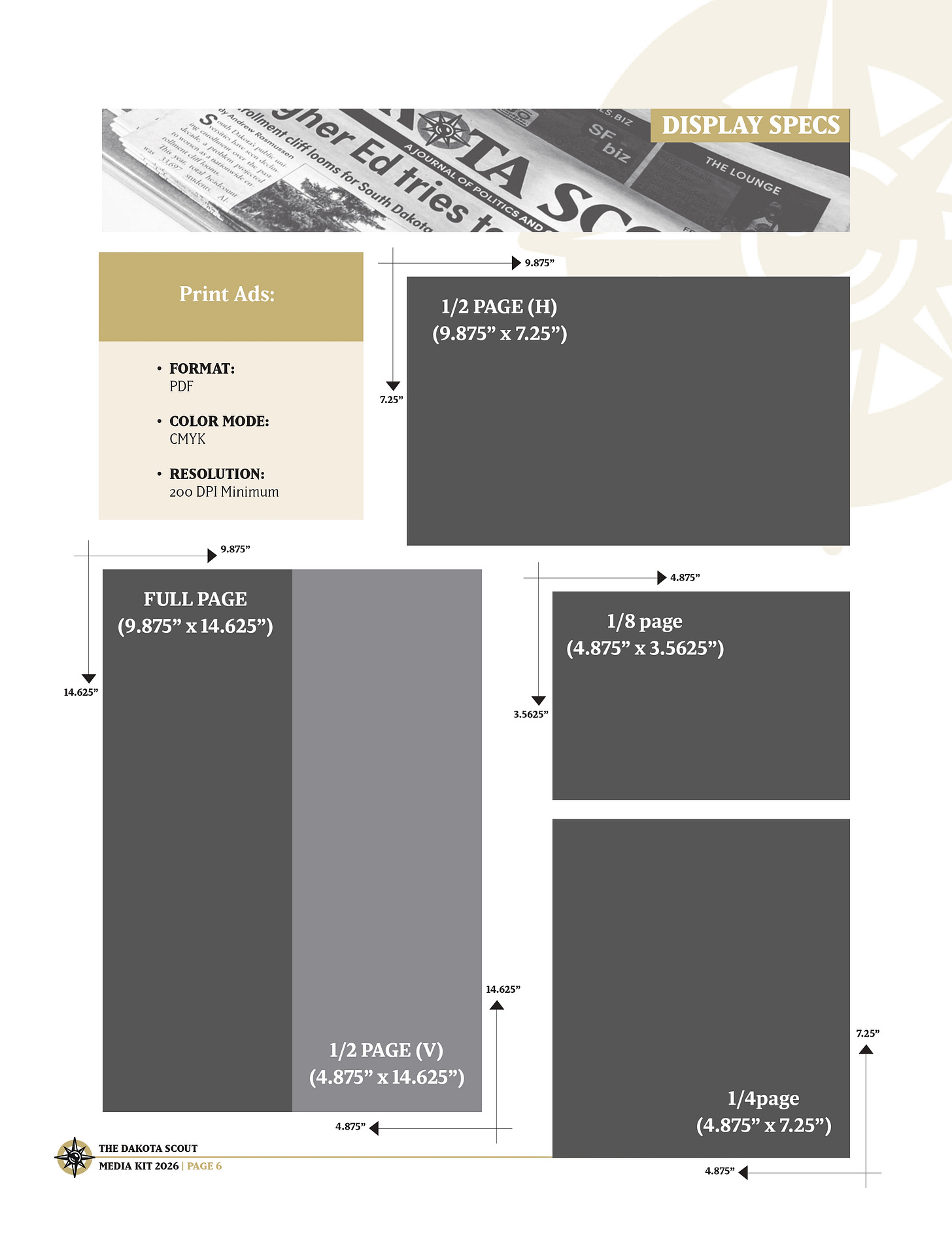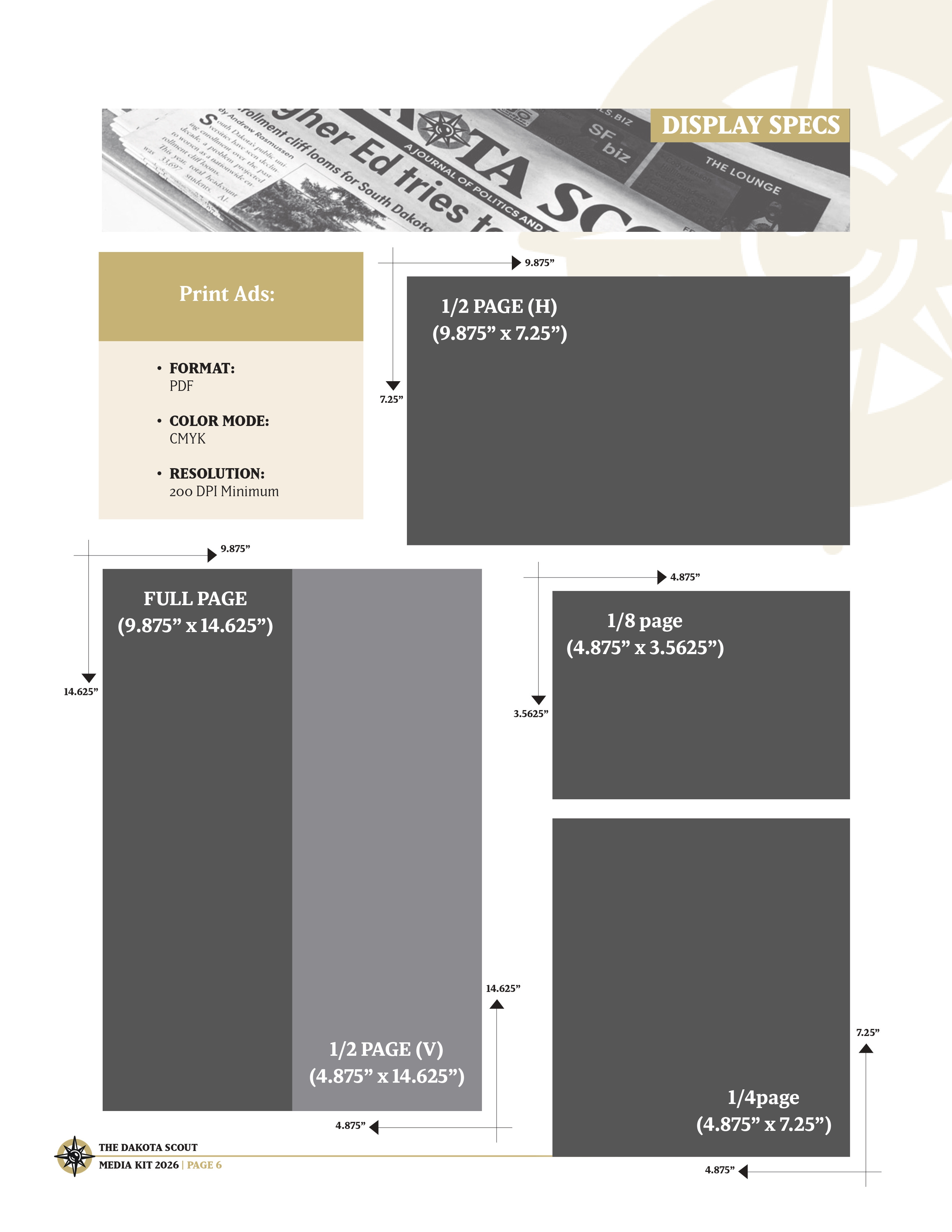 AdvertiseDownload our media kit below, or continue scrolling to read the e-version.The Dakota Scout 2026 Media Kit2.82MB ∙ PDF fileDownloadDownloadPrint Ad Specs Guide78KB ∙ PDF fileDownloadDownload