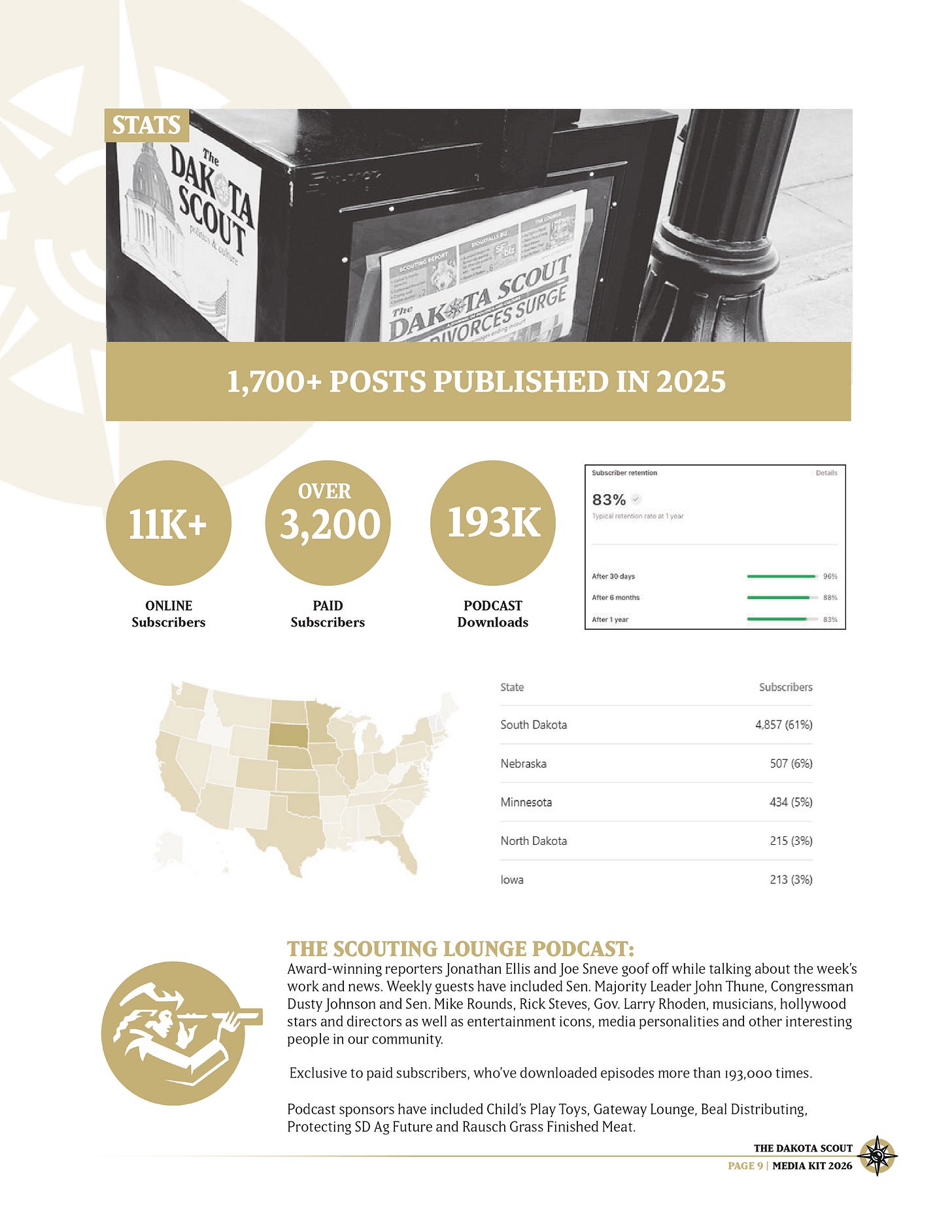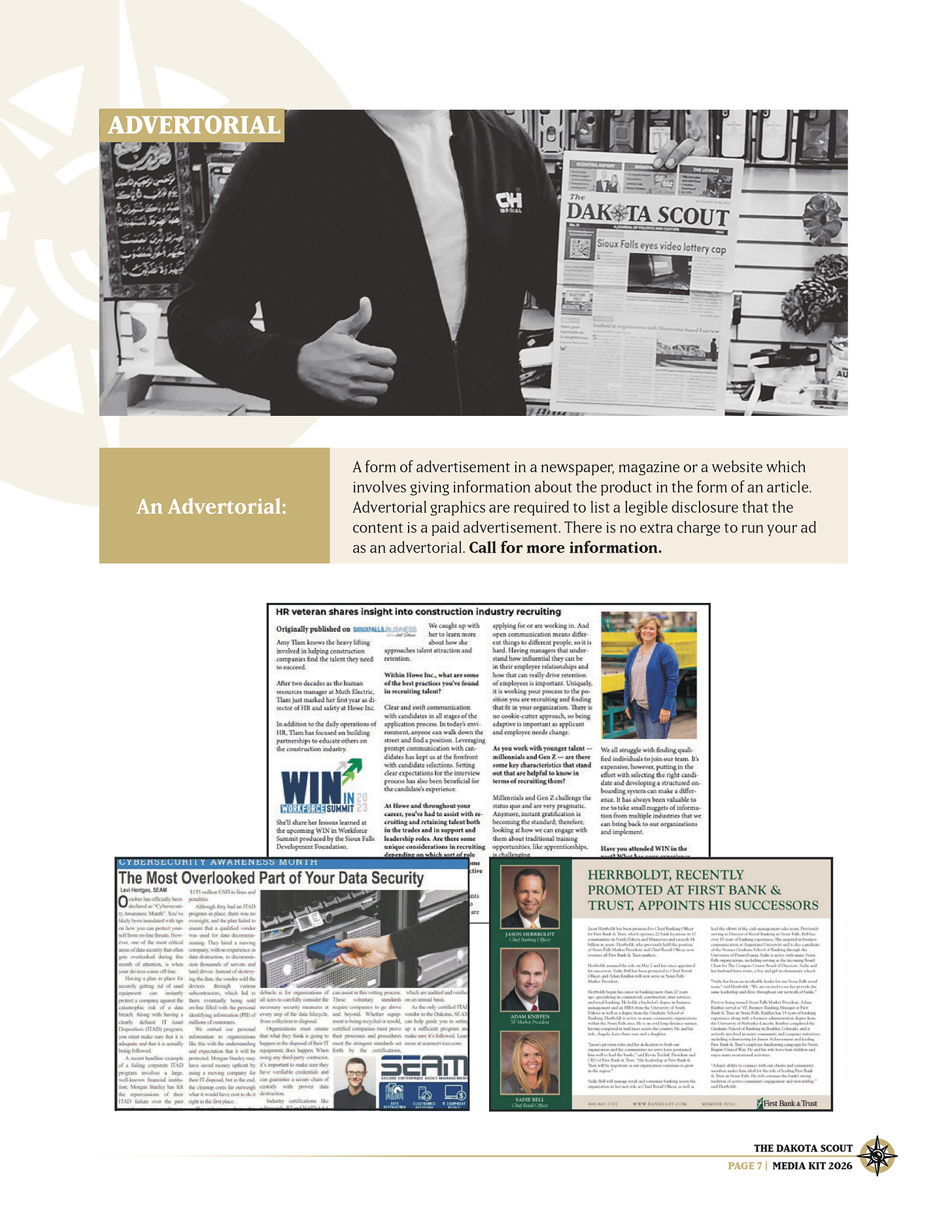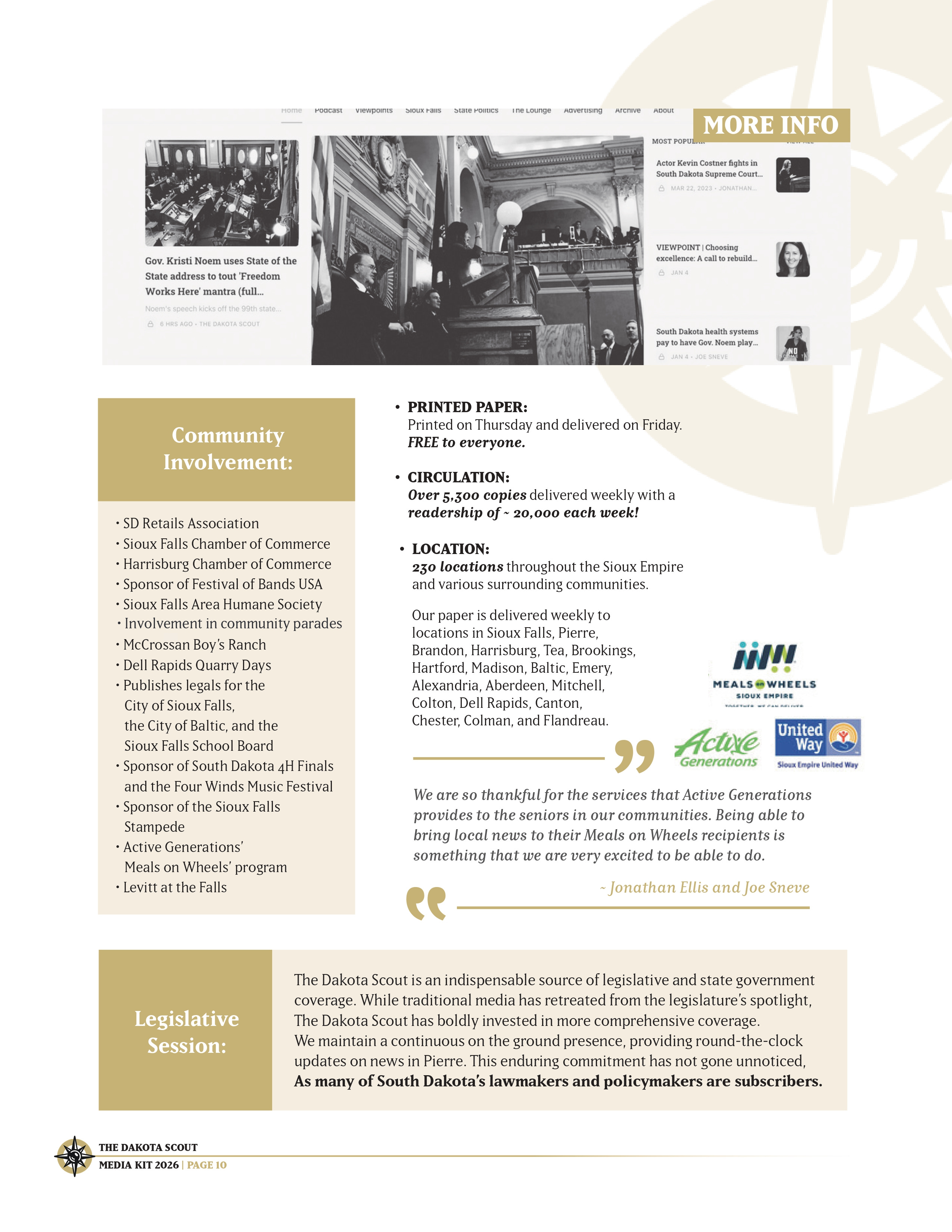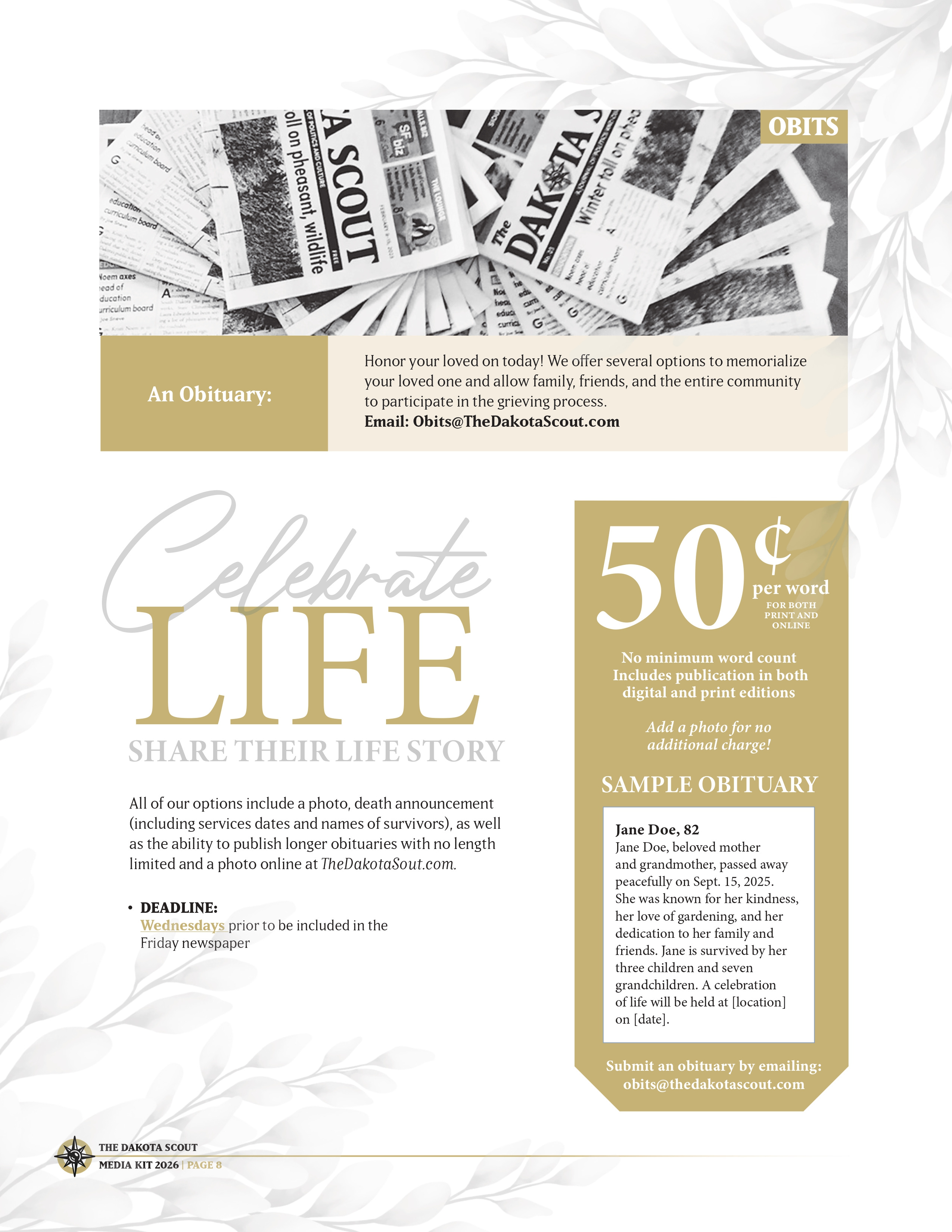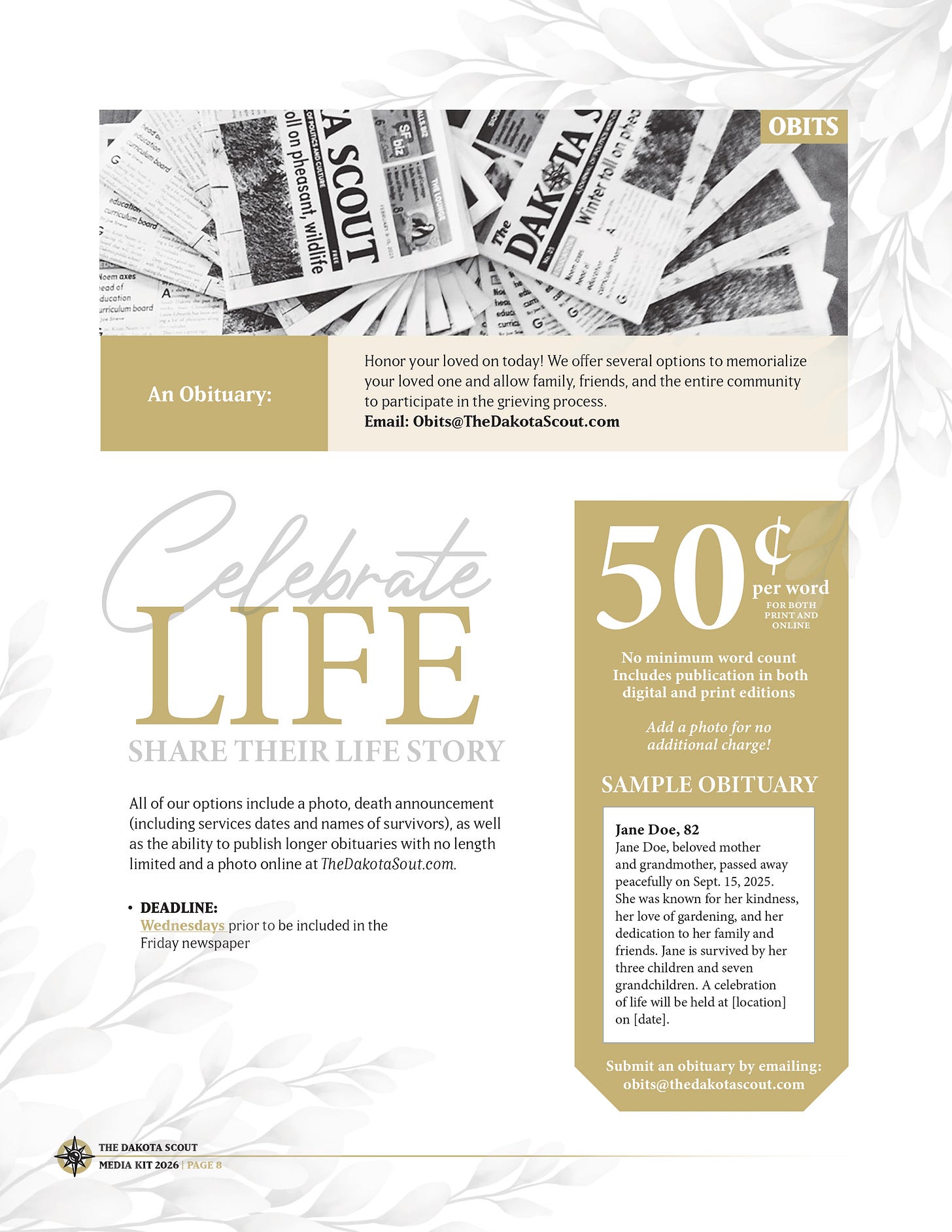 AdvertiseDownload our media kit below, or continue scrolling to read the e-version.The Dakota Scout 2026 Media Kit2.82MB ∙ PDF fileDownloadDownloadPrint Ad Specs Guide78KB ∙ PDF fileDownloadDownload