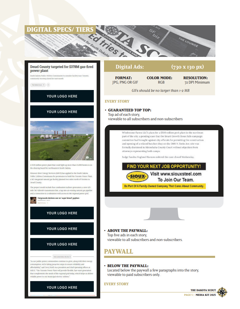 AdvertiseDownload our media kit below, or continue scrolling to read the e-version.The Dakota Scout 2026 Media Kit2.94MB ∙ PDF fileDownloadDownloadPrint Ad Specs Guide78KB ∙ PDF fileDownloadDownload