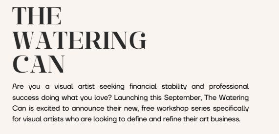 The Watering Can is excited to announce their new, free workshop series specifically for visual artists who are looking to define and refine their art business. All workshops will be led by business coach and founder of The Watering Can, Claudia Dail, as well as artists Alex Lunstra and Julie Dent.