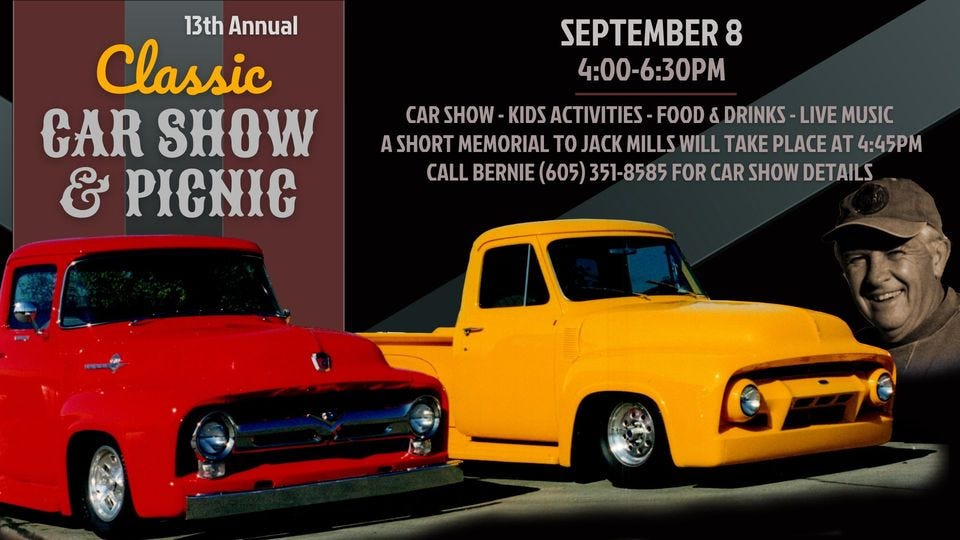 Join us for our 13th Annual Classic Car Show & Community Picnic. There will be kids' activities, food, games, music, cars, and much more. A short memorial will take place at 4:45 p.m. for Jack Mills.
