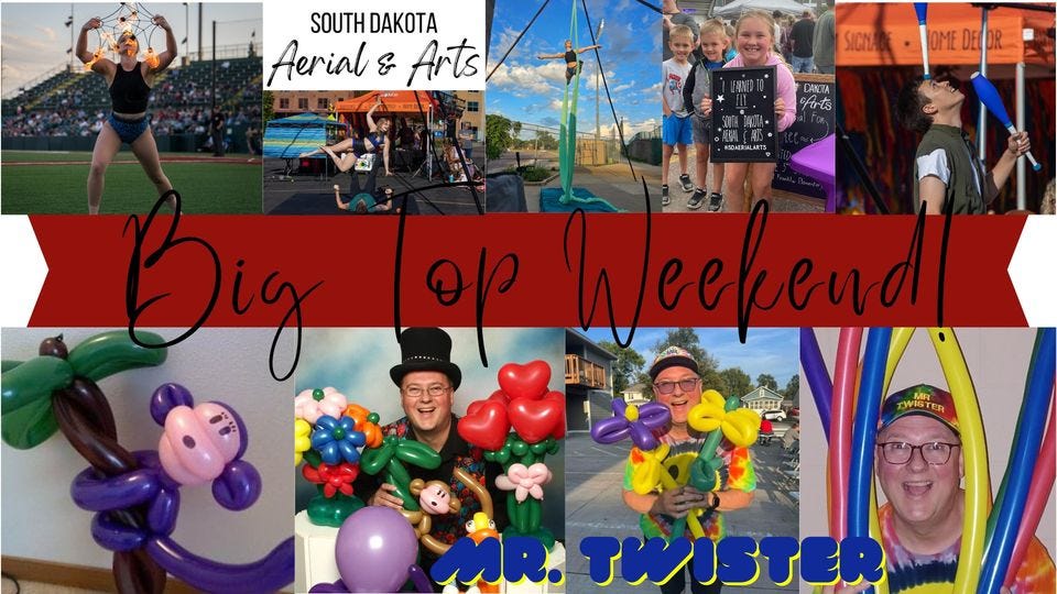 An exciting schedule of events is in store all weekend long. Join us for thrilling shows performed by South Dakota's very own circus performance company. You'll see aerial acts, juggling, baton performances, and partner acrobatics right here on the festival grounds. Public try-its will also be available following the show on Saturday and Sunday.