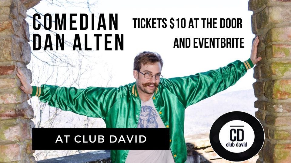 Comedian Dan Alten is coming all the way from Kentucky to tell jokes at Club David. Featuring Hannah Marie and hosted by Joey Stibral.