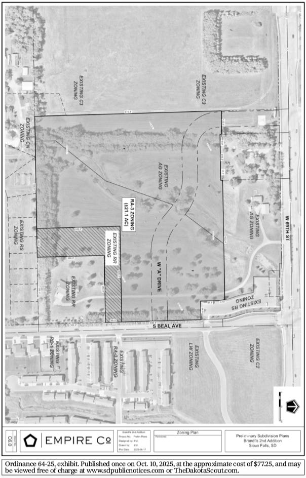 26. 2nd Reading: Deferred from the Meeting of Wednesday, August 6, 2025; Deferred from the City Council Meeting on Wednesday, August 6, 2025 and Tuesday, September 2nd, 2025: AN ORDINANCE OF THE CITY OF SIOUX FALLS, SD, REZONING PROPERTY LOCATED SOUTH OF W. 69TH ST. AND WEST OF S. BEAL AVE. FROM THE AG AGRICULTURE DISTRICT TO THE RA-3 APARTMENT RESIDENTIAL—HIGH DENSITY DISTRICT, NO. 021361-2025, AND AMENDING THE OFFICIAL ZONING MAP OF THE CITY OF SIOUX FALLS. The Planning Commission recommends approval (5-0).