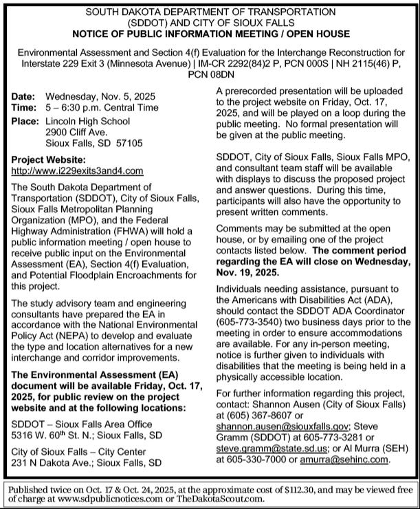 Published once on Oct. 24, 2025, at the approximate cost of $18.04, and may be viewed free of charge at www.sdpublicnotices.com or TheDakotaScout.com.