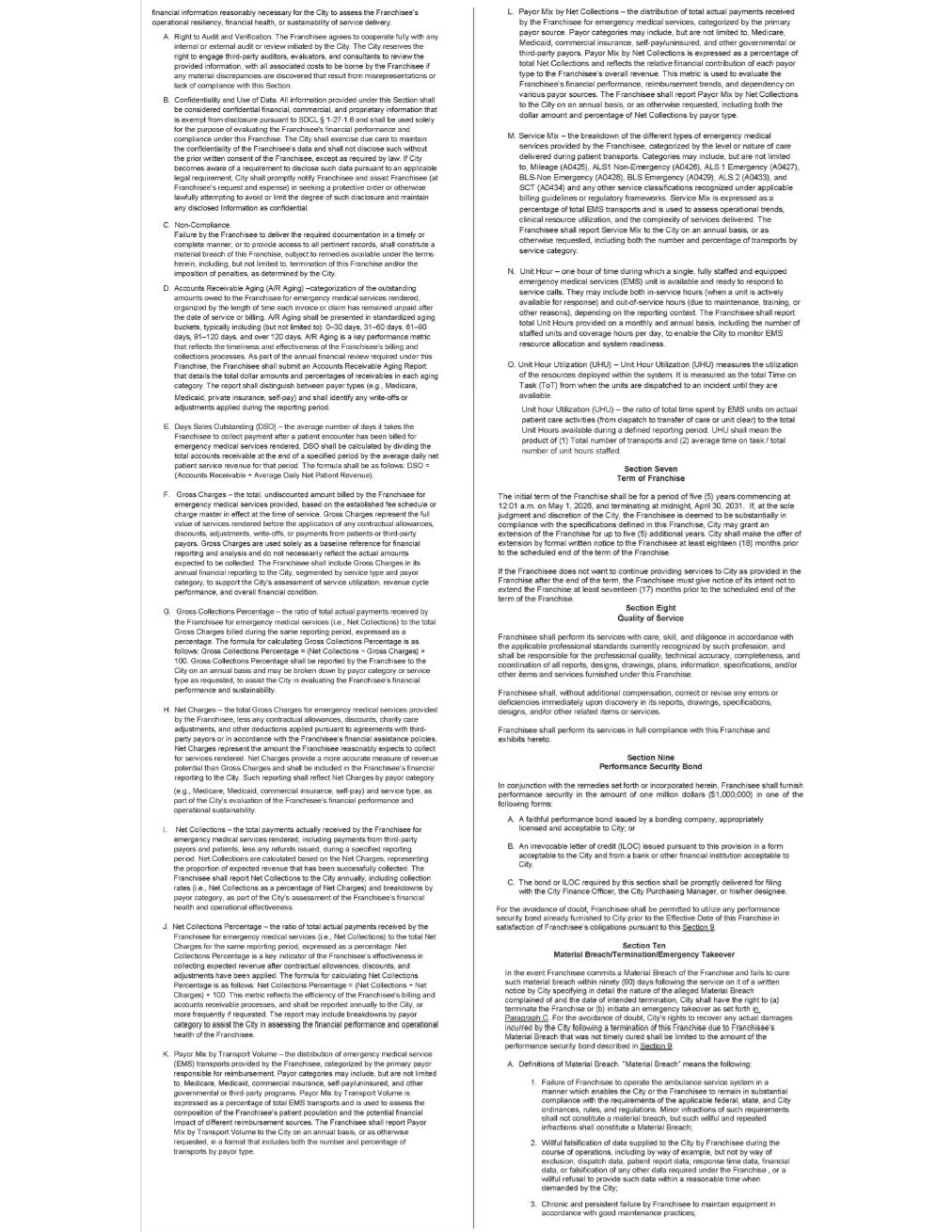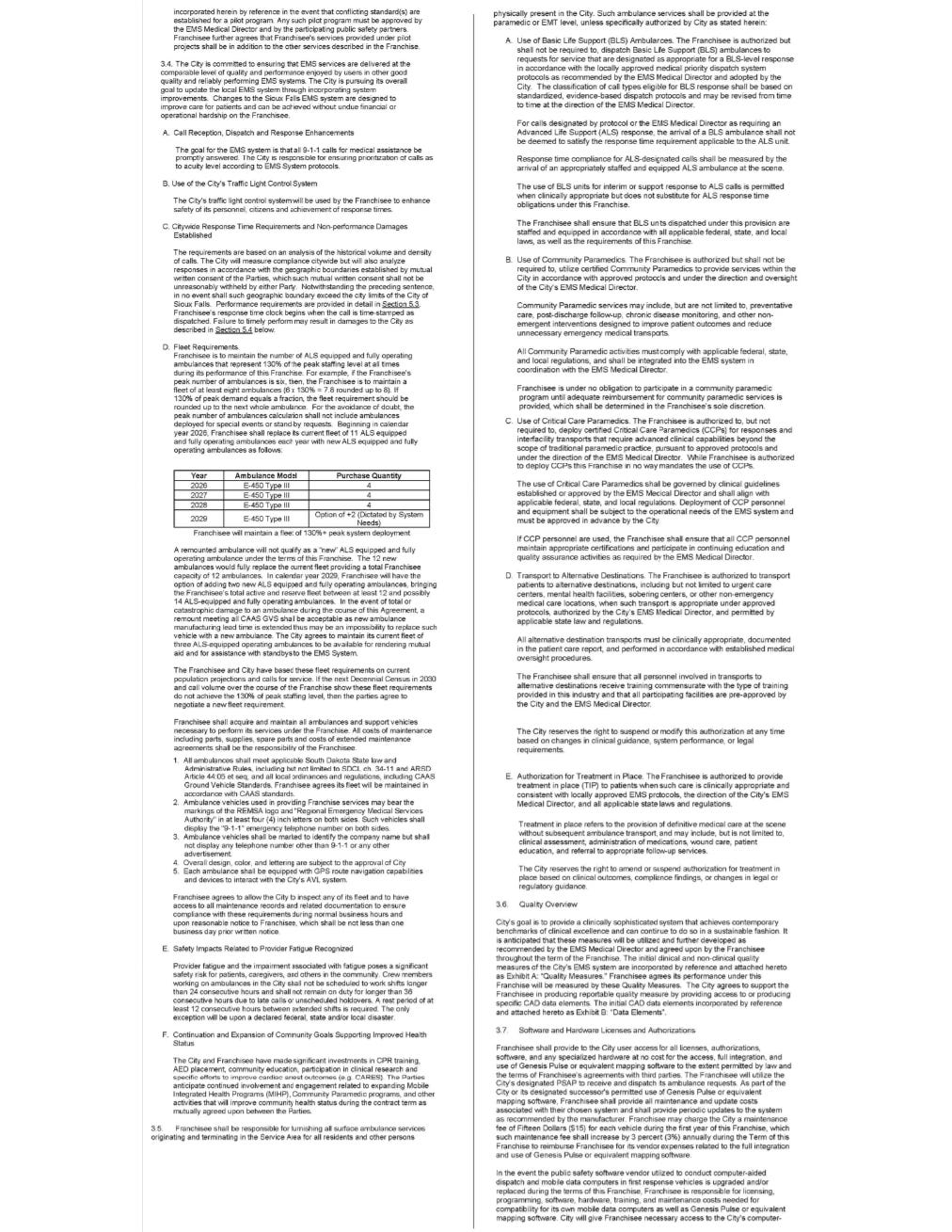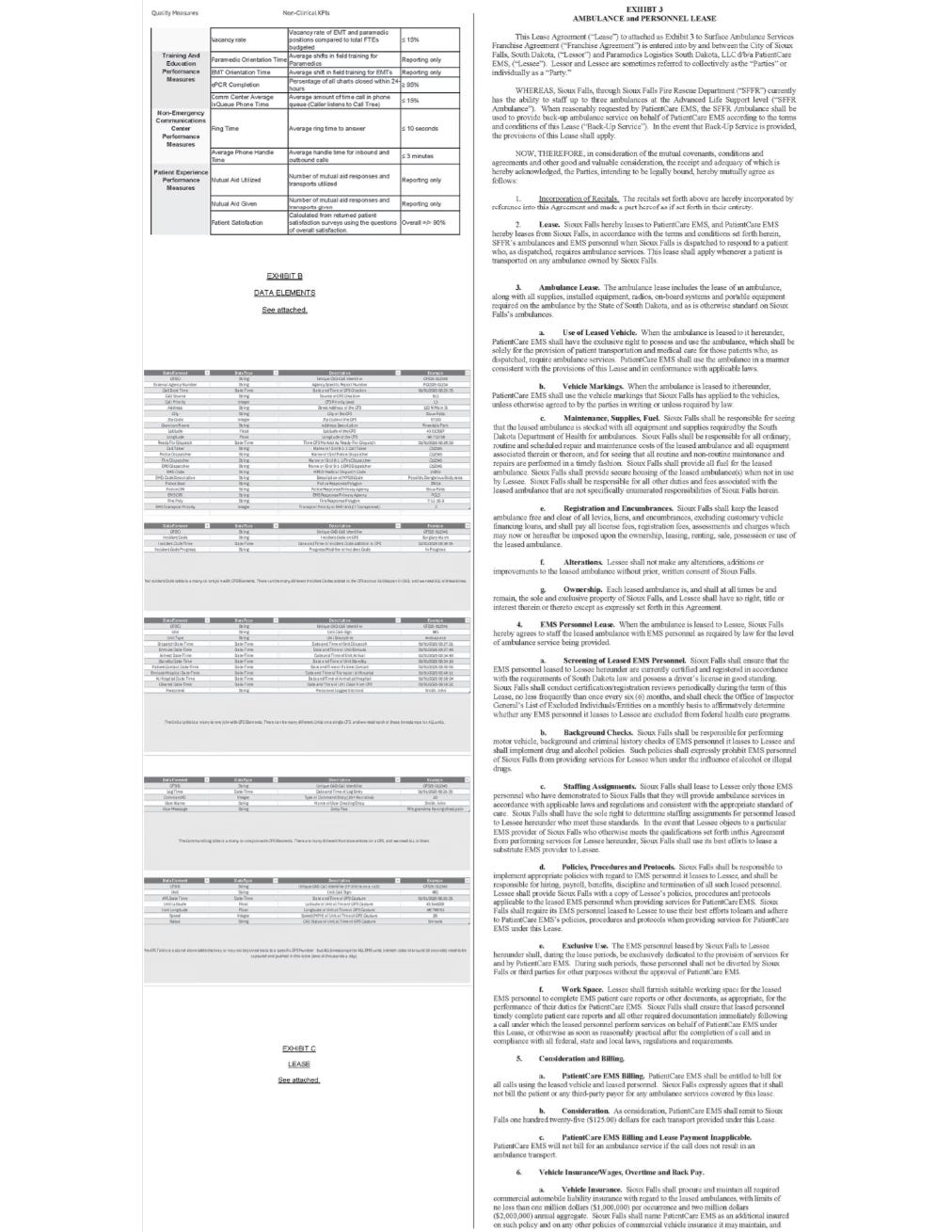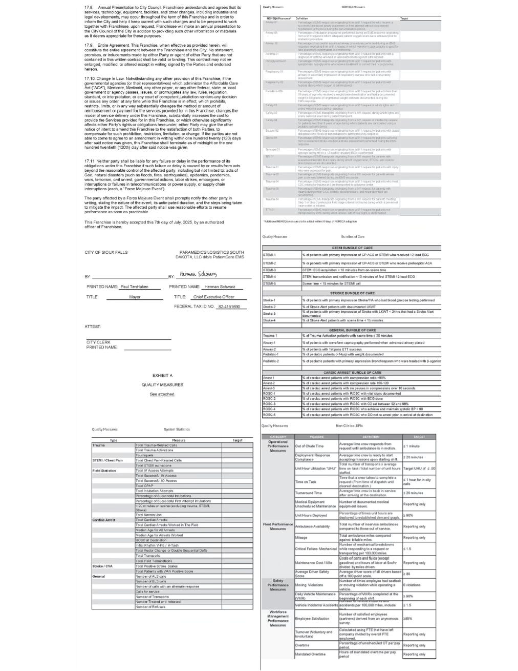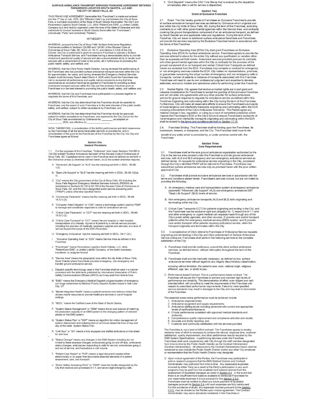WHEREAS, that the City’s Public Health Director, having reviewed the performance of Paramedics Logistics South Dakota, LLC, dba “PatientCare EMS” (PatientCare EMS) who has provided surface ambulance transport services within the City for approximately ten years, and having reviewed the Emergency Medical Services System Audit Summary Report dated March 4, 2025 (Report) as presented to the Sioux Falls City Council, which Report found PatientCare EMS has met or exceeded all performance and quality metrics standards during that time, and recommends an exclusive franchise be granted to PatientCare EMS for providing surface ambulance transport services within the City and this exclusive franchise given to PatientCare EMS is in the best interest in promoting the public health, safety, and welfare;