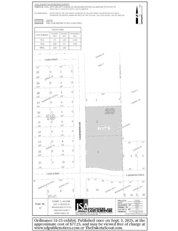 AN ORDINANCE OF THE CITY OF SIOUX FALLS, SD, REZONING PROPERTY LOCATED NORTH OF E. 69TH ST. AND EAST OF S. SYCAMORE AVE. FROM THE RD 1 TWIN HOME/DUPLEX RESIDENTIAL—SUBURBAN DISTRICT TO THE RD-2 TOWNHOME RESIDENTIAL—SUBURBAN DISTRICT, NO. 021536-2025, AND AMENDING THE OFFICIAL ZONING MAP OF THE CITY OF SIOUX FALLS.