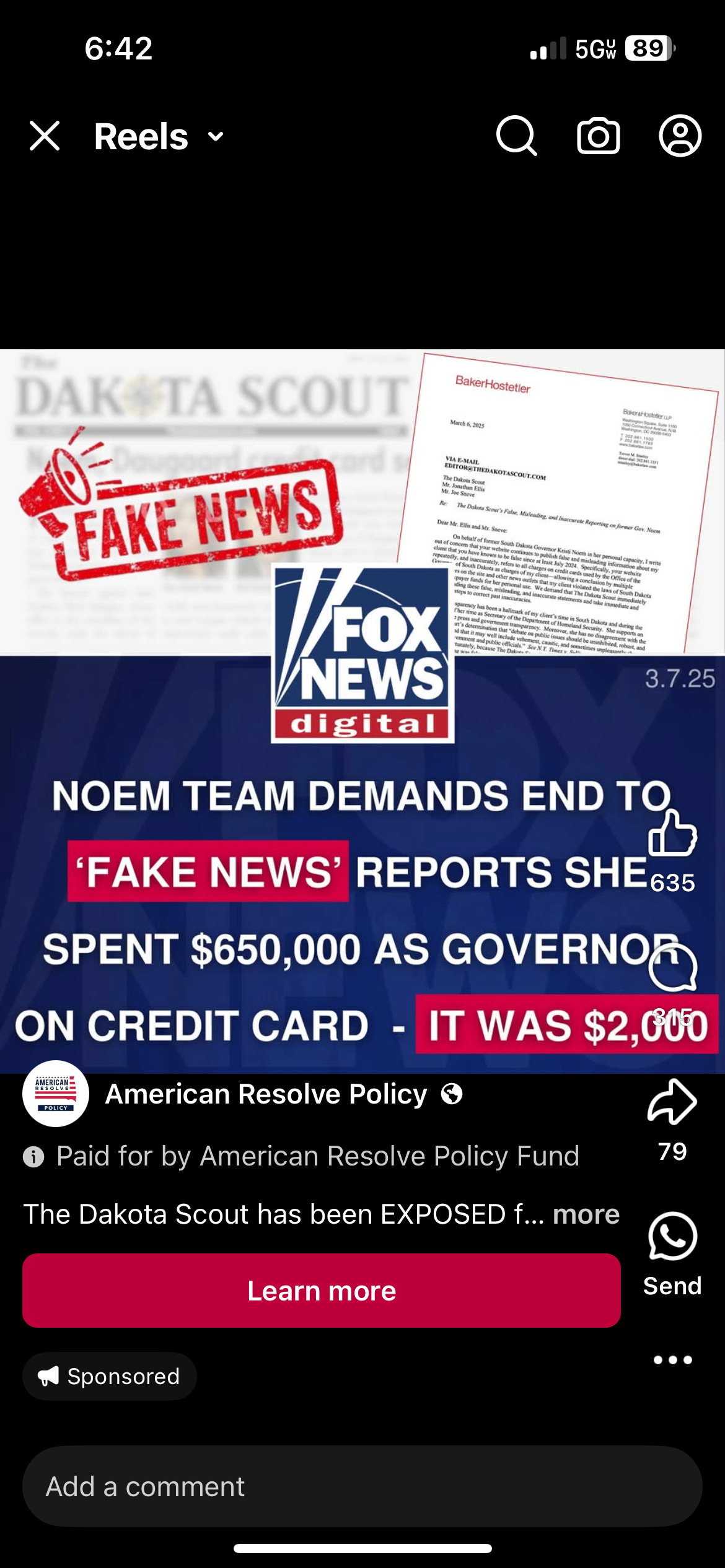 The American Resolve Policy Fund is circulating a March 7 Fox News Digital story about a lawsuit threat from a personal lawyer of the former South Dakota governor in Washington, D.C. The paid post on Facebook, and a less-viewed version on X, echo a letter from Noem’s lawyer, as well as comments from her personal spokesperson.