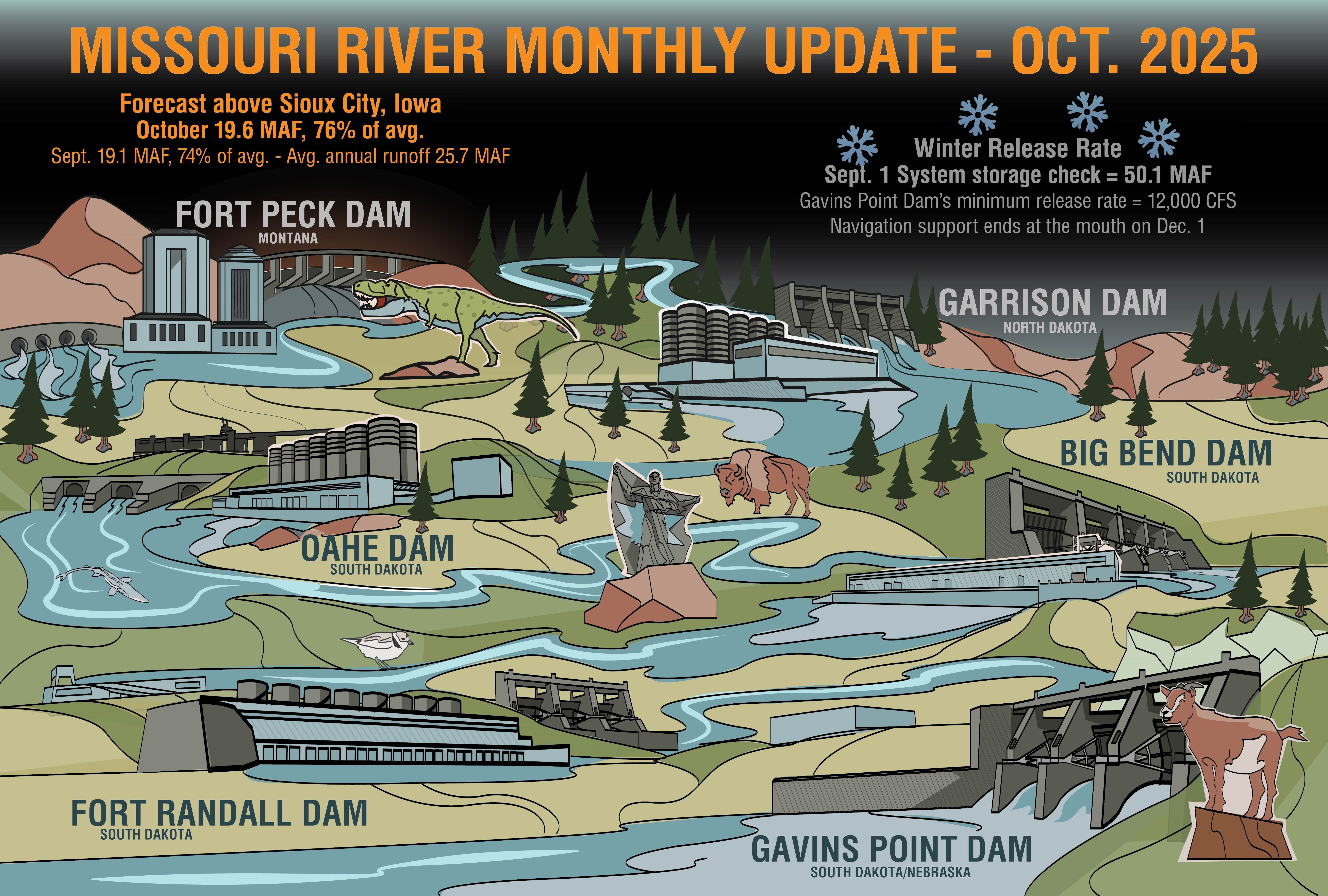 “Beneficial rainfall occurred over central South Dakota and North Dakota in September resulting in well-above average runoff into Oahe, Big Bend, Fort Randall, and Gavins Point,” said John Remus, chief of the U.S. Army Corps of Engineers’ Missouri River Basin Water Management Division.