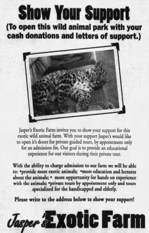 According to the Feb. 18, 2001, edition of the Argus Leader, the collection of living critters and beasts that had been living at Jasper’s Exotic Farm five miles west of the city came after the owners had run the zoo without necessary permitting. A federal fraud investigation also played a role in David Jasper and his wife swiftly offloading the animals, shuttering their business and moving out of state.