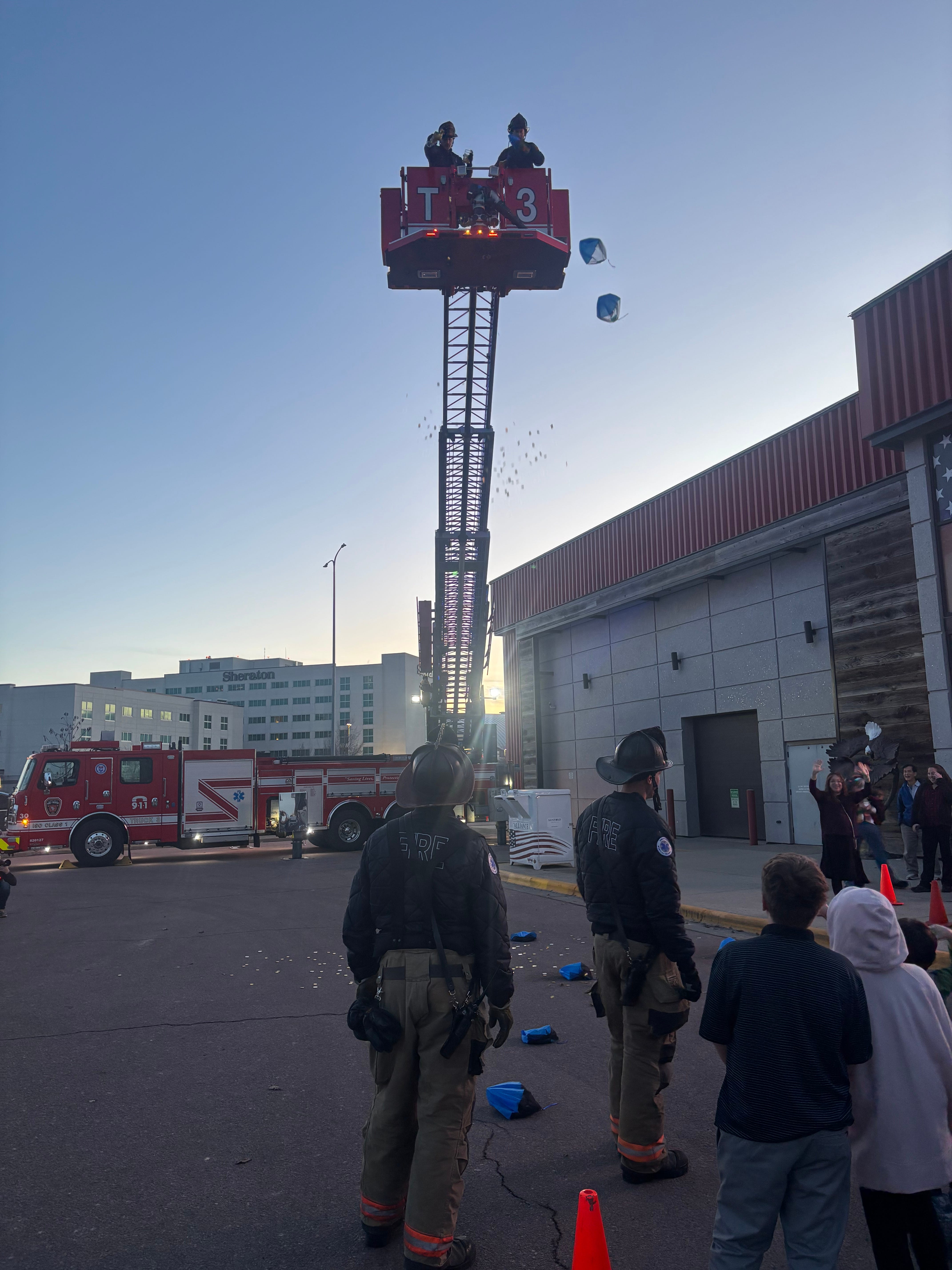 Following a countdown from 10 to one, Sioux Falls firefighters – urged on by dozens of children – started tossing chocolates from a ladder truck Sunday evening. The children then scampered to gather the candies.