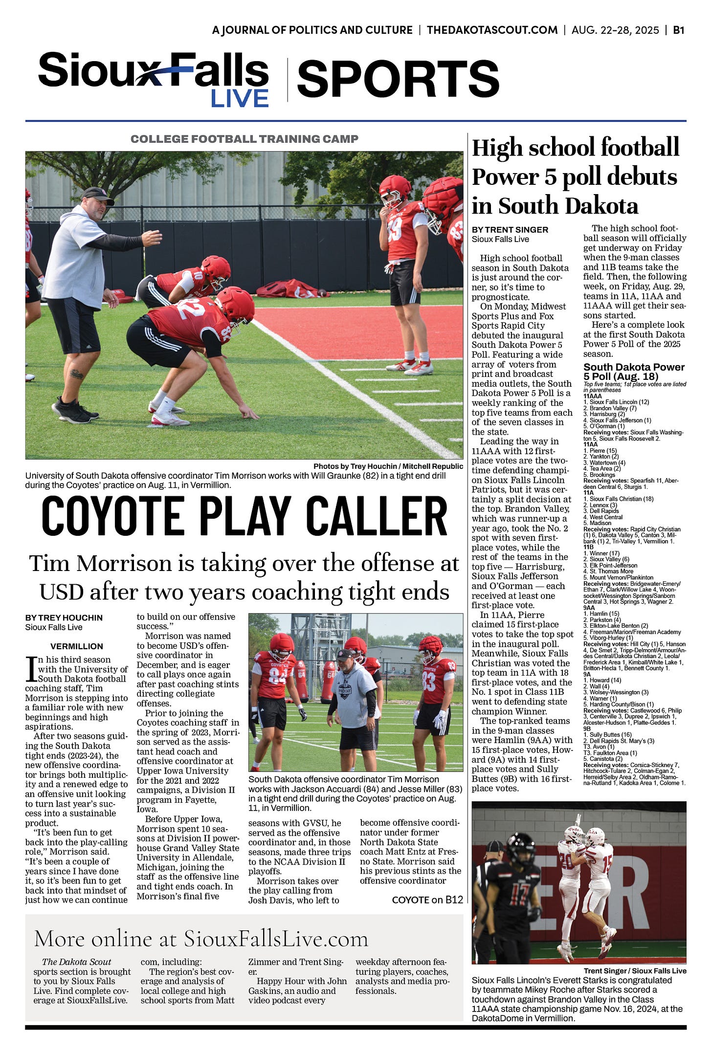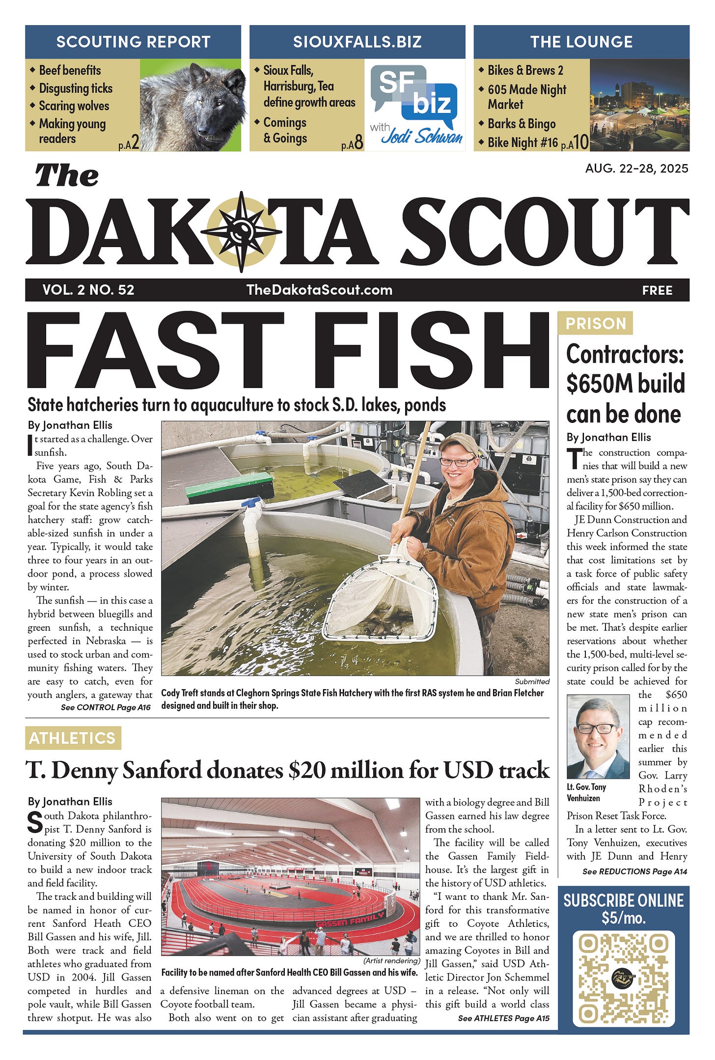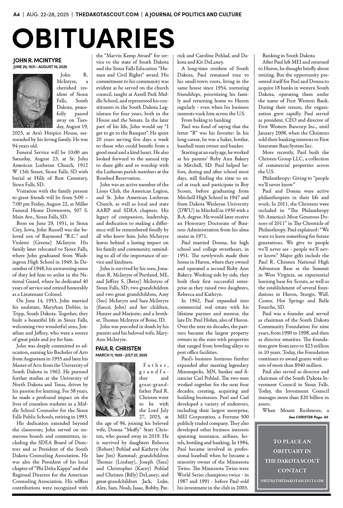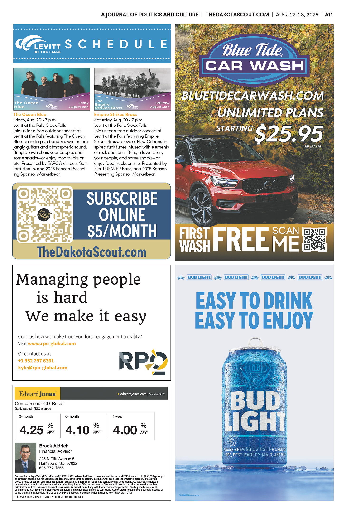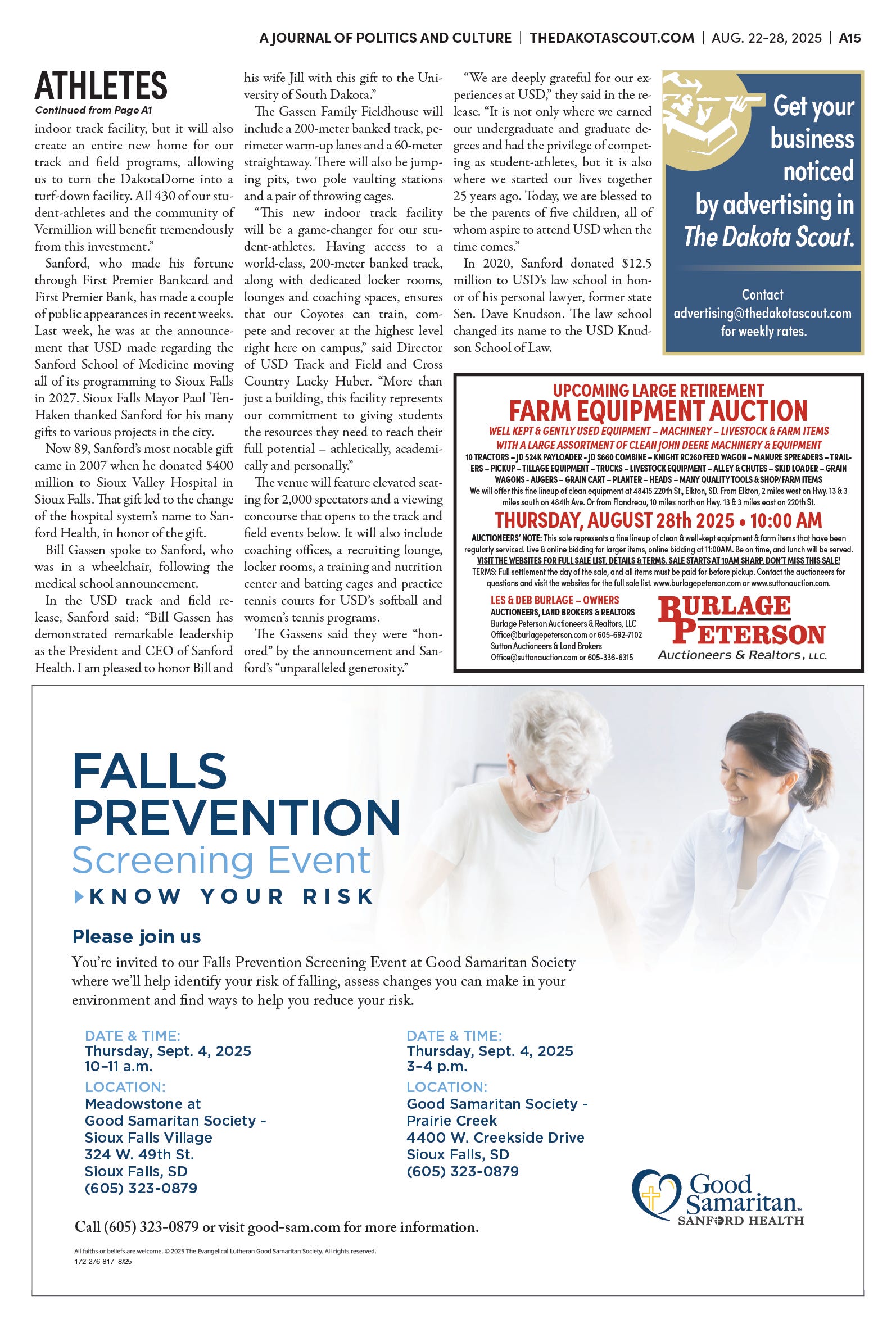 FREE TO READThe Dakota Scout E-editionVol. 2 No. 52 | Aug. 22 - 28, 2025The Dakota ScoutAug 25, 20253ShareThe Dakota Scout is reader-supported. To receive new posts and support our work, consider becoming a paid subscriber.SubscribeTo place an obituary, email obits@thedakotascout.com SiouxFalls.BusinessLegals & Public Notices: August 22, 2025Aug 22Read full storySports content courtesy SiouxFallsLive.comPreviousNext