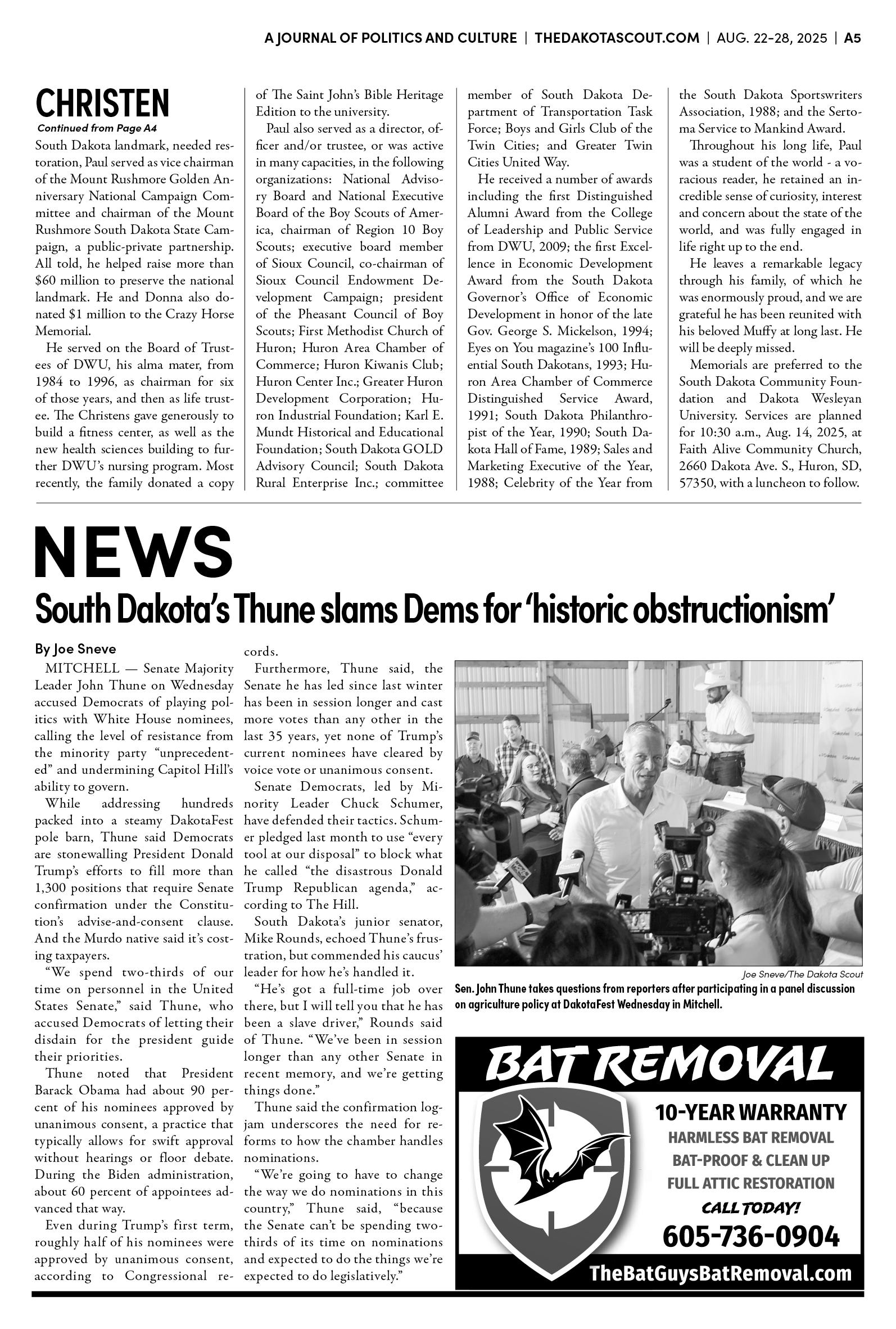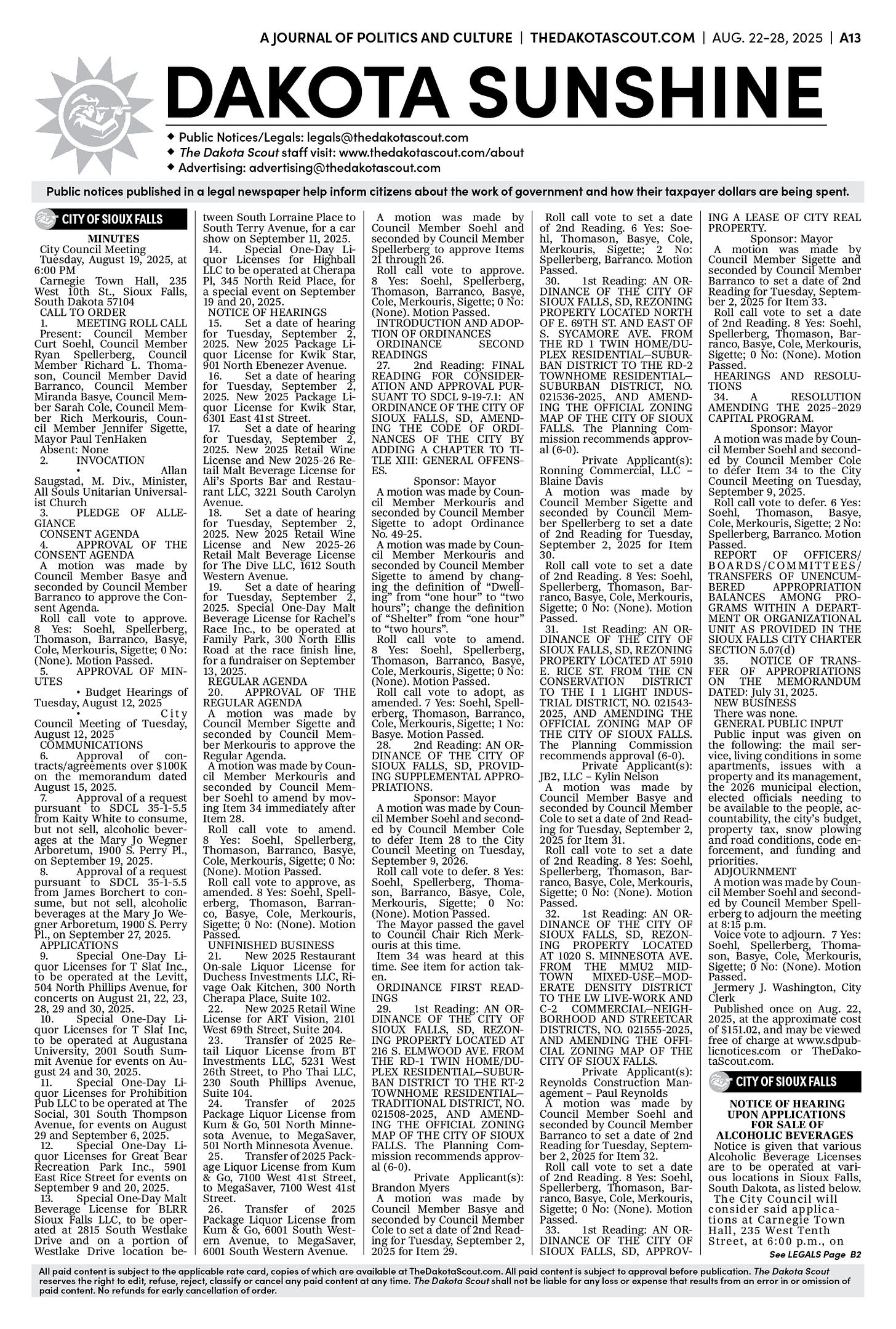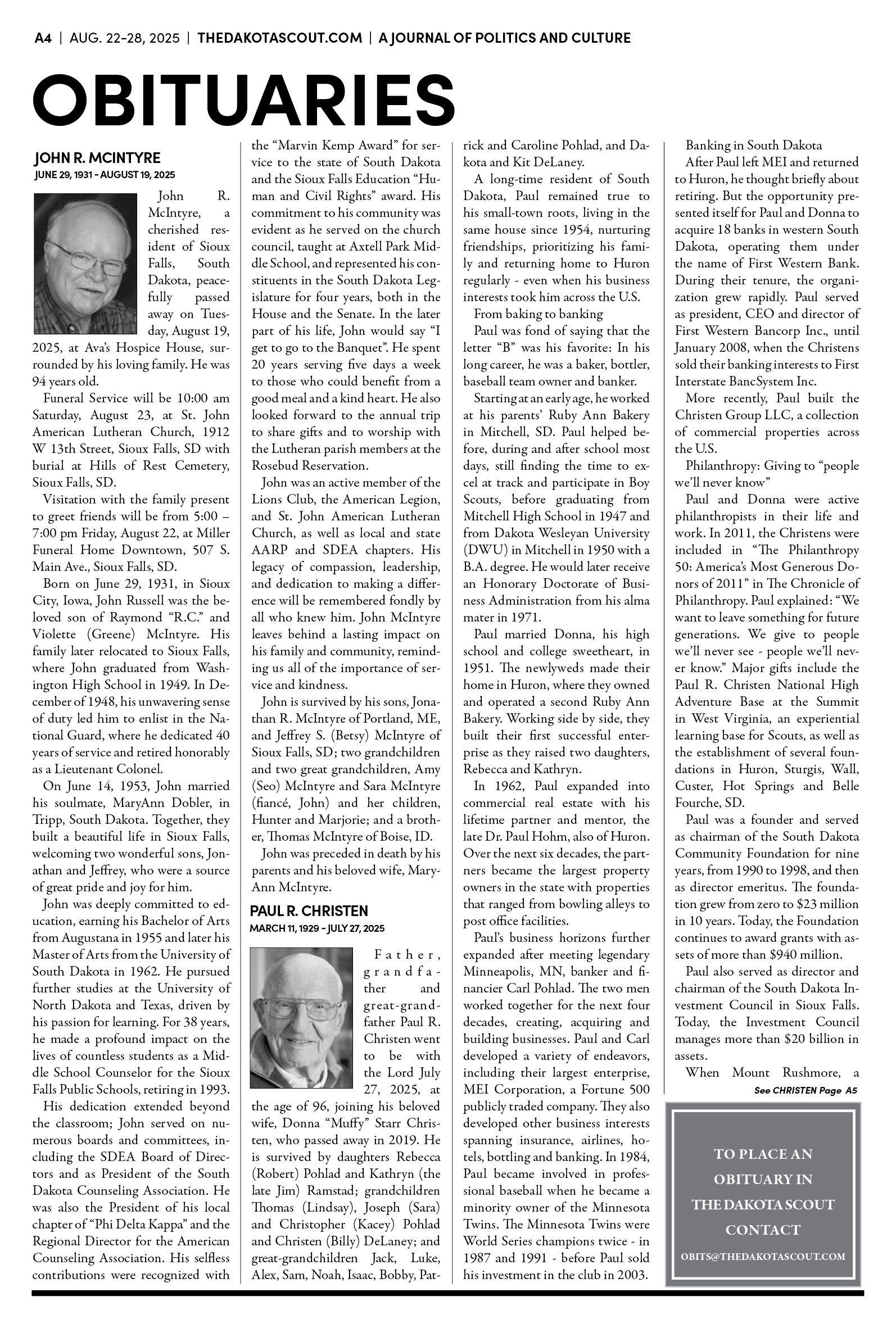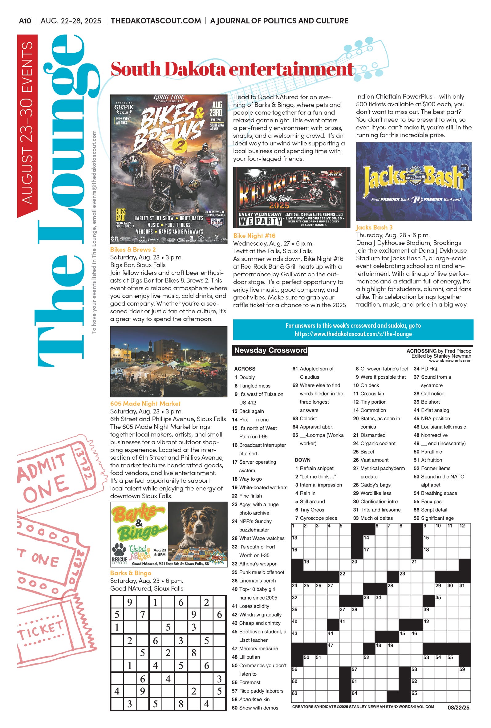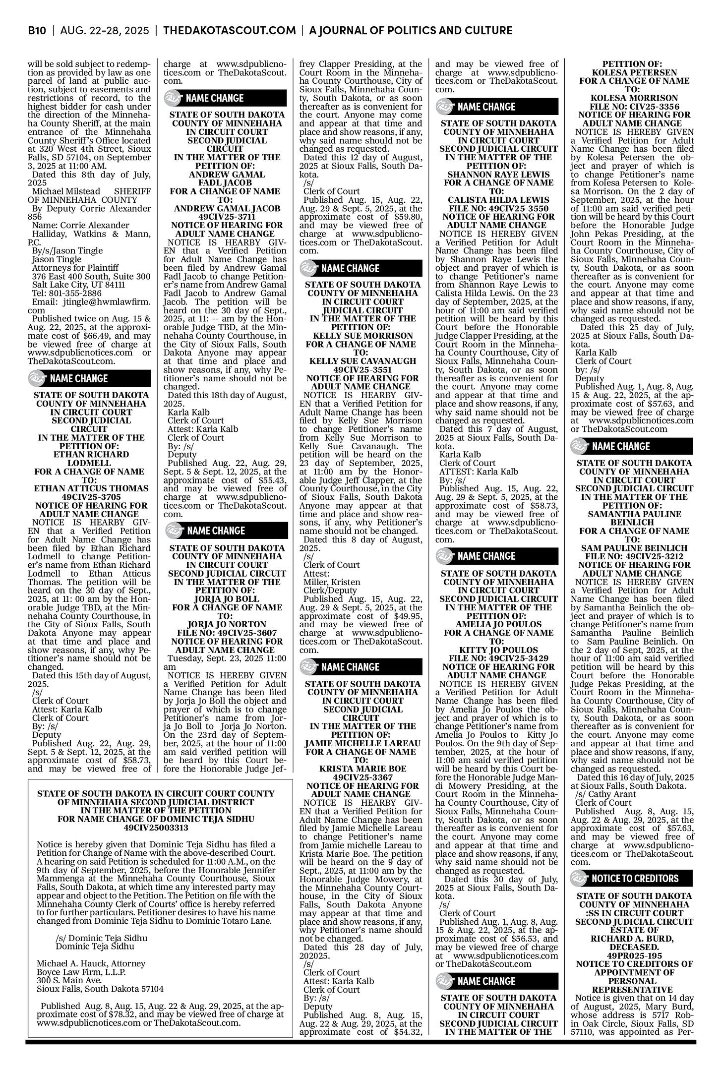 FREE TO READThe Dakota Scout E-editionVol. 2 No. 52 | Aug. 22 - 28, 2025The Dakota ScoutAug 25, 20253ShareThe Dakota Scout is reader-supported. To receive new posts and support our work, consider becoming a paid subscriber.SubscribeTo place an obituary, email obits@thedakotascout.com SiouxFalls.BusinessLegals & Public Notices: August 22, 2025Aug 22Read full storySports content courtesy SiouxFallsLive.comPreviousNext