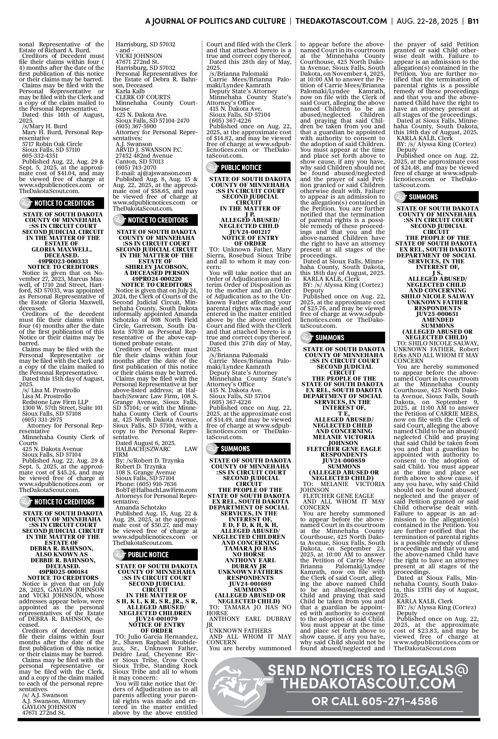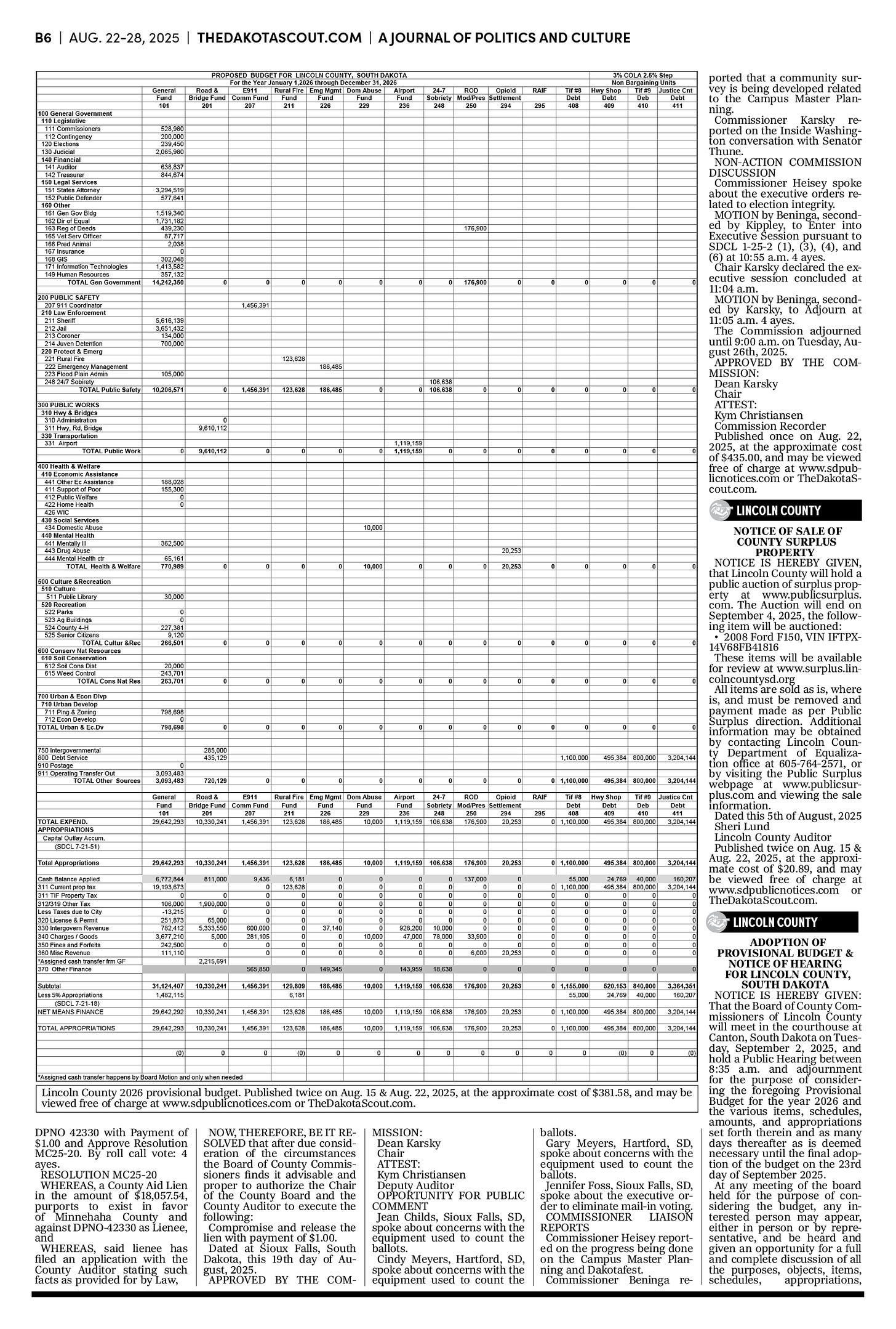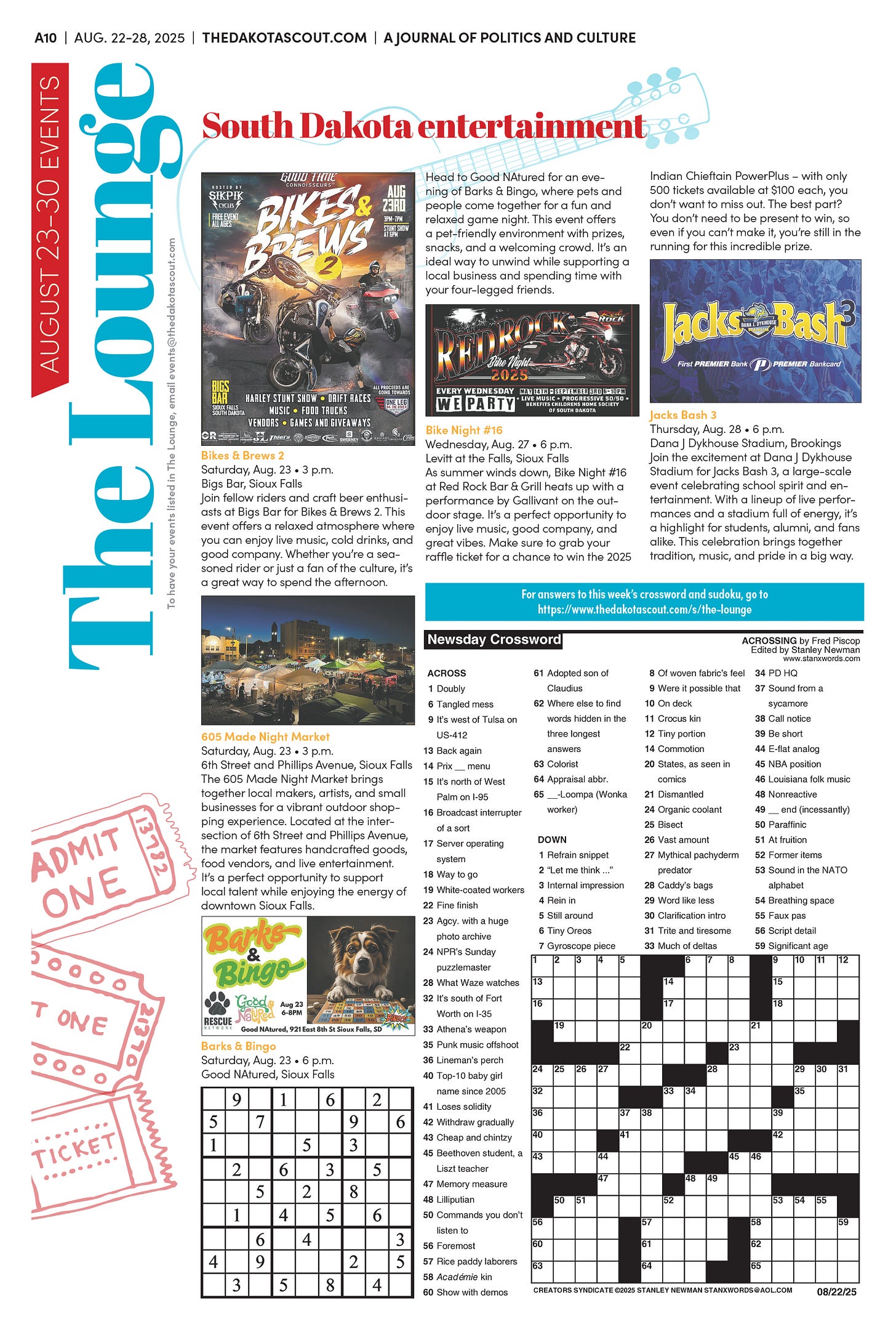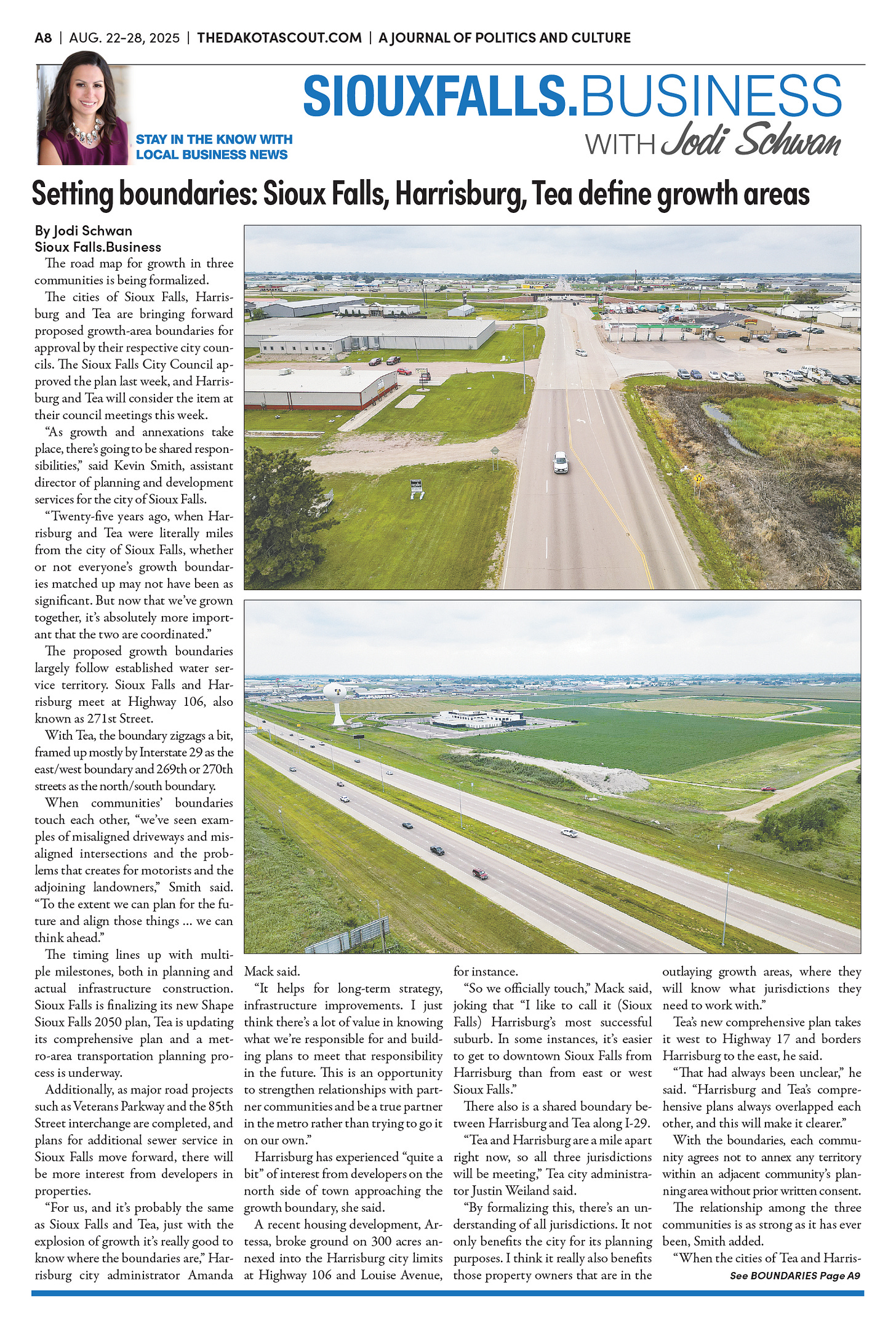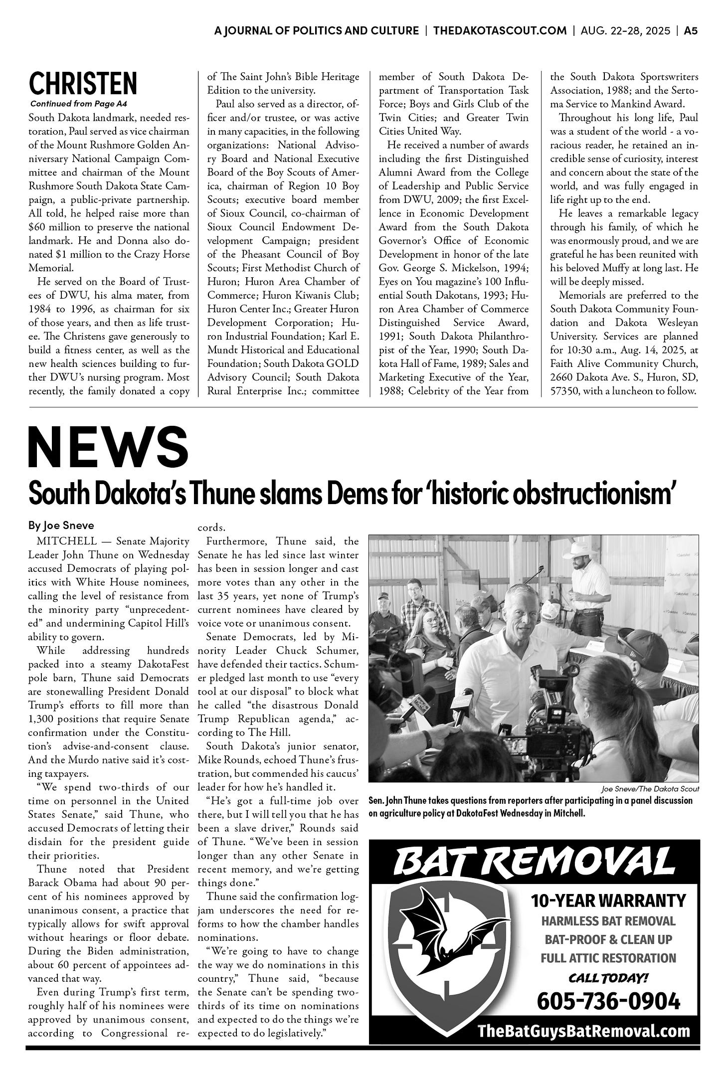 FREE TO READThe Dakota Scout E-editionVol. 2 No. 52 | Aug. 22 - 28, 2025The Dakota ScoutAug 25, 20253ShareThe Dakota Scout is reader-supported. To receive new posts and support our work, consider becoming a paid subscriber.SubscribeTo place an obituary, email obits@thedakotascout.com SiouxFalls.BusinessLegals & Public Notices: August 22, 2025Aug 22Read full storySports content courtesy SiouxFallsLive.comPreviousNext
