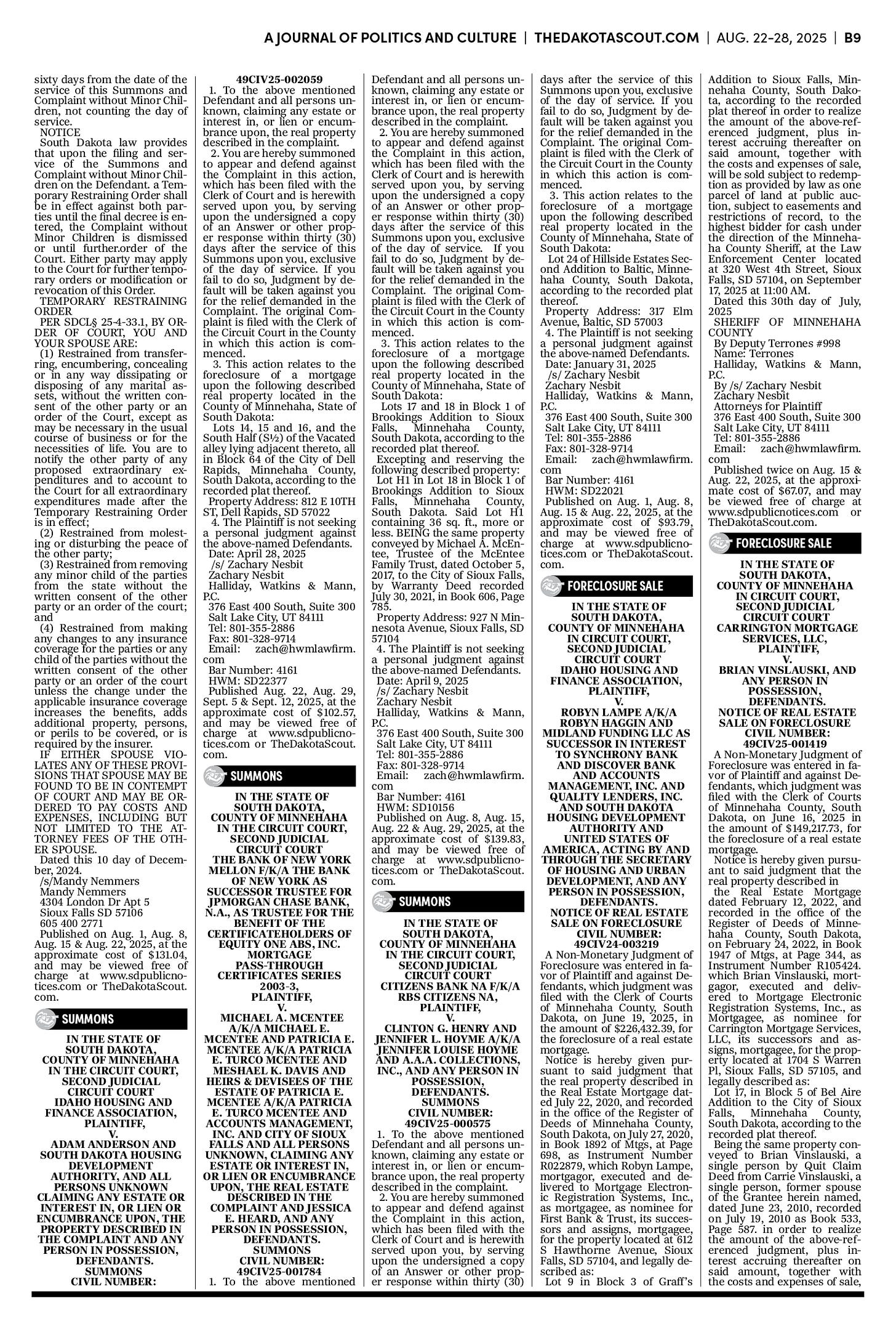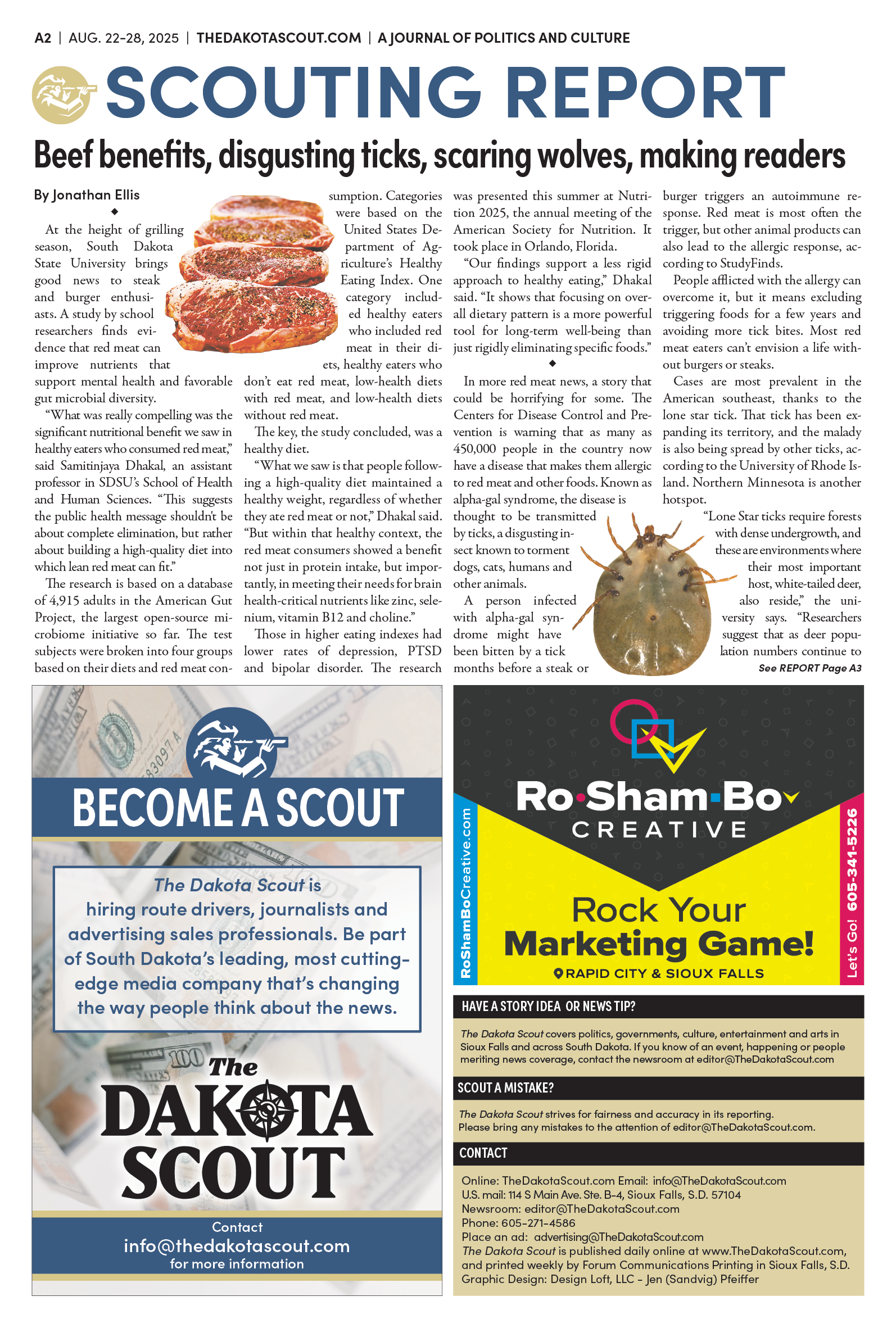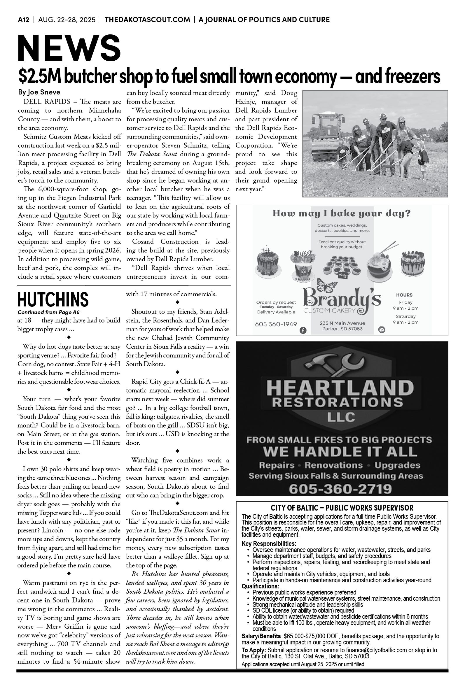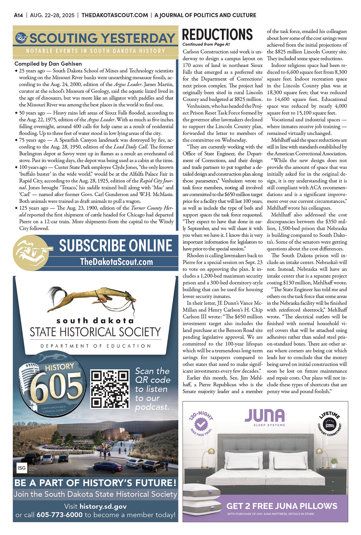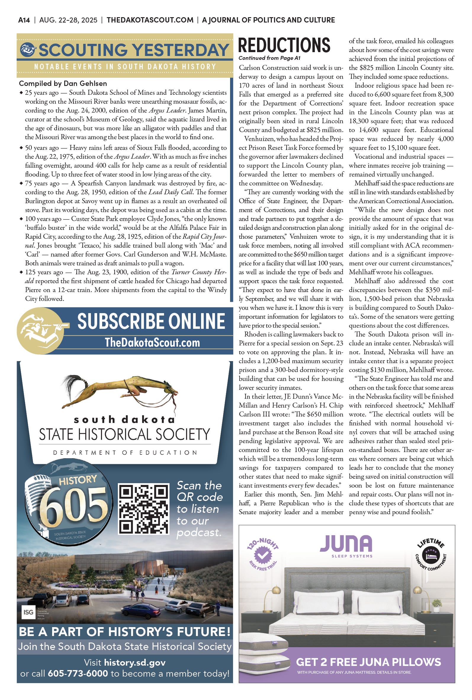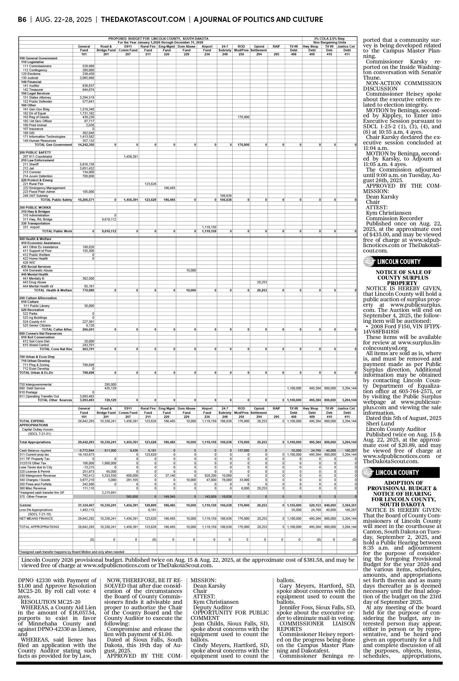 FREE TO READThe Dakota Scout E-editionVol. 2 No. 52 | Aug. 22 - 28, 2025The Dakota ScoutAug 25, 20253ShareThe Dakota Scout is reader-supported. To receive new posts and support our work, consider becoming a paid subscriber.SubscribeTo place an obituary, email obits@thedakotascout.com SiouxFalls.BusinessLegals & Public Notices: August 22, 2025Aug 22Read full storySports content courtesy SiouxFallsLive.comPreviousNext