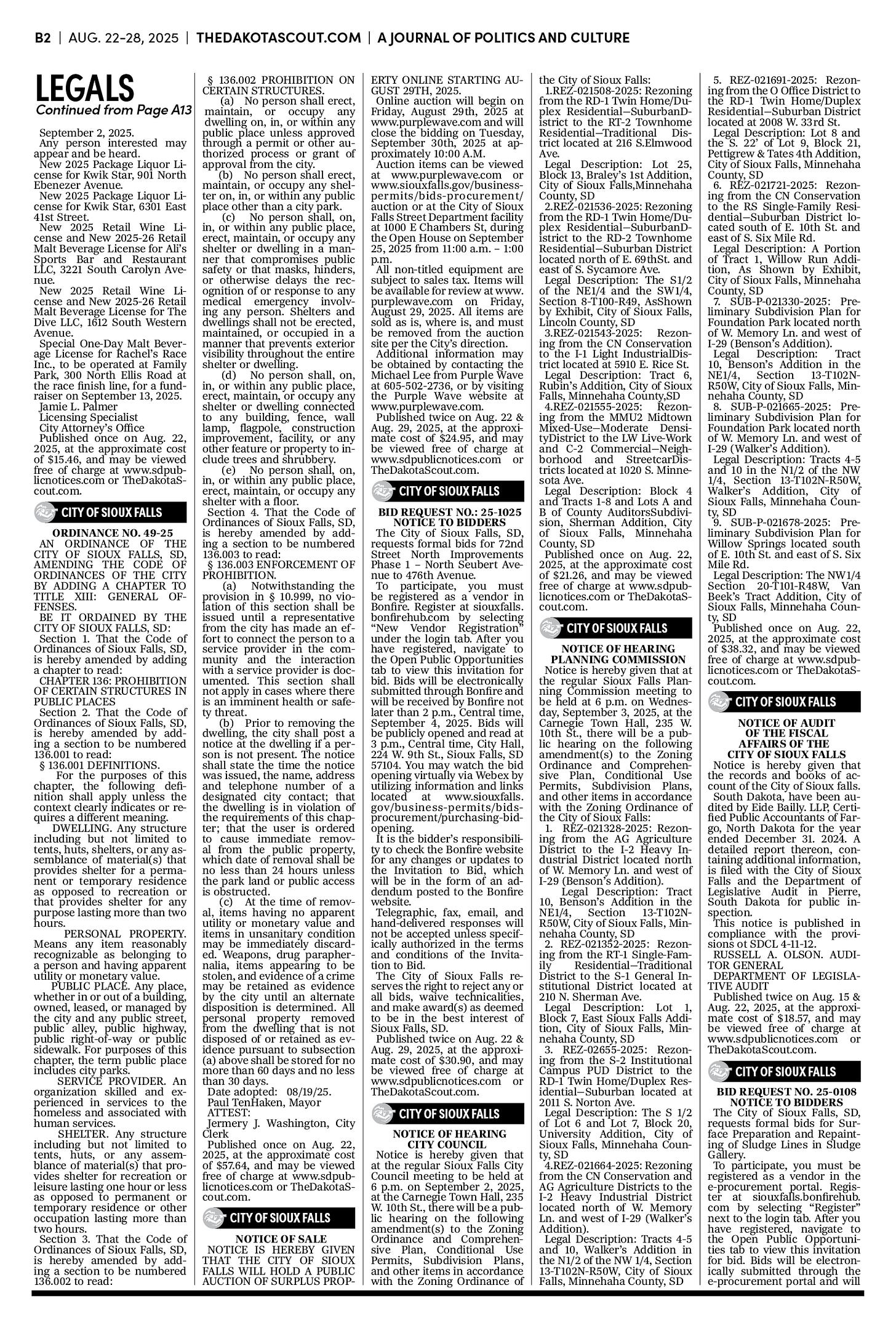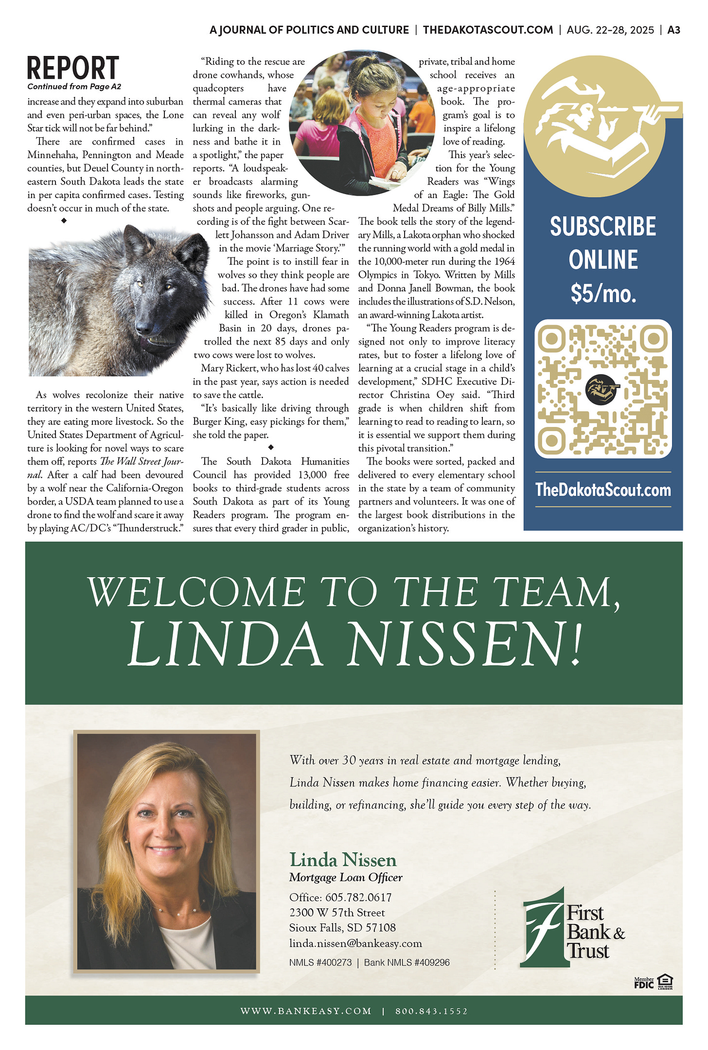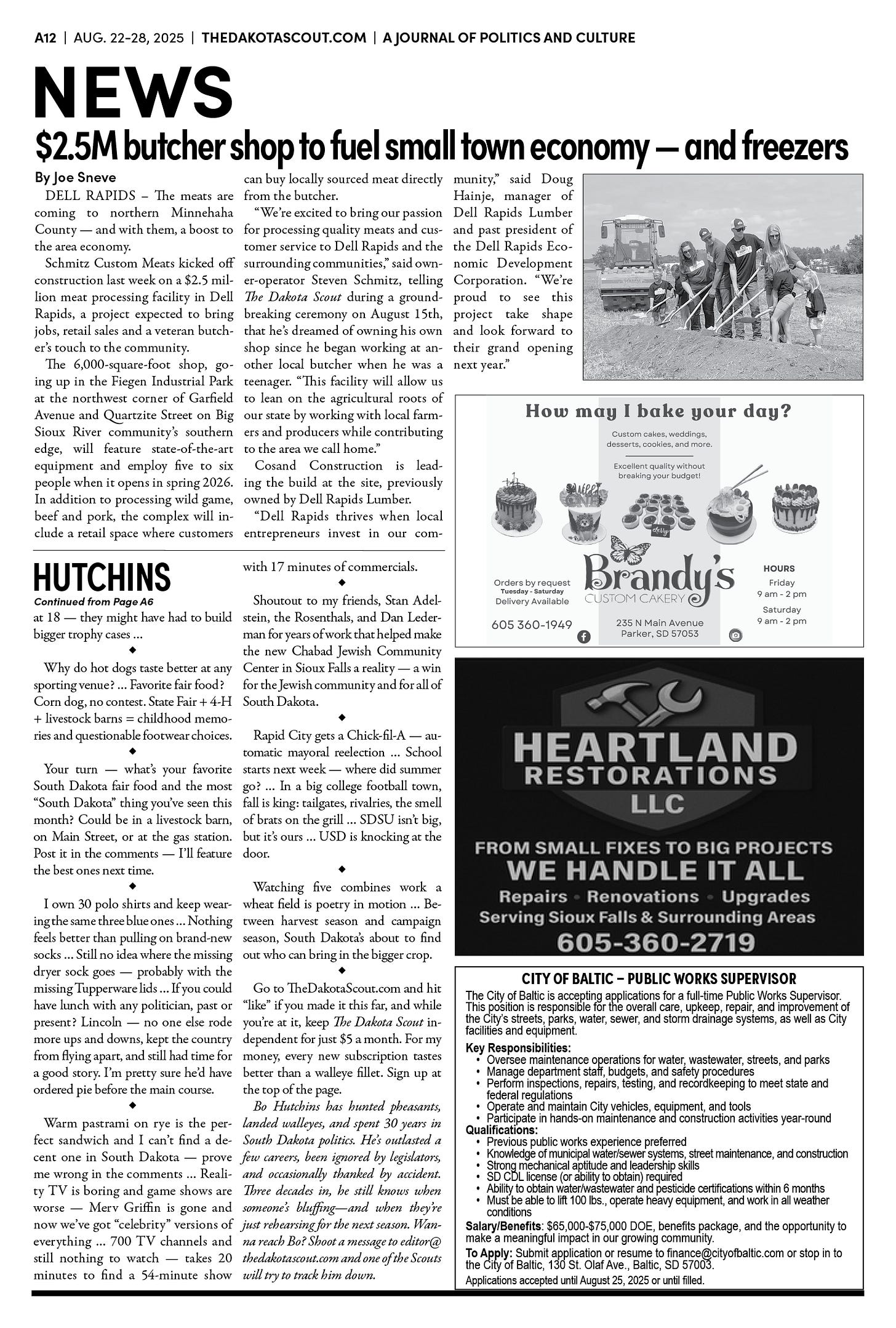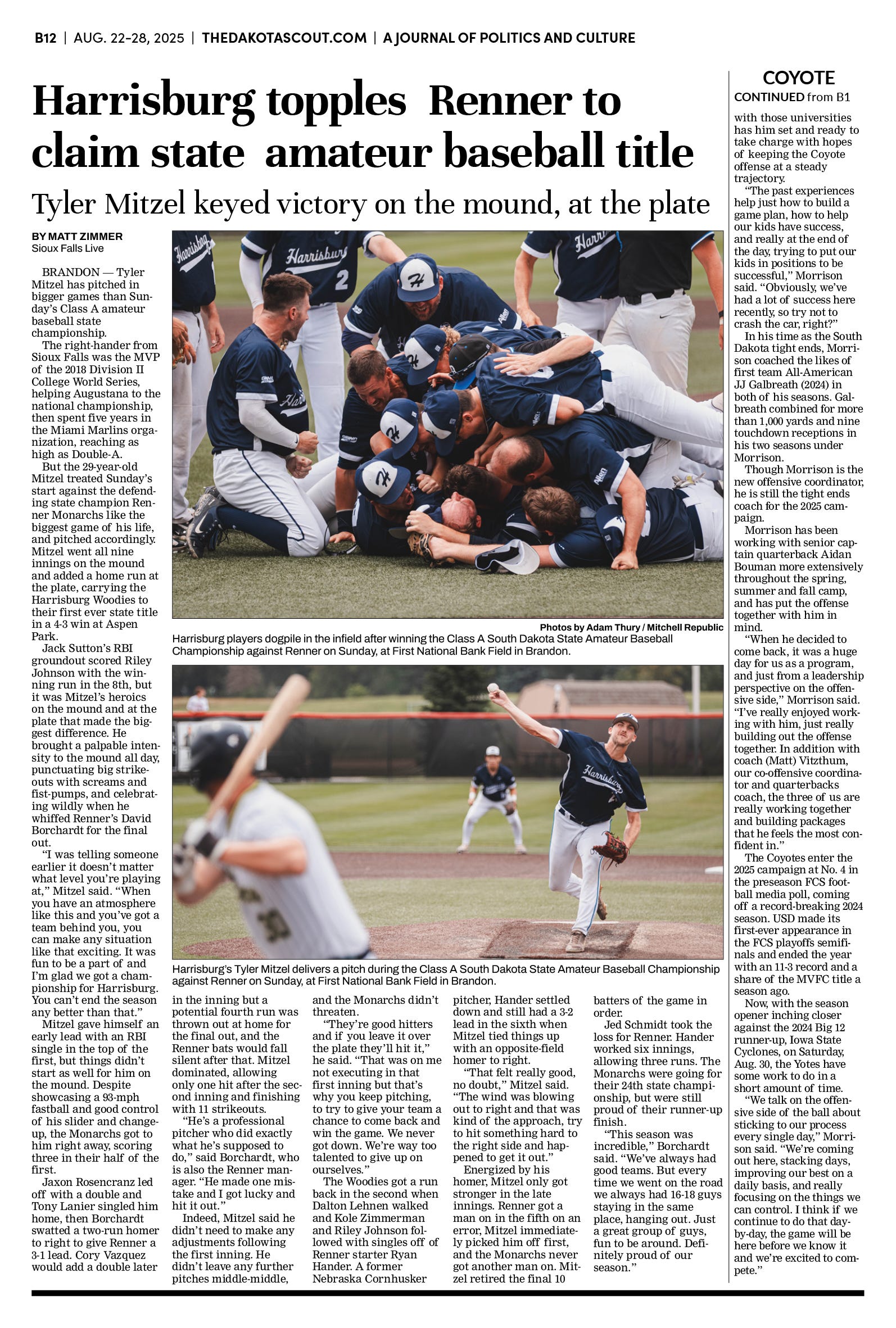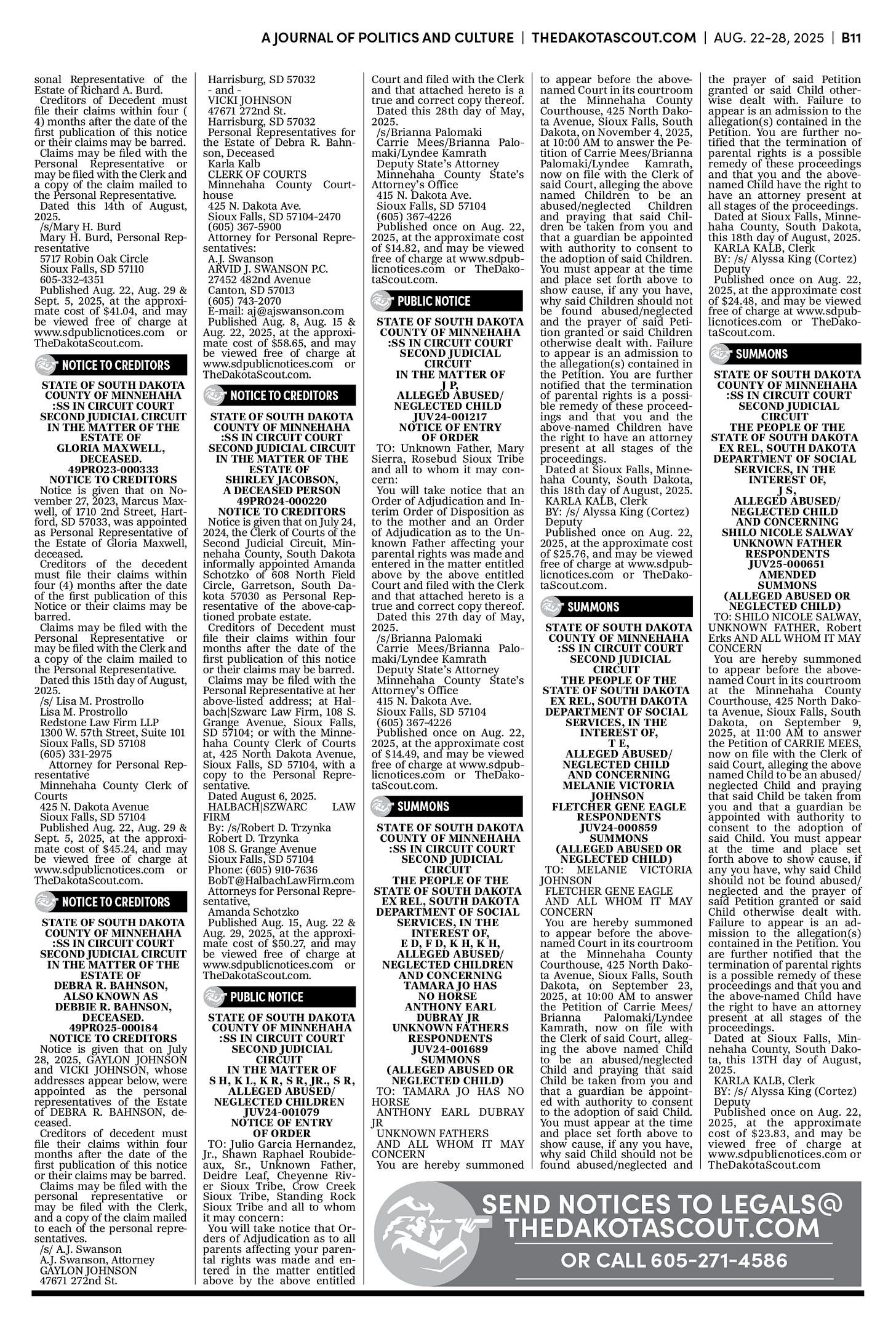 FREE TO READThe Dakota Scout E-editionVol. 2 No. 52 | Aug. 22 - 28, 2025The Dakota ScoutAug 25, 20253ShareThe Dakota Scout is reader-supported. To receive new posts and support our work, consider becoming a paid subscriber.SubscribeTo place an obituary, email obits@thedakotascout.com SiouxFalls.BusinessLegals & Public Notices: August 22, 2025Aug 22Read full storySports content courtesy SiouxFallsLive.comPreviousNext