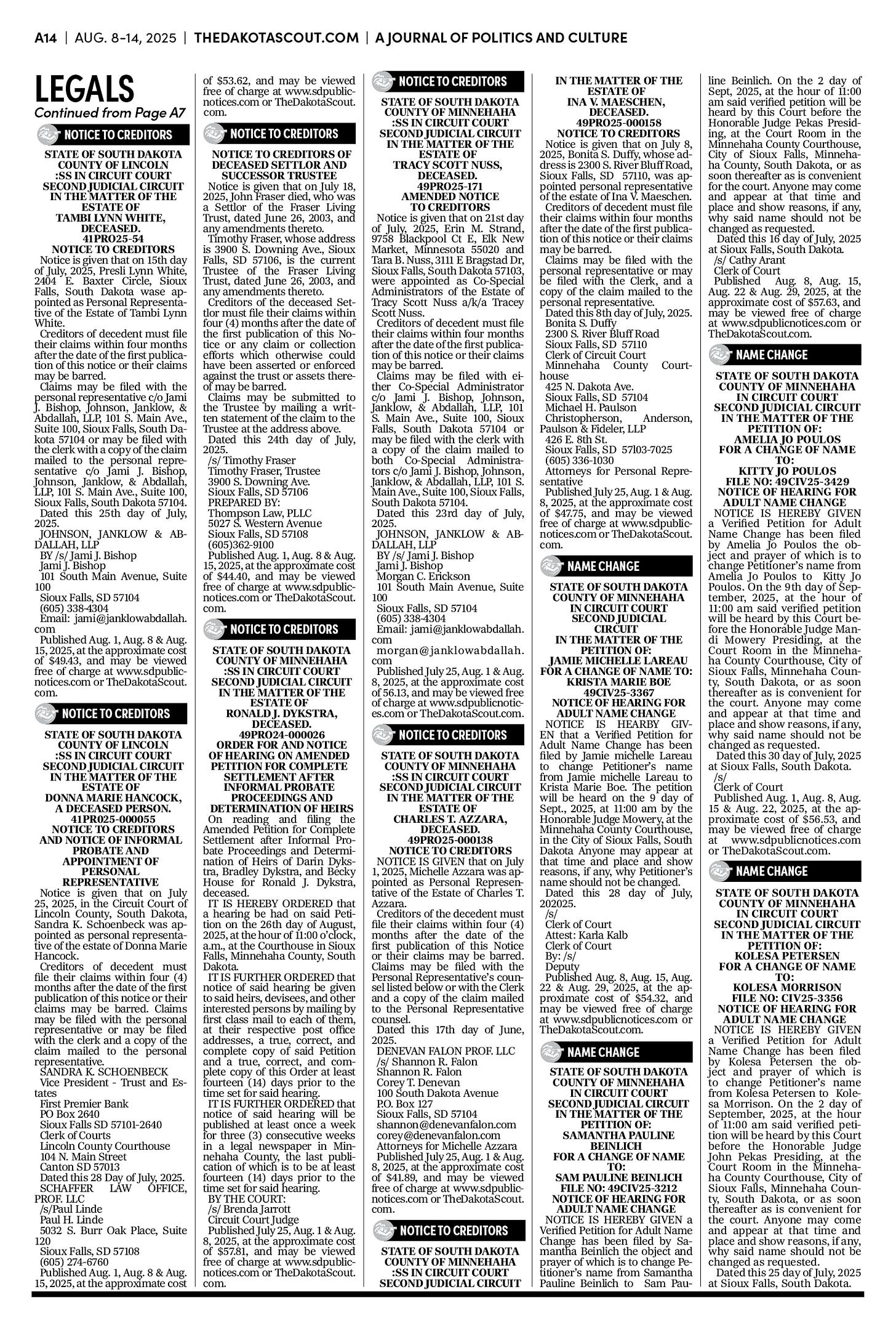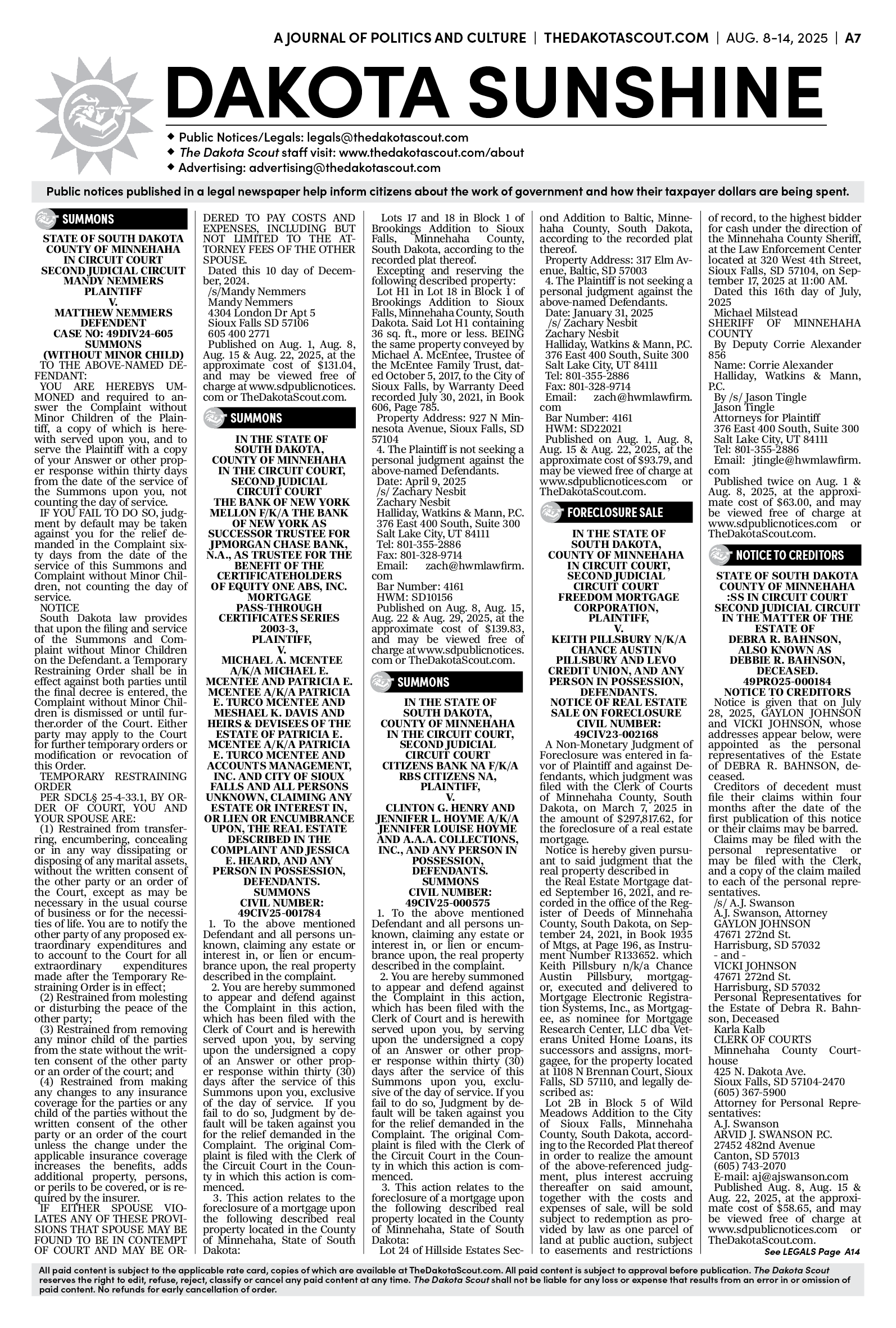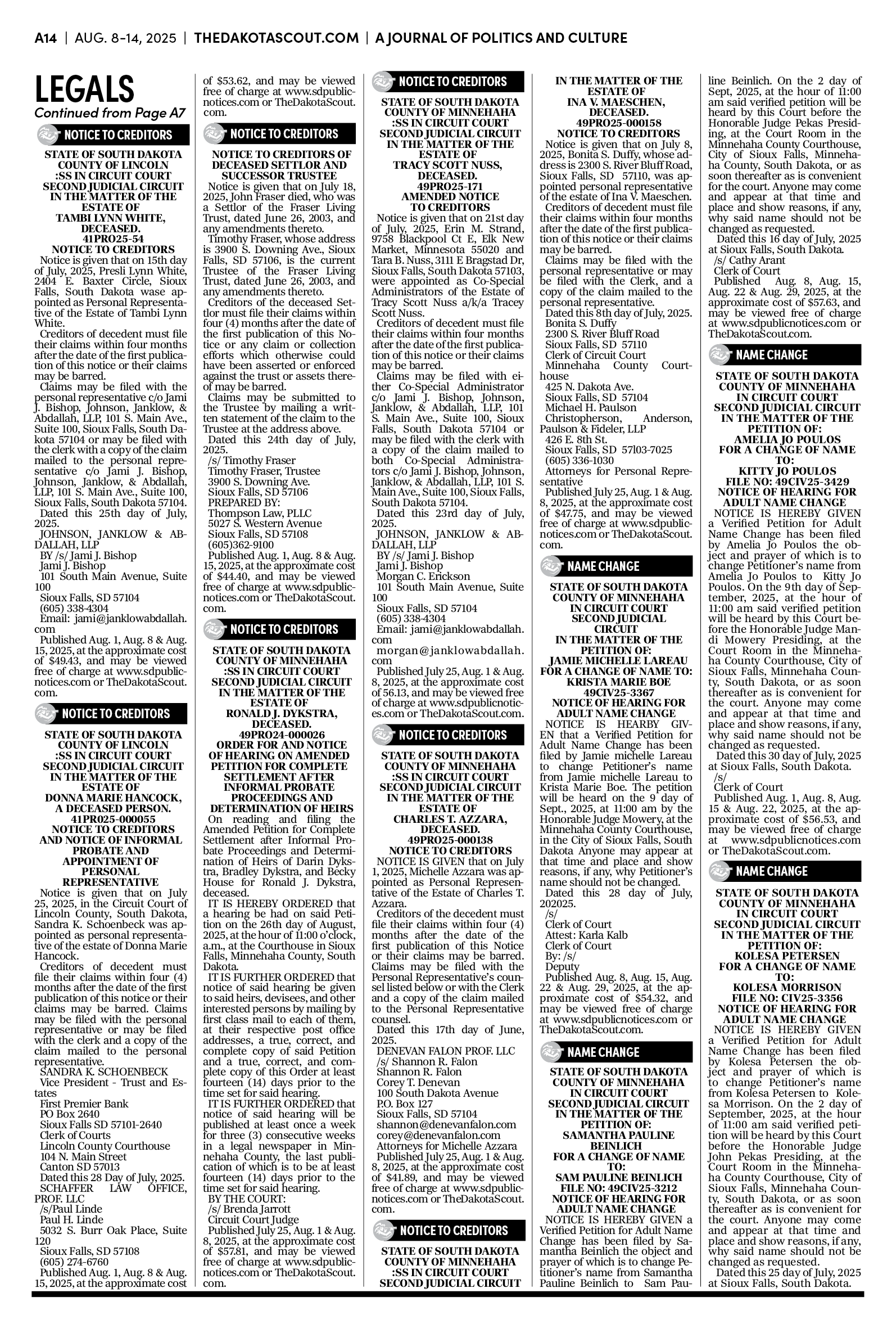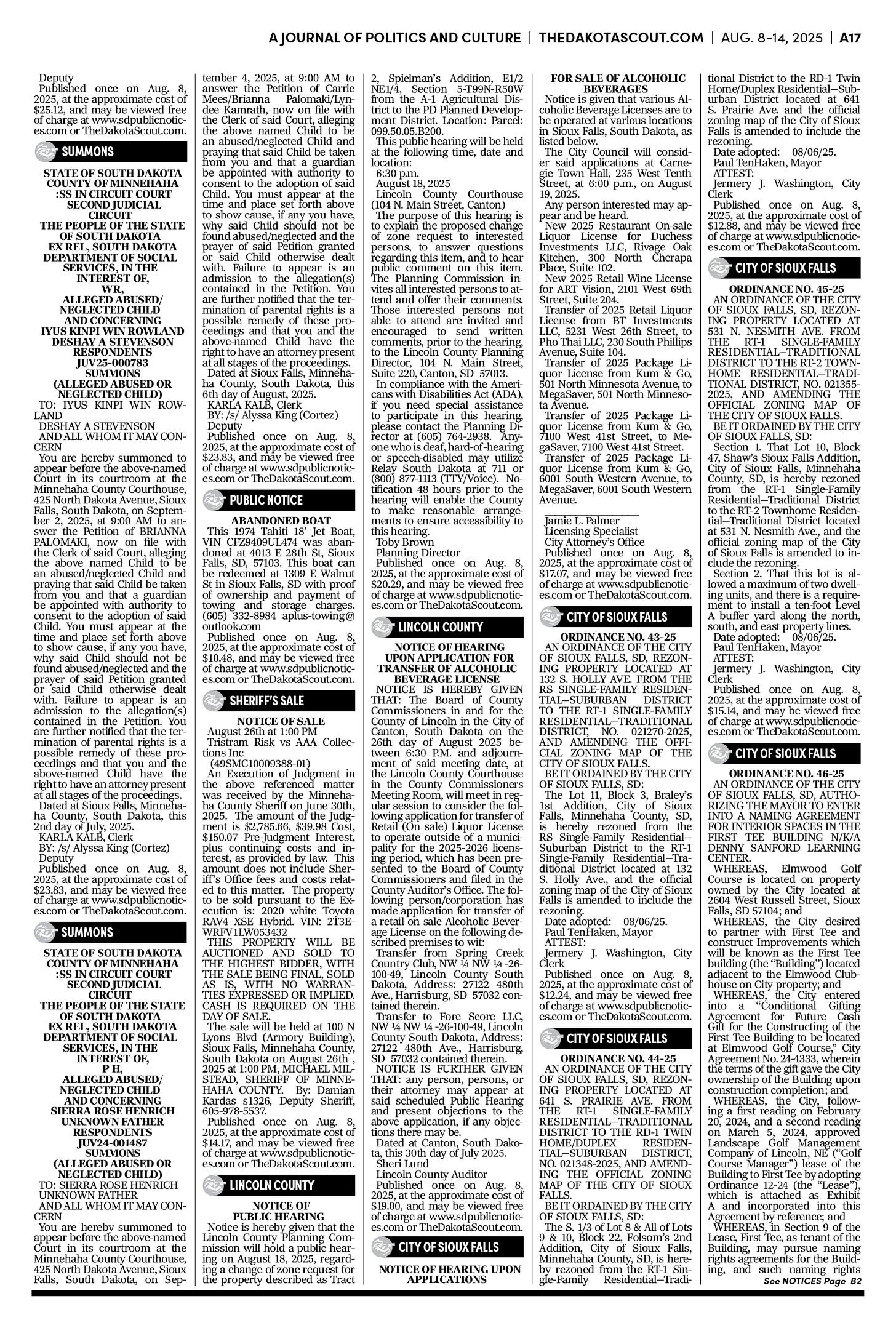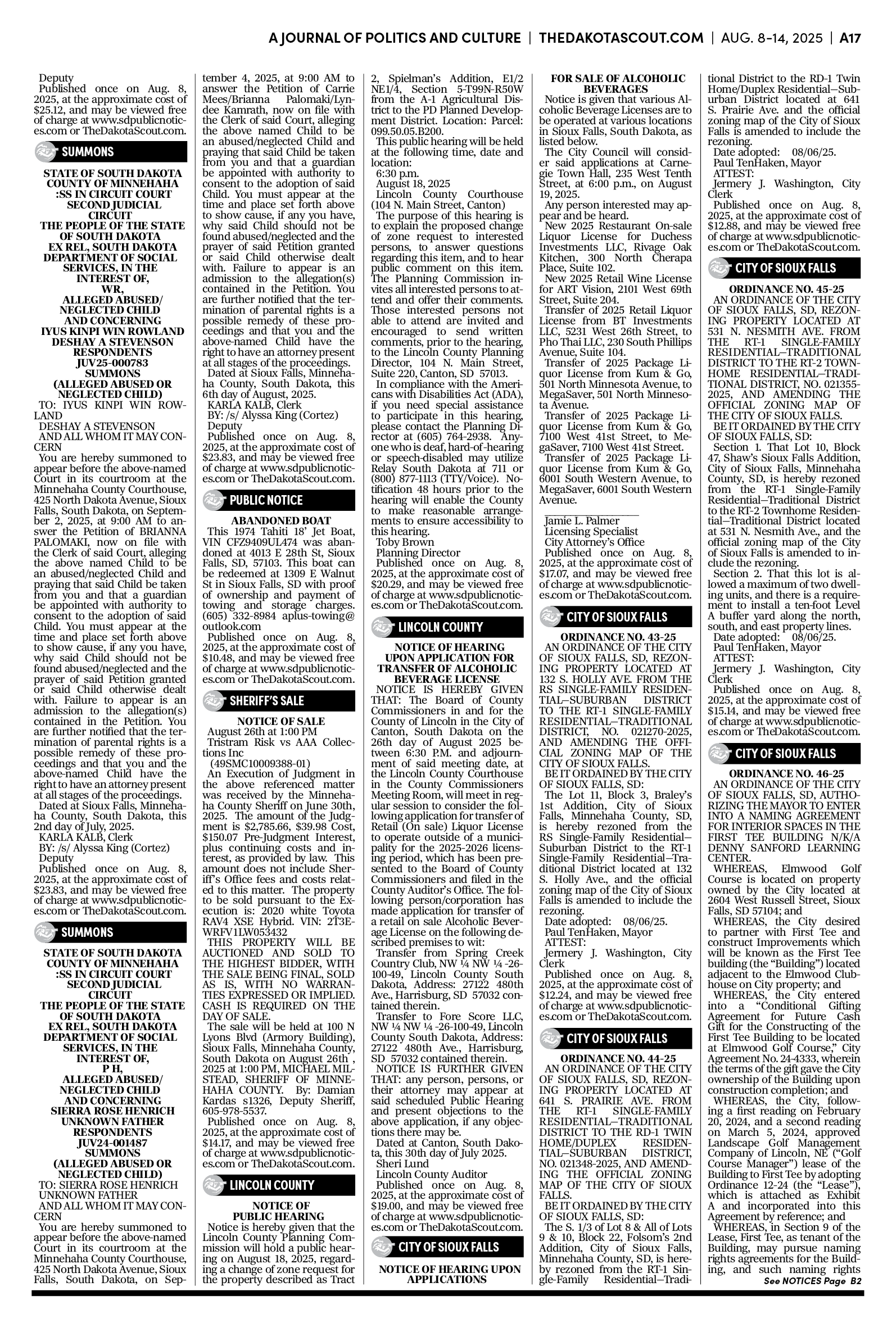 FREE TO READThe Dakota Scout e-editionVol. 2 No. 50 | Aug. 8-14, 2025The Dakota ScoutAug 11, 20256ShareThe Dakota Scout is reader-supported. To receive new posts and support our work, consider becoming a free or paid subscriber.SubscribeTo place an obituary, email obits@thedakotascout.comLegals & Public Notices: August 8, 2025Aug 8Read full storyBusiness content courtesy SiouxFalls.BusinessSports content courtesy SiouxFallsLive.comPreviousNext
