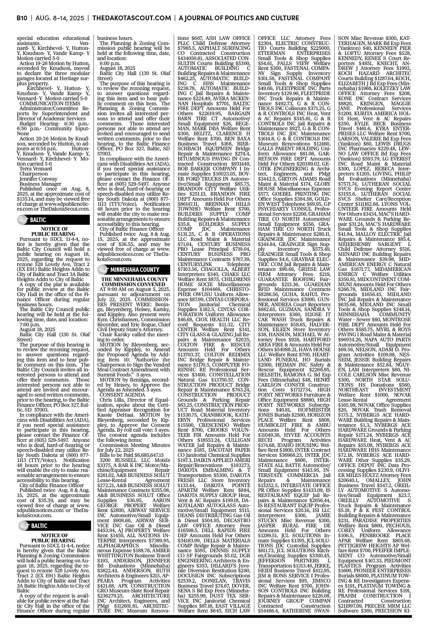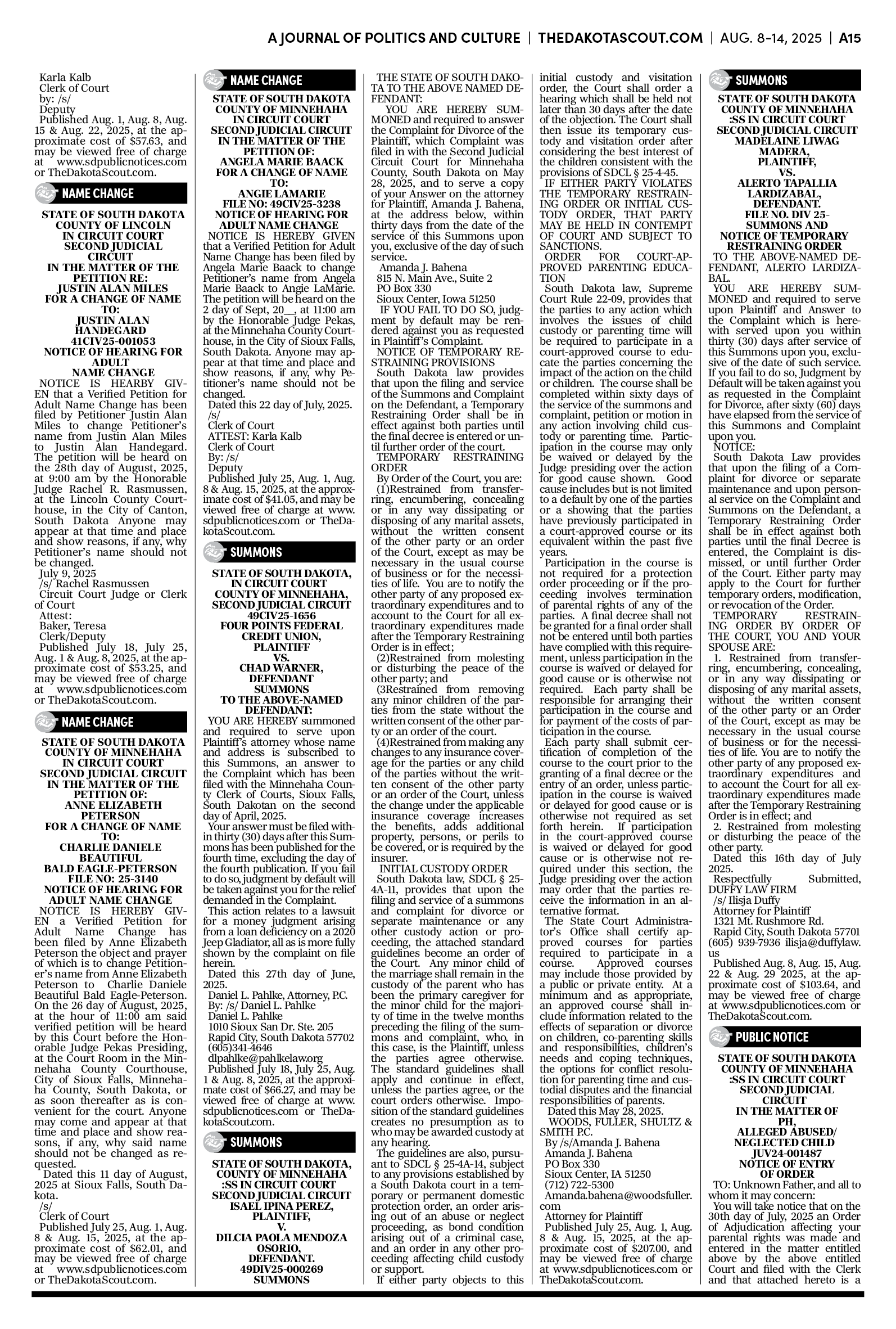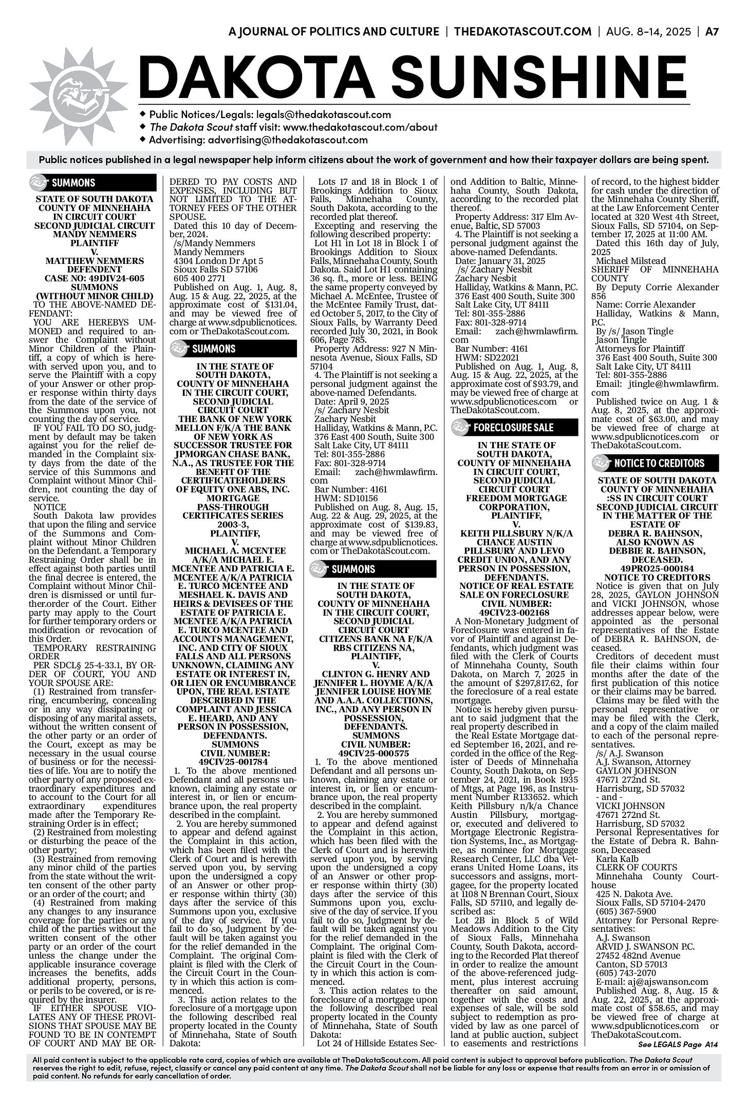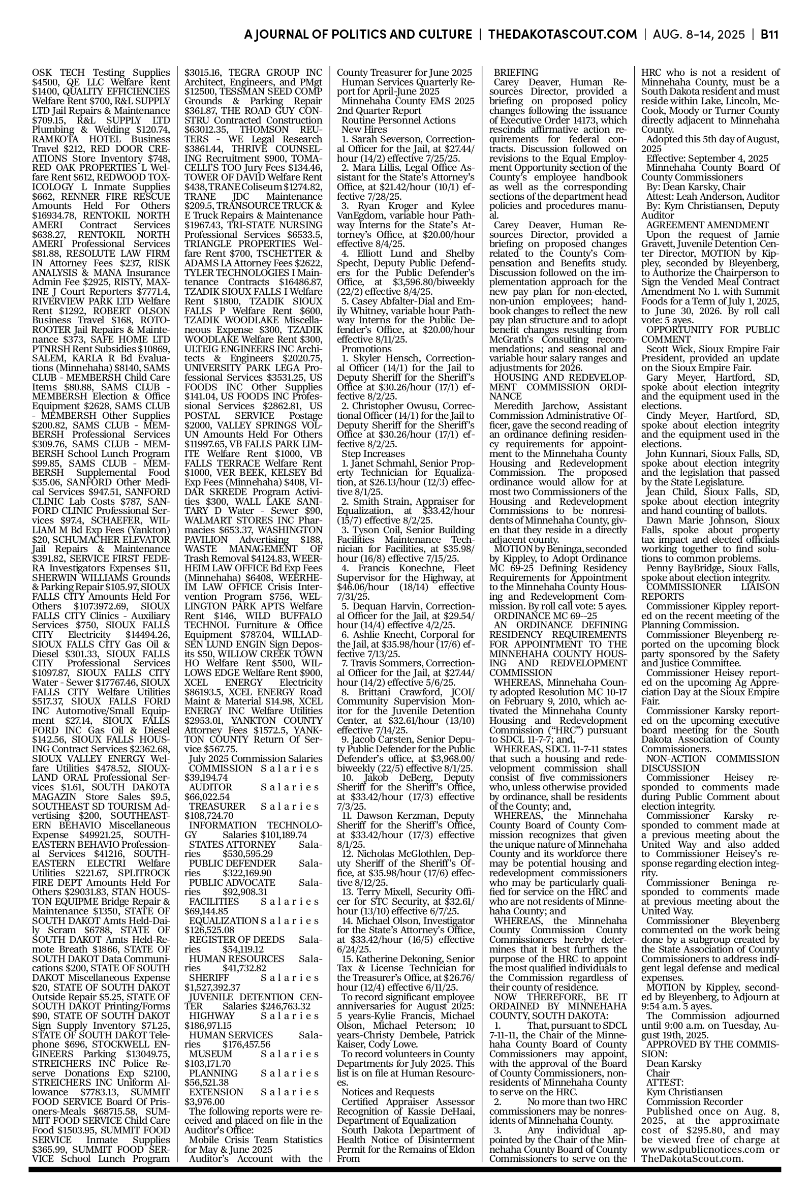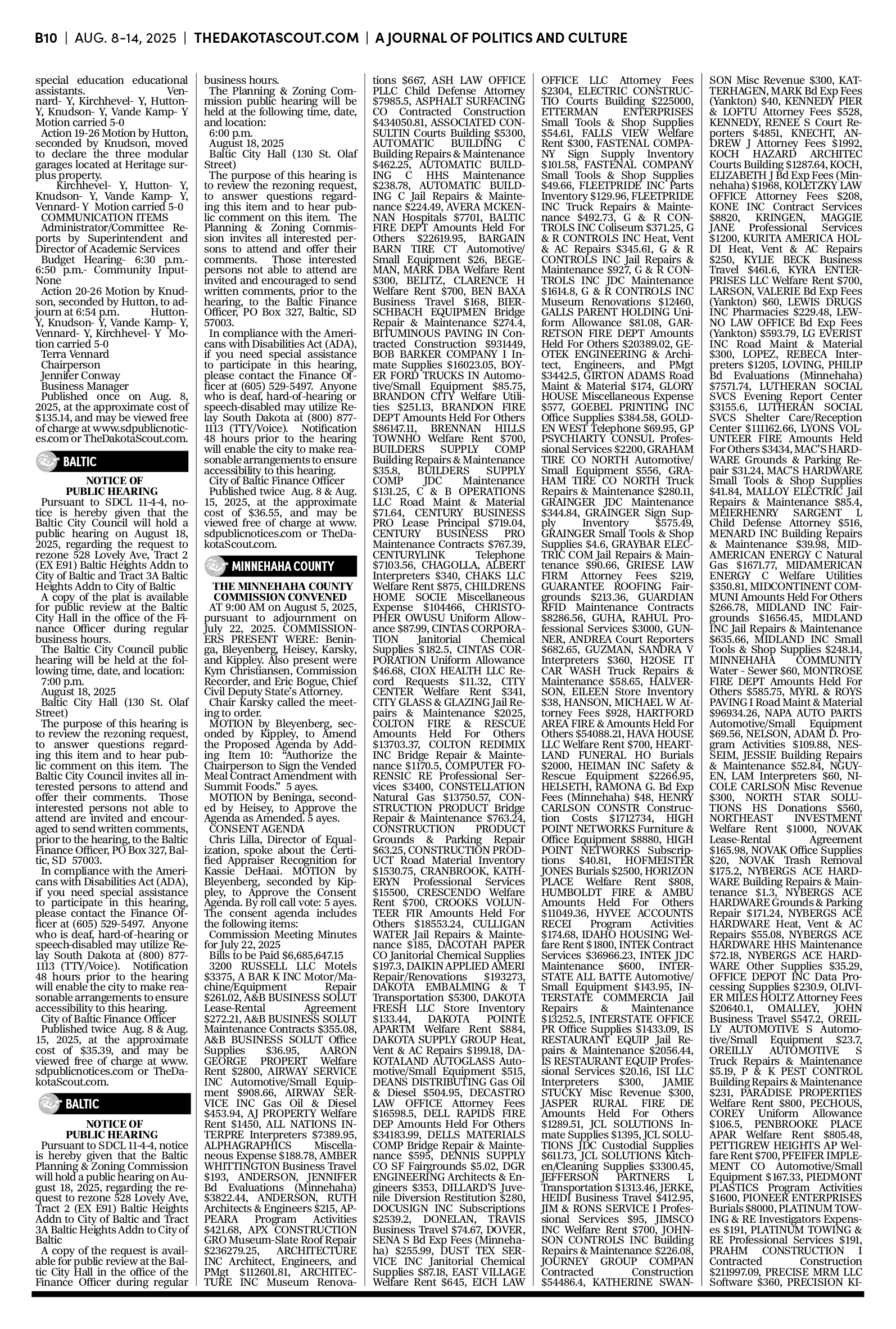 FREE TO READThe Dakota Scout e-editionVol. 2 No. 50 | Aug. 8-14, 2025The Dakota ScoutAug 11, 20256ShareThe Dakota Scout is reader-supported. To receive new posts and support our work, consider becoming a free or paid subscriber.SubscribeTo place an obituary, email obits@thedakotascout.comLegals & Public Notices: August 8, 2025Aug 8Read full storyBusiness content courtesy SiouxFalls.BusinessSports content courtesy SiouxFallsLive.comPreviousNext