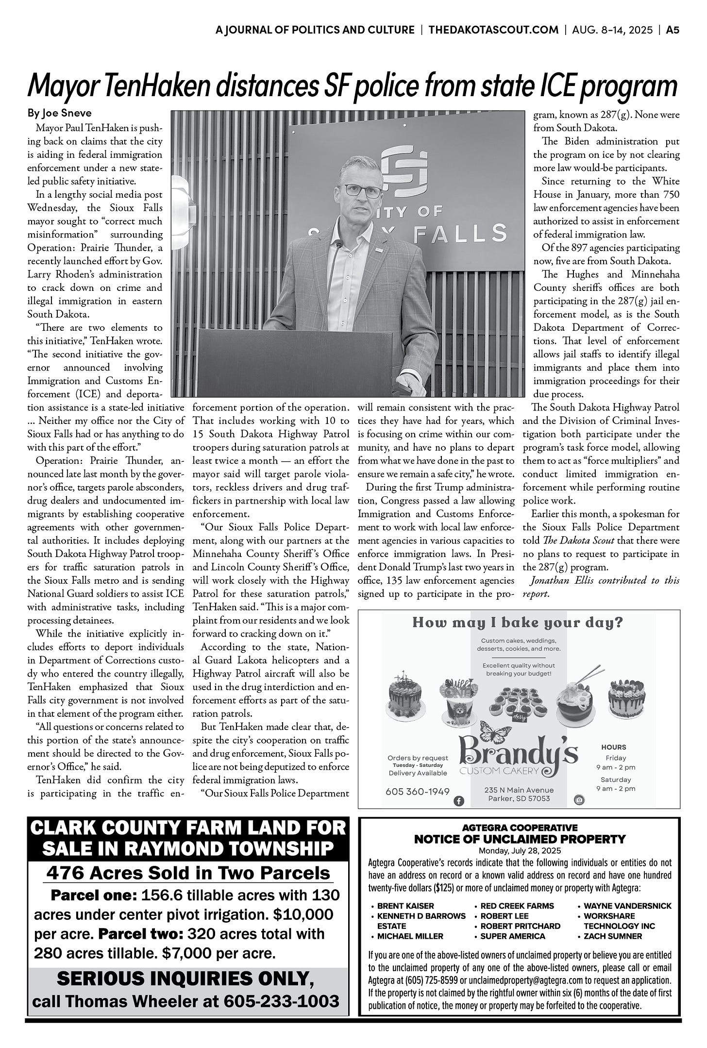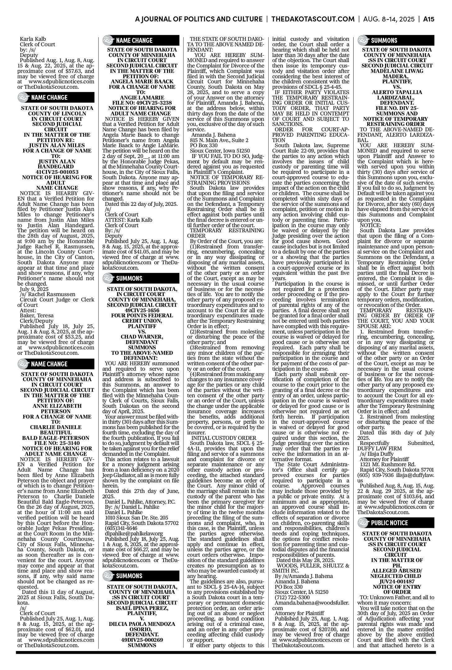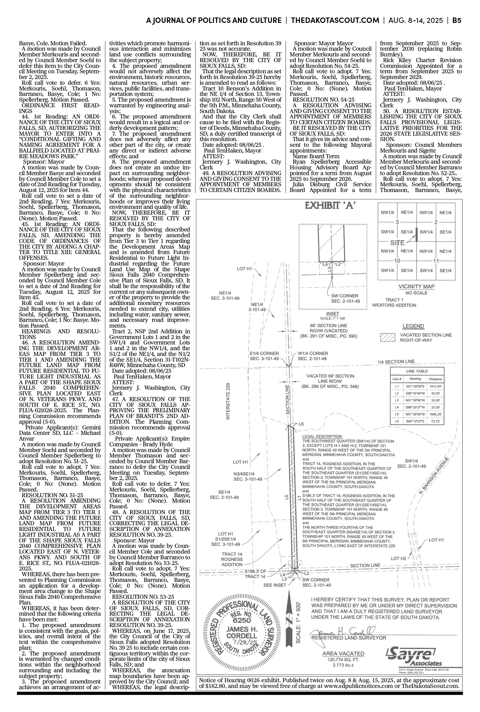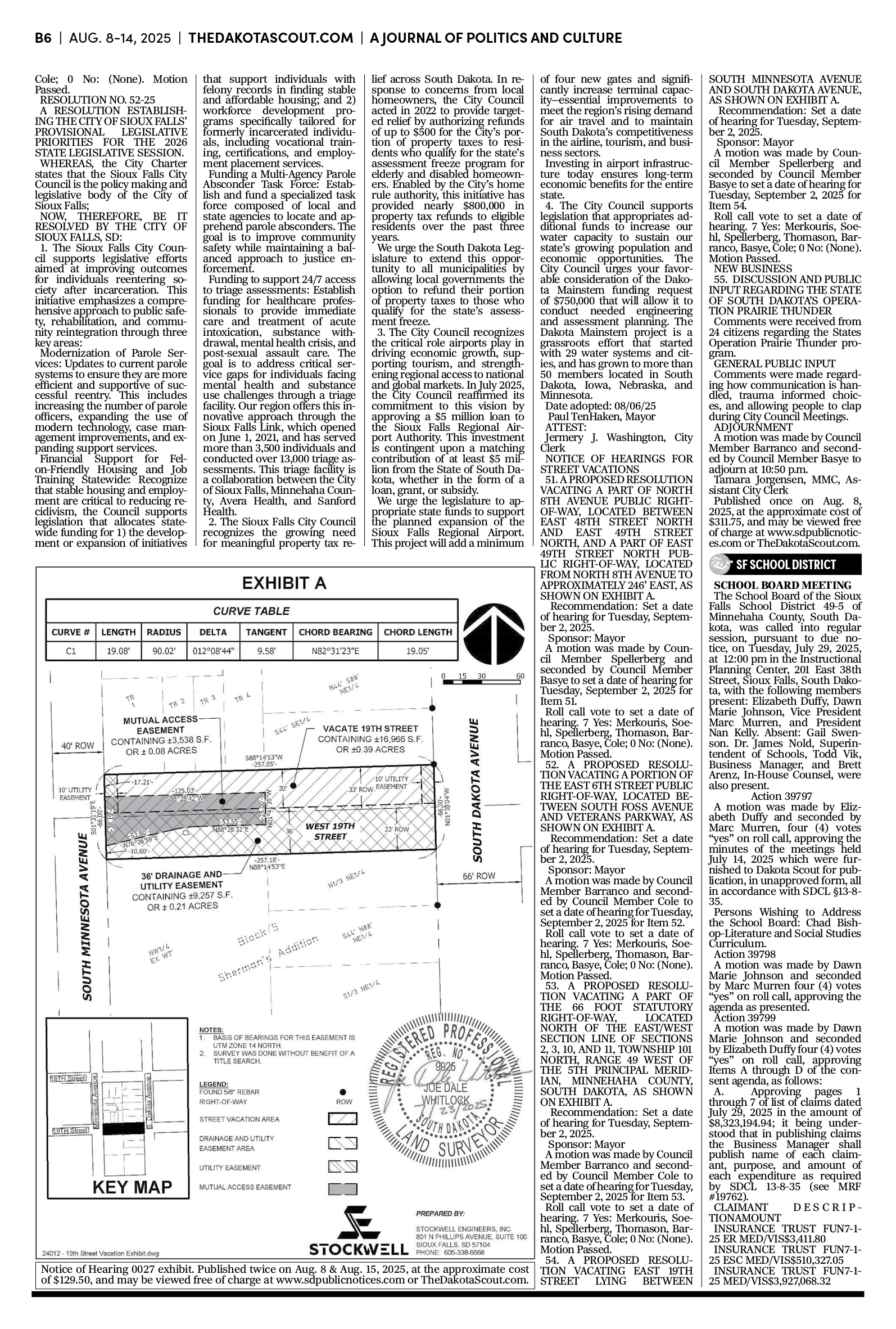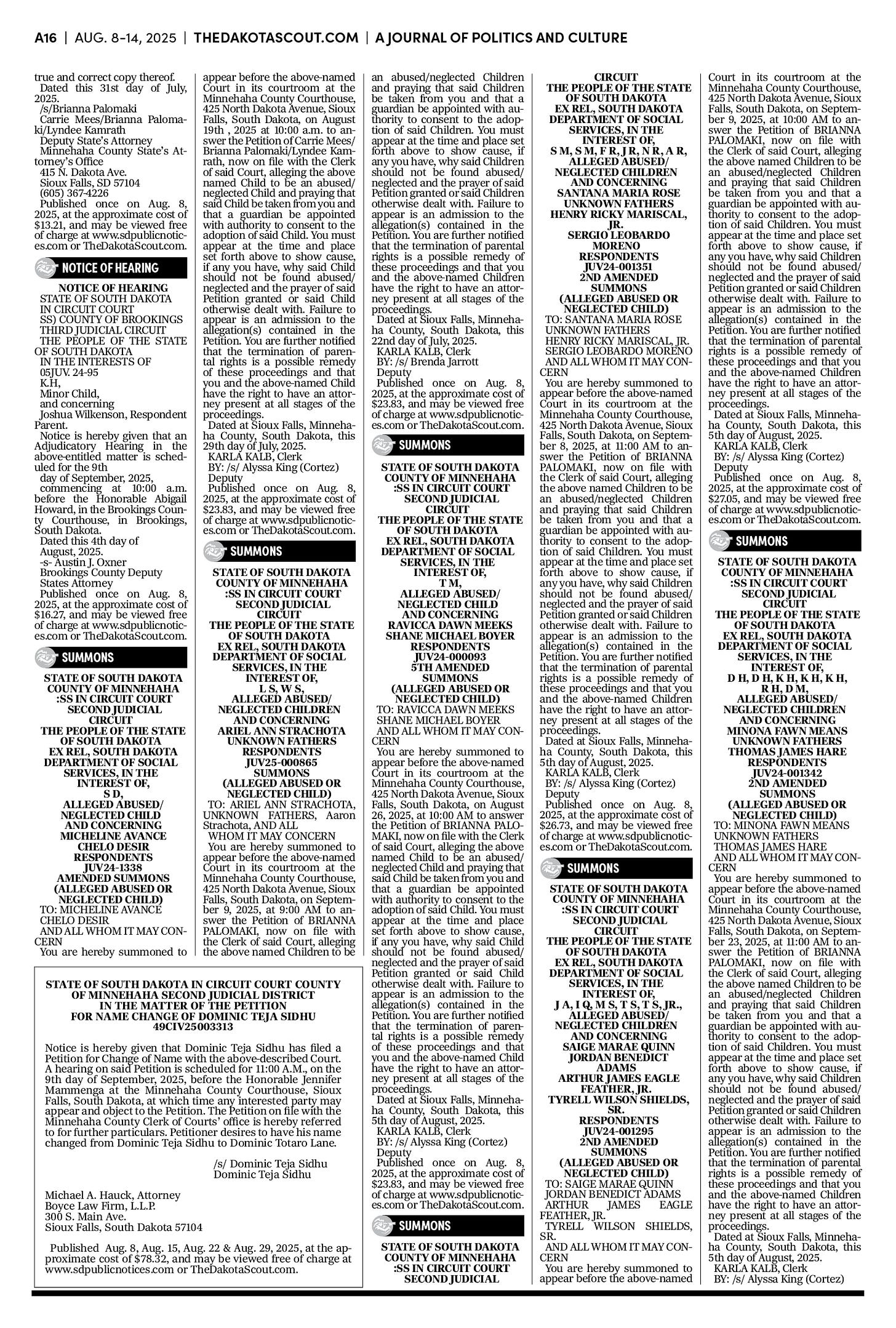 FREE TO READThe Dakota Scout e-editionVol. 2 No. 50 | Aug. 8-14, 2025The Dakota ScoutAug 11, 20256ShareThe Dakota Scout is reader-supported. To receive new posts and support our work, consider becoming a free or paid subscriber.SubscribeTo place an obituary, email obits@thedakotascout.comLegals & Public Notices: August 8, 2025Aug 8Read full storyBusiness content courtesy SiouxFalls.BusinessSports content courtesy SiouxFallsLive.comPreviousNext