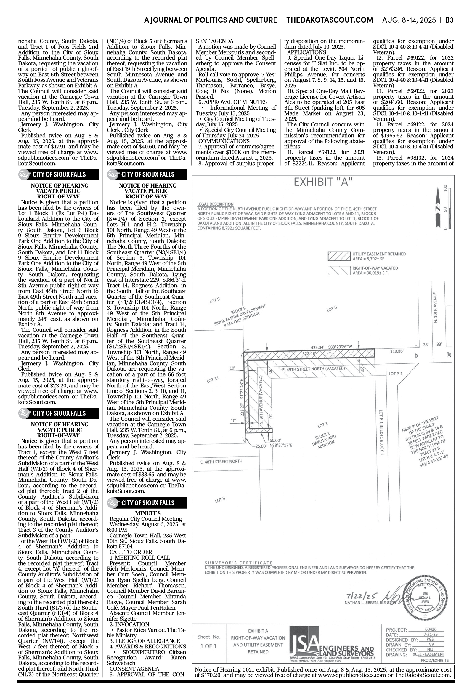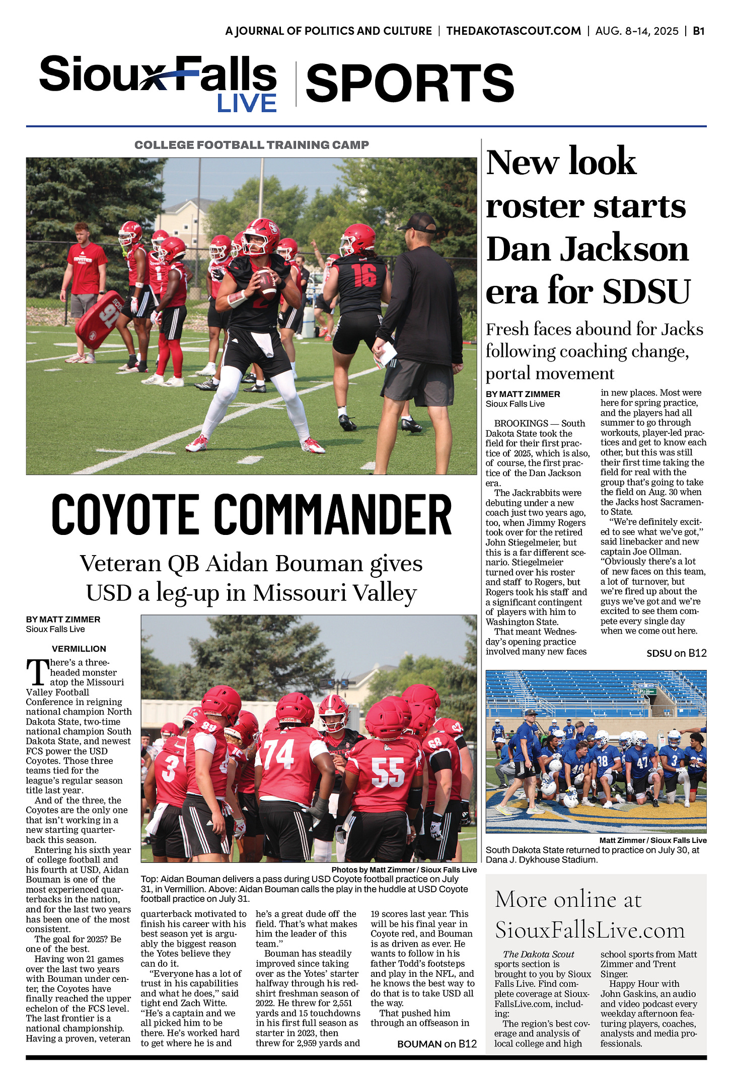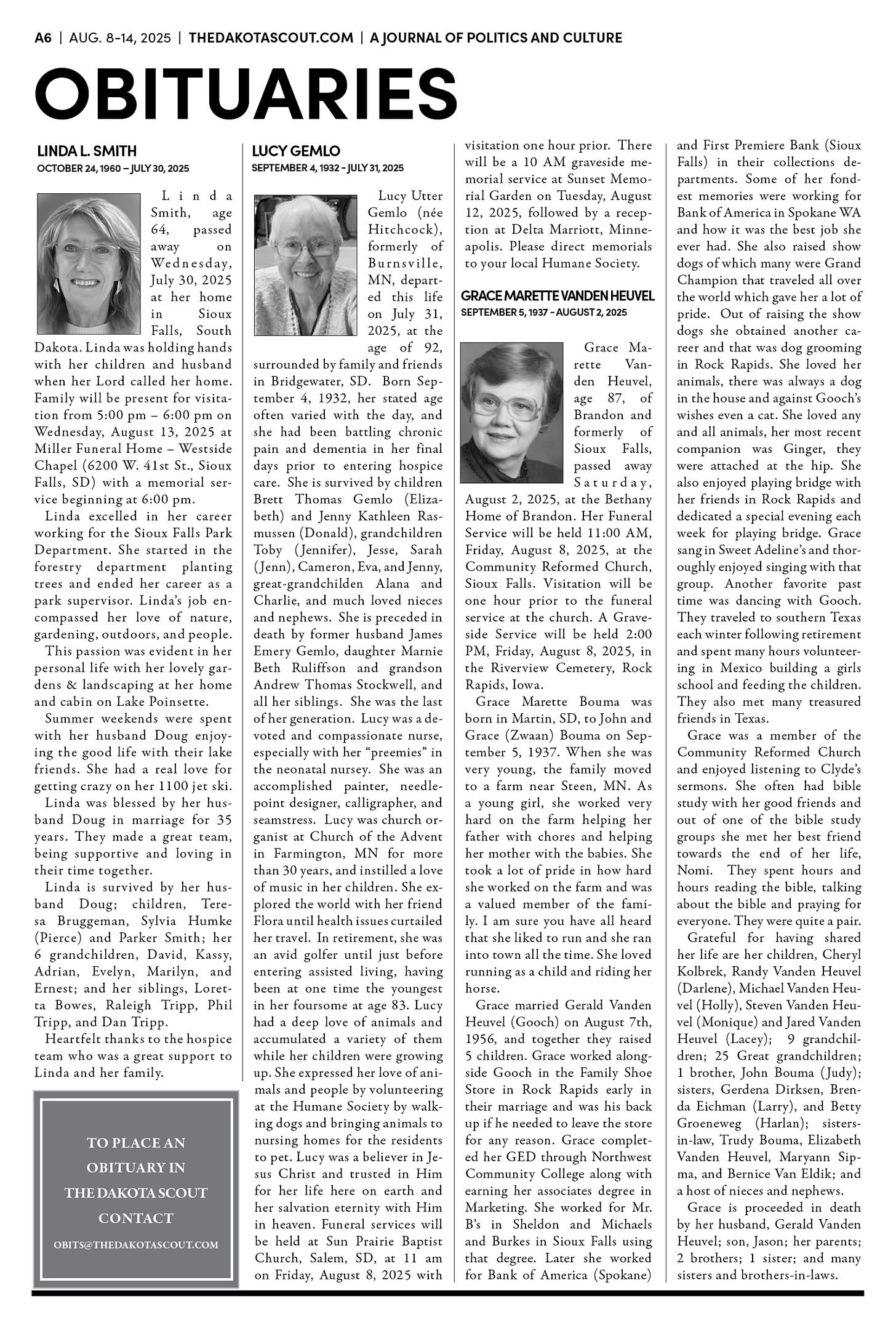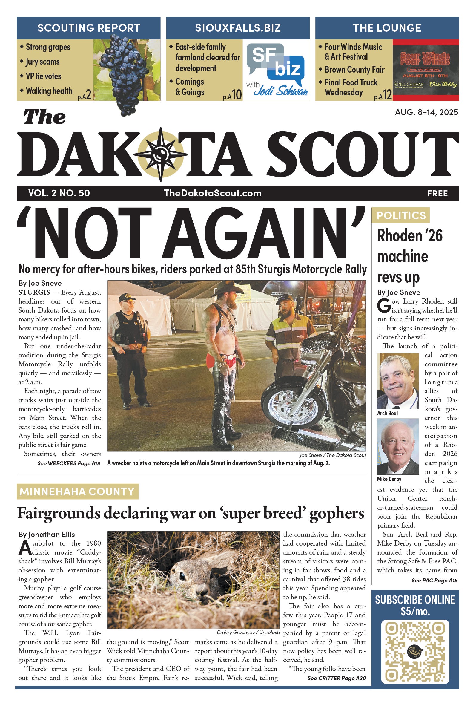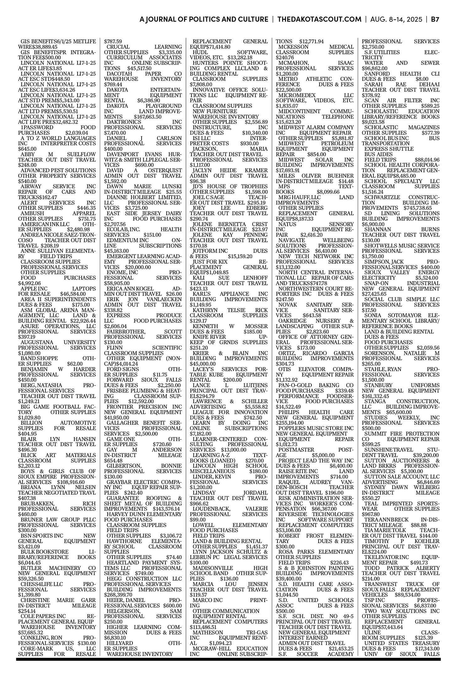 FREE TO READThe Dakota Scout e-editionVol. 2 No. 50 | Aug. 8-14, 2025The Dakota ScoutAug 11, 20256ShareThe Dakota Scout is reader-supported. To receive new posts and support our work, consider becoming a free or paid subscriber.SubscribeTo place an obituary, email obits@thedakotascout.comLegals & Public Notices: August 8, 2025Aug 8Read full storyBusiness content courtesy SiouxFalls.BusinessSports content courtesy SiouxFallsLive.comPreviousNext