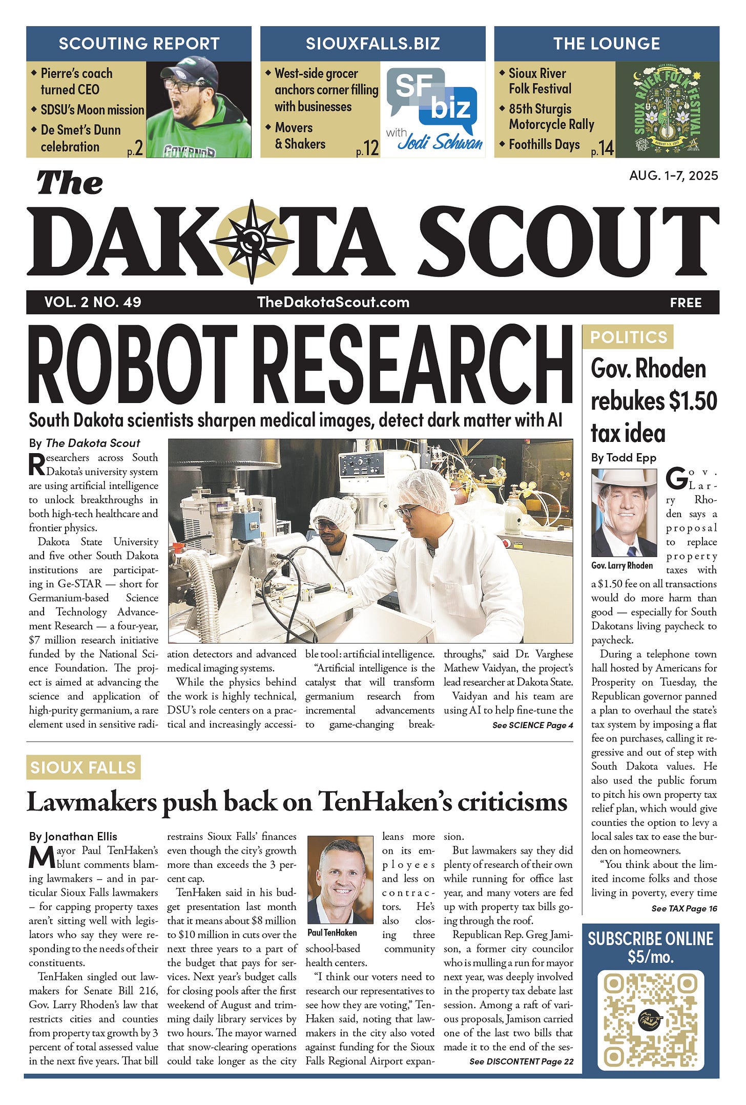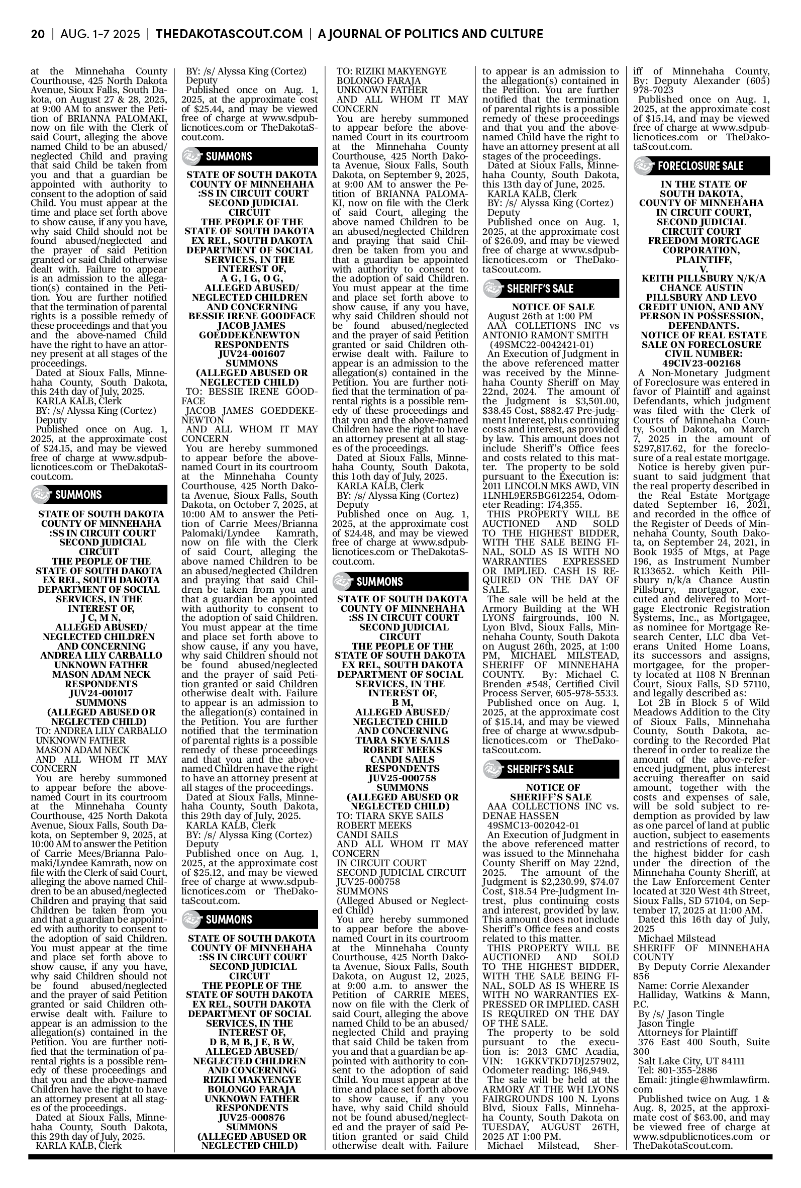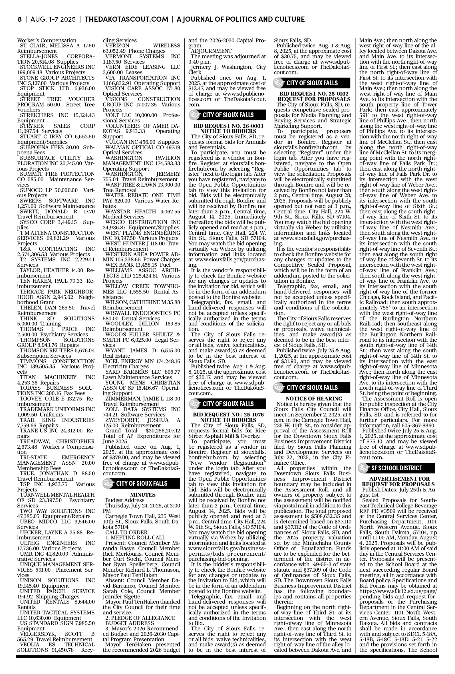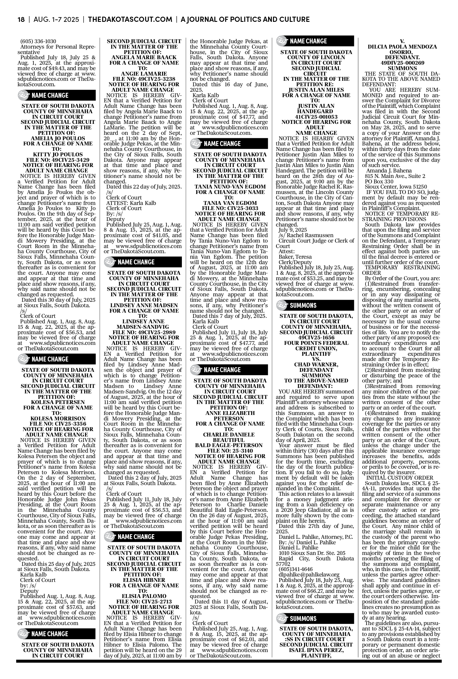 FREE TO READThe Dakota Scout E-edition Vol. 2 No. 49 | Aug. 1-7, 2025 The Dakota ScoutAug 04, 20253ShareThe Dakota Scout is reader-supported. To receive new posts and support our work, consider becoming a free or paid subscriber.SubscribeSubmit an obituary by emailing obits@thedakotascout.comLegals & Public Notices: July 25, 2025Jul 25Read full storyBusiness news courtesy SiouxFalls.BusinessSports courtesy SiouxFallsLive.comPreviousNext