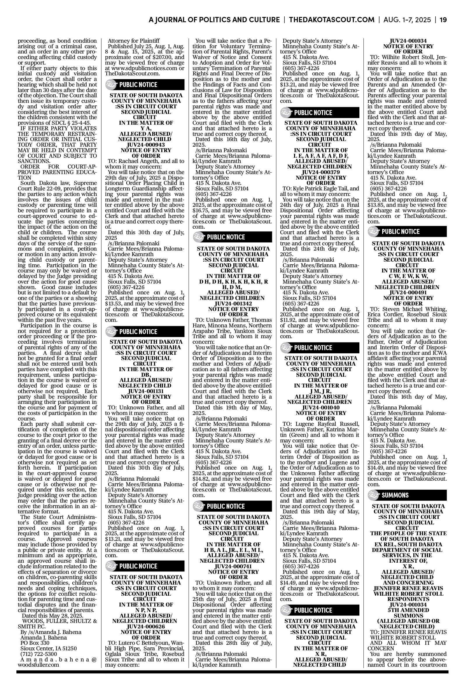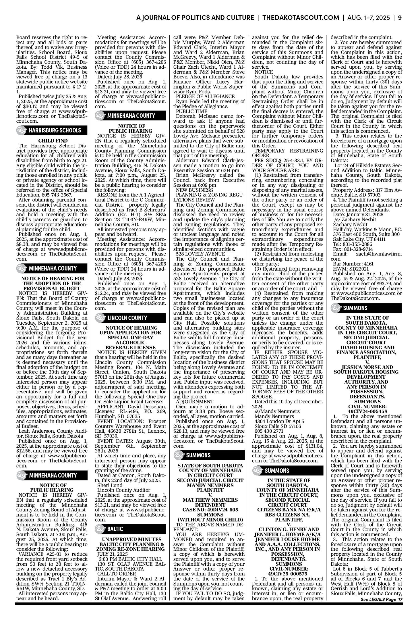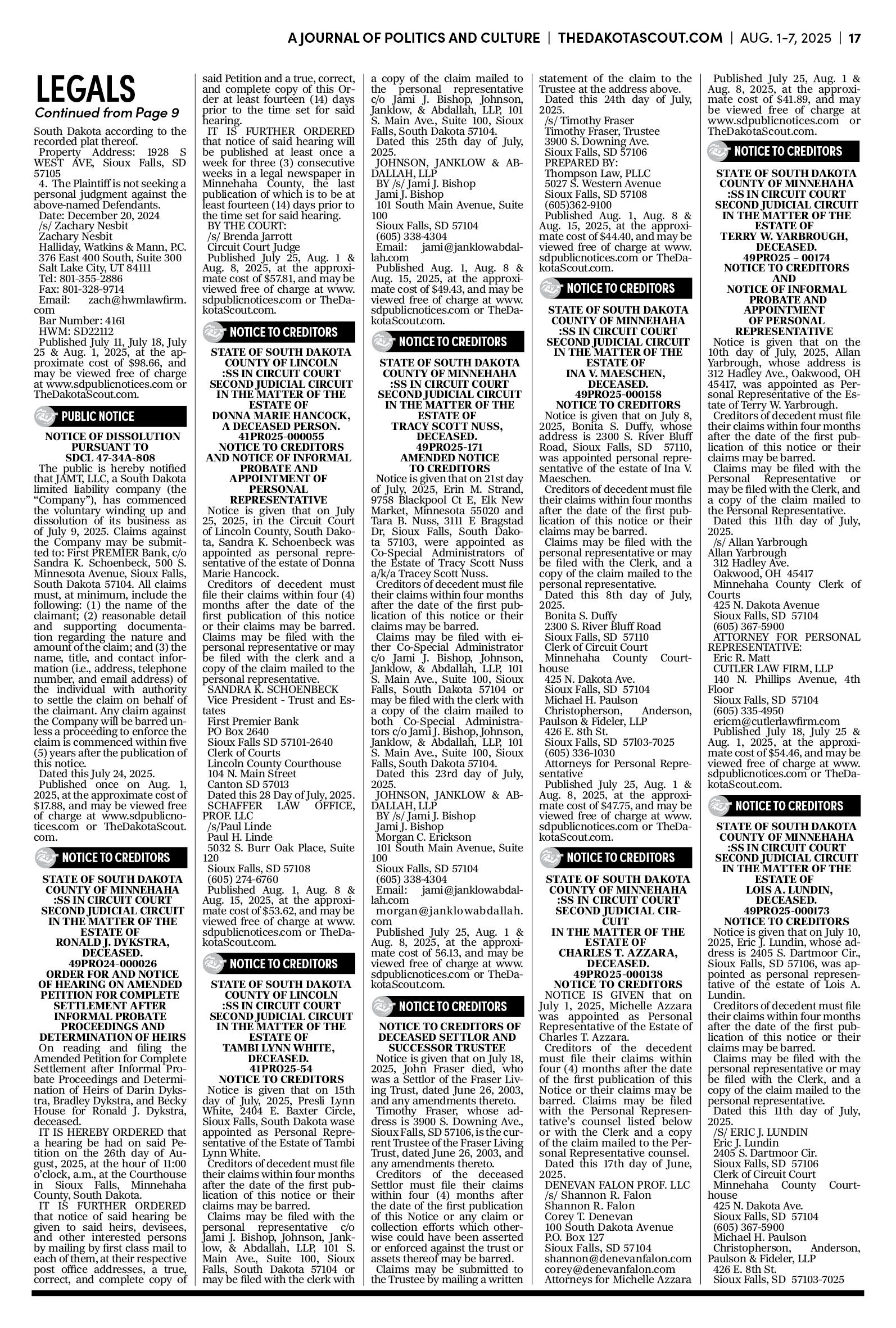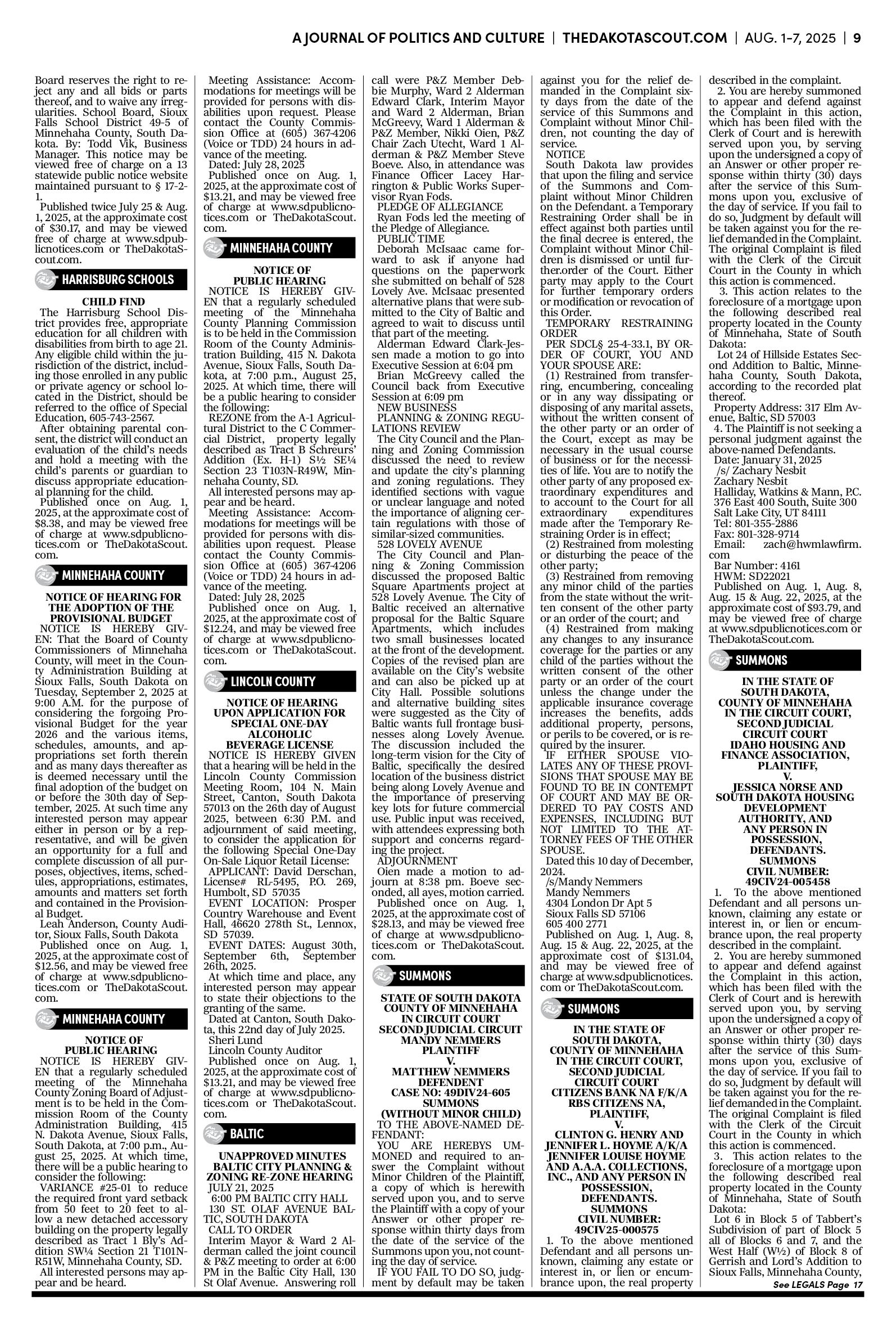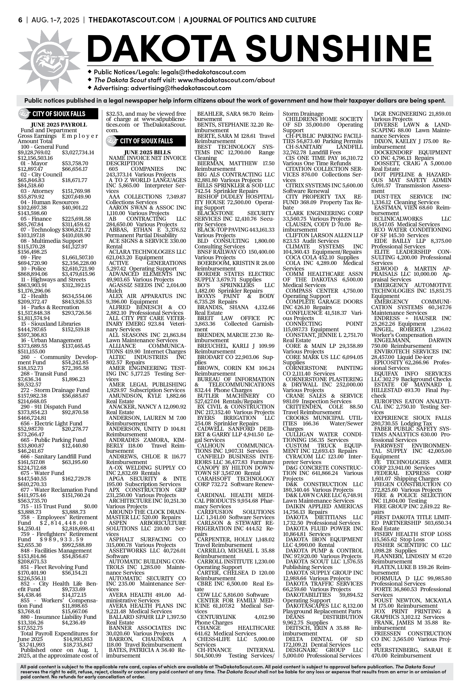 FREE TO READThe Dakota Scout E-edition Vol. 2 No. 49 | Aug. 1-7, 2025 The Dakota ScoutAug 04, 20253ShareThe Dakota Scout is reader-supported. To receive new posts and support our work, consider becoming a free or paid subscriber.SubscribeSubmit an obituary by emailing obits@thedakotascout.comLegals & Public Notices: July 25, 2025Jul 25Read full storyBusiness news courtesy SiouxFalls.BusinessSports courtesy SiouxFallsLive.comPreviousNext
