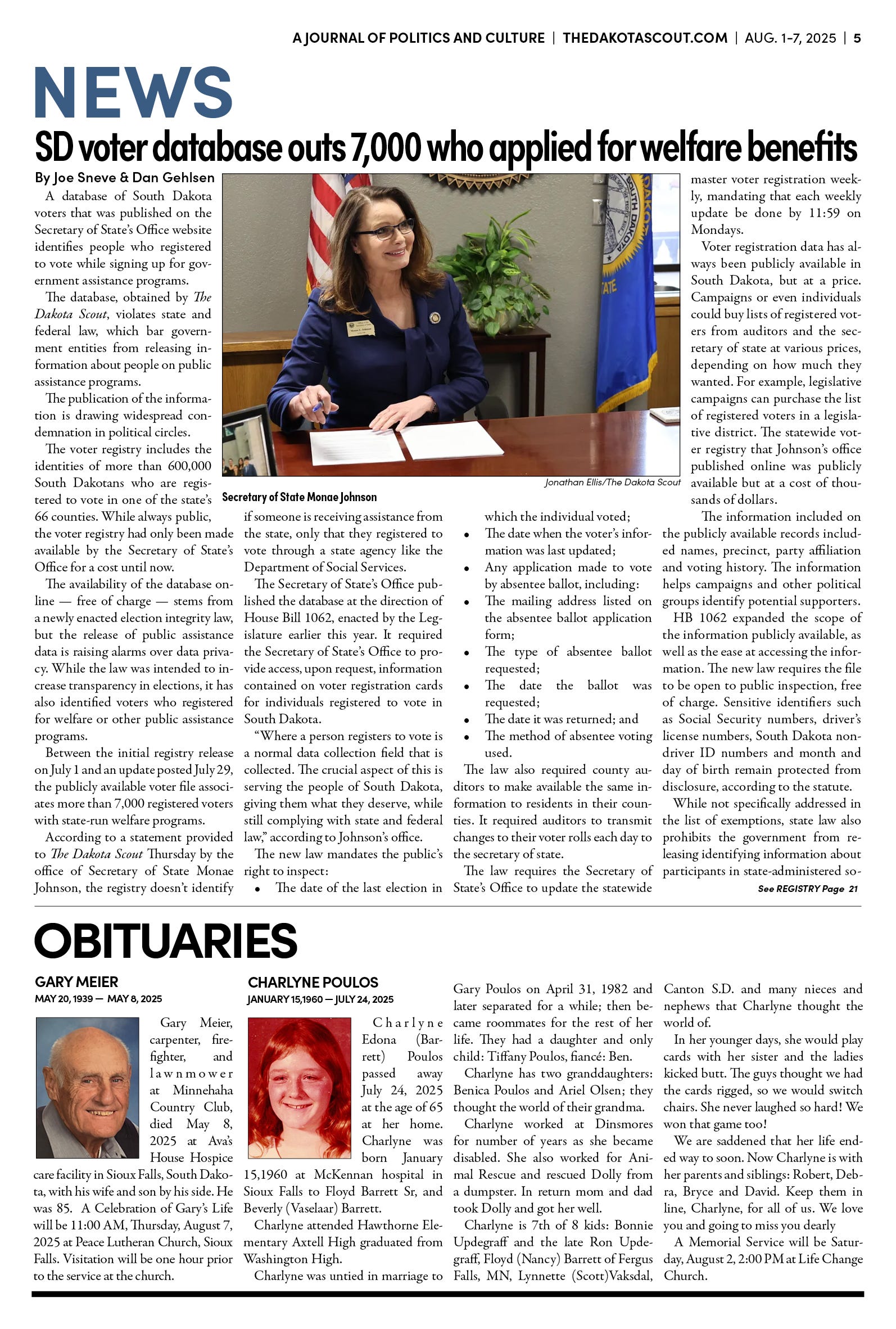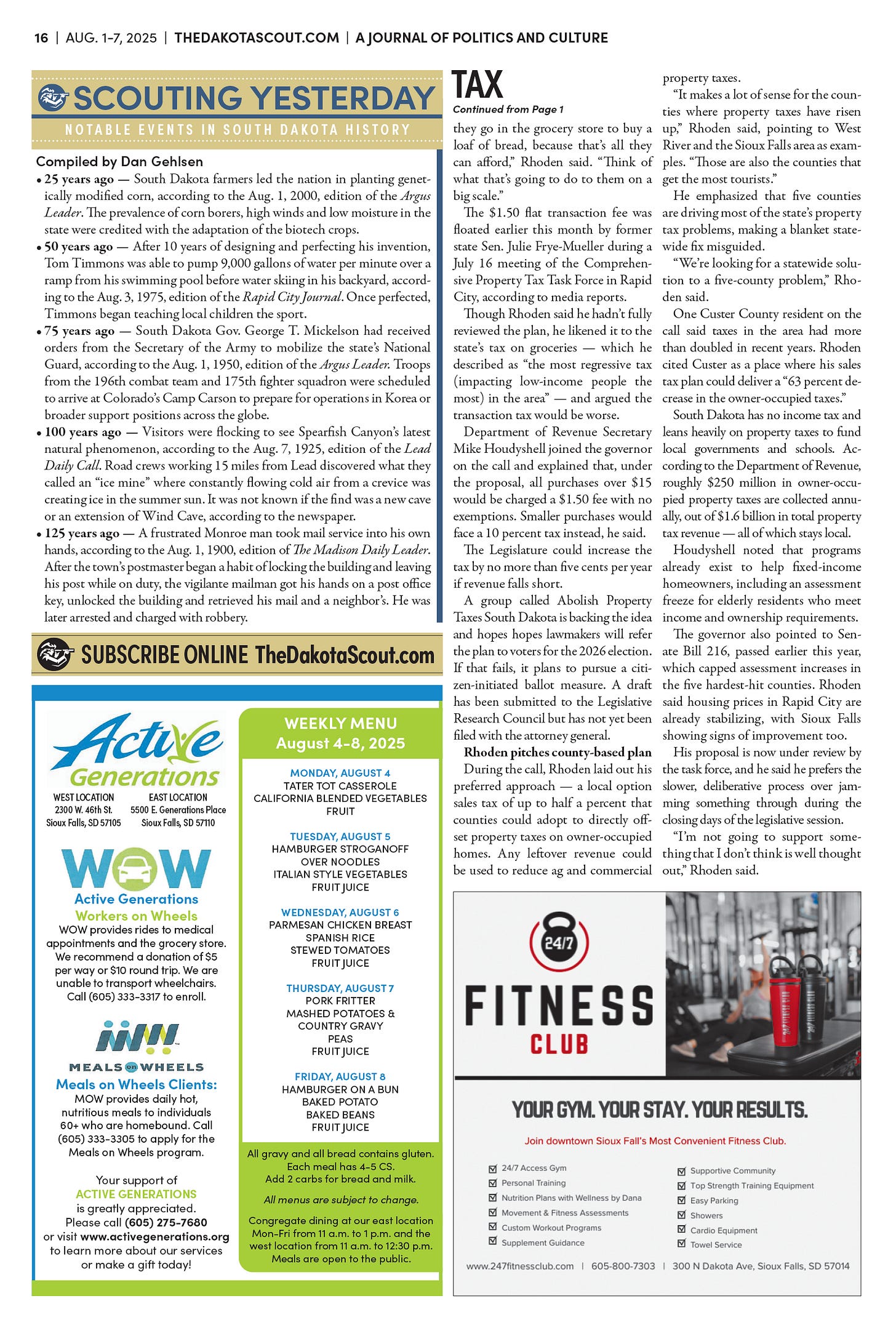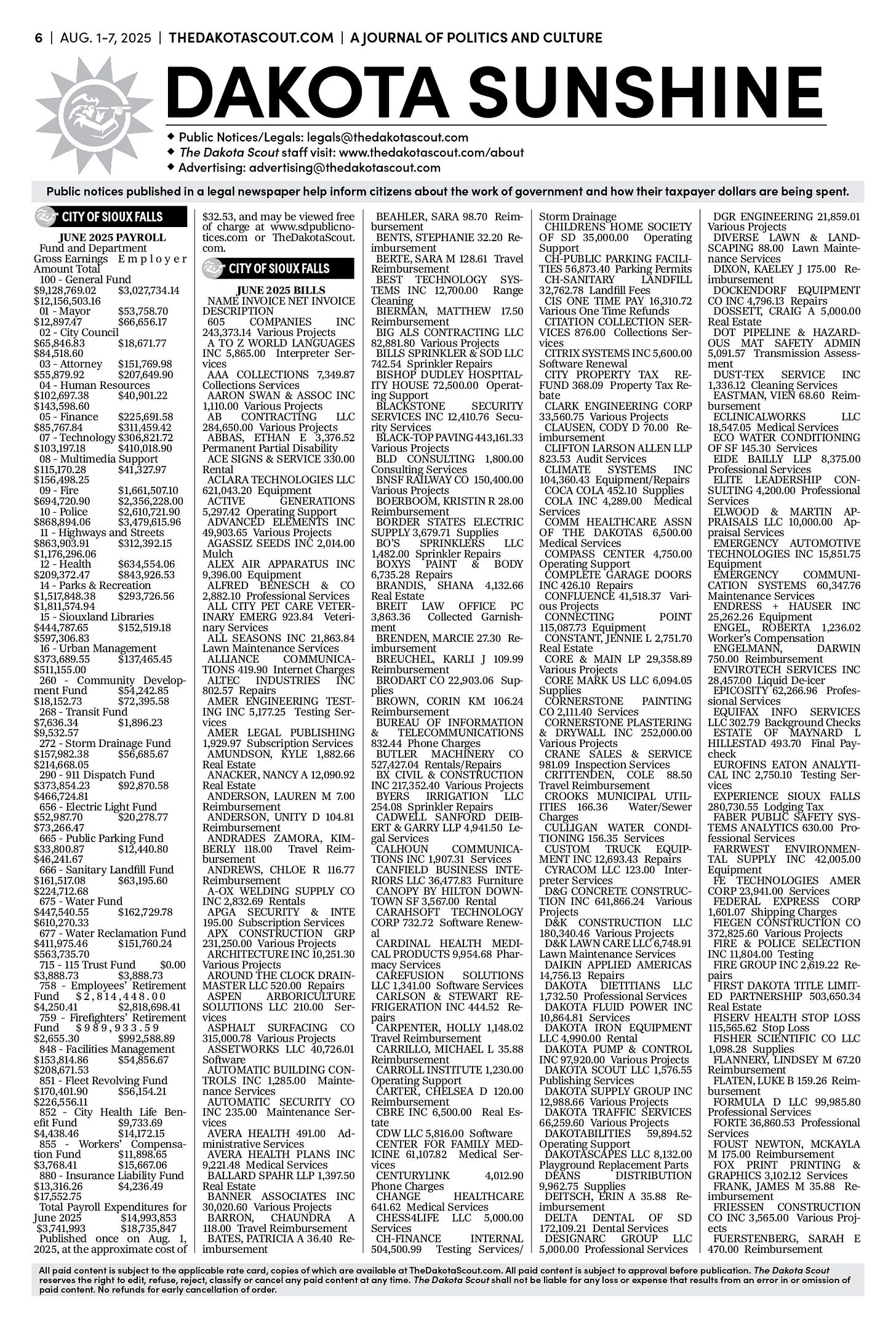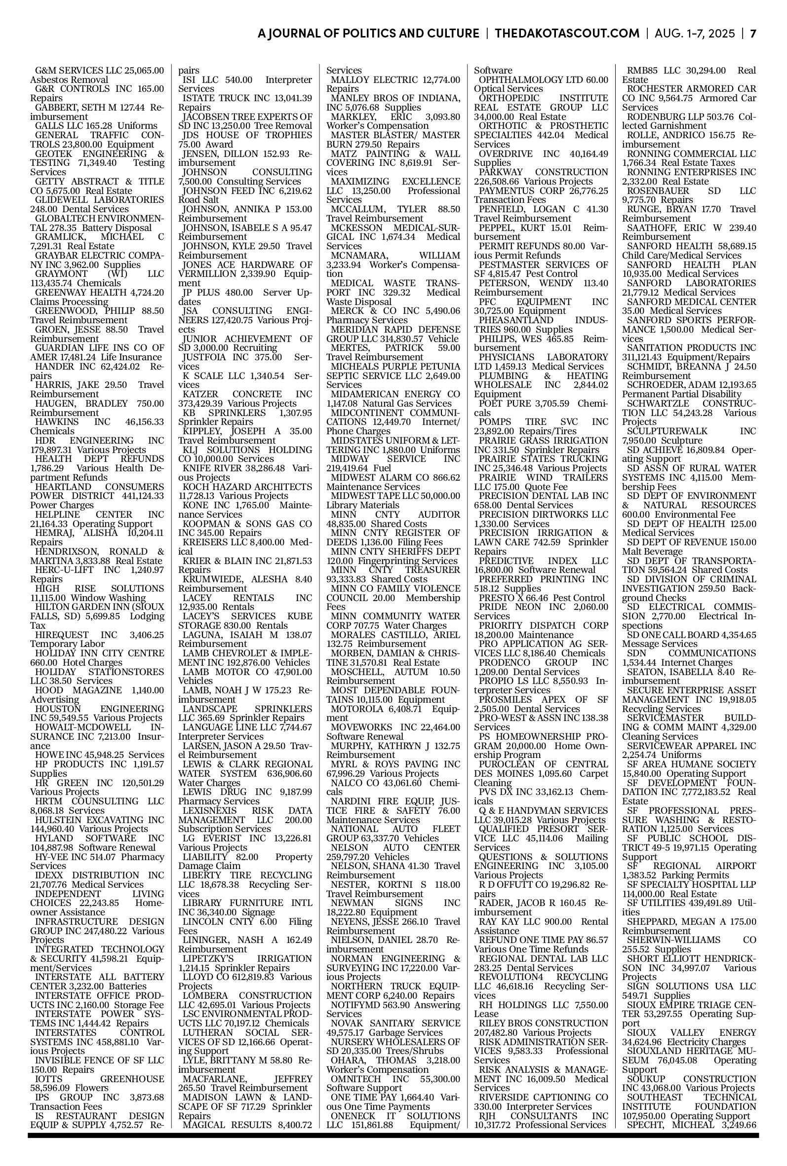 FREE TO READThe Dakota Scout E-edition Vol. 2 No. 49 | Aug. 1-7, 2025 The Dakota ScoutAug 04, 20253ShareThe Dakota Scout is reader-supported. To receive new posts and support our work, consider becoming a free or paid subscriber.SubscribeSubmit an obituary by emailing obits@thedakotascout.comLegals & Public Notices: July 25, 2025Jul 25Read full storyBusiness news courtesy SiouxFalls.BusinessSports courtesy SiouxFallsLive.comPreviousNext