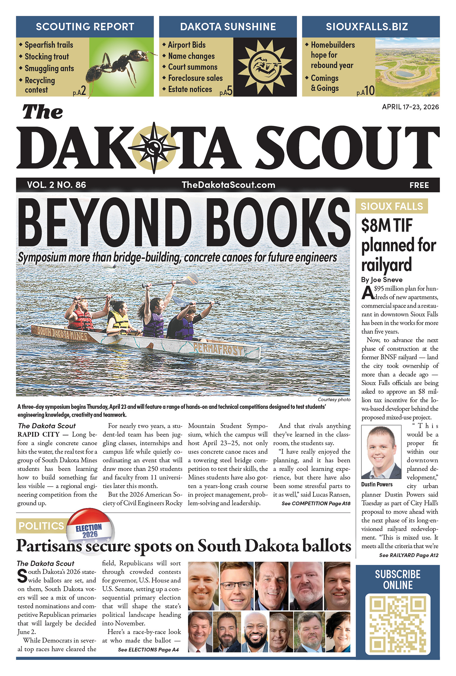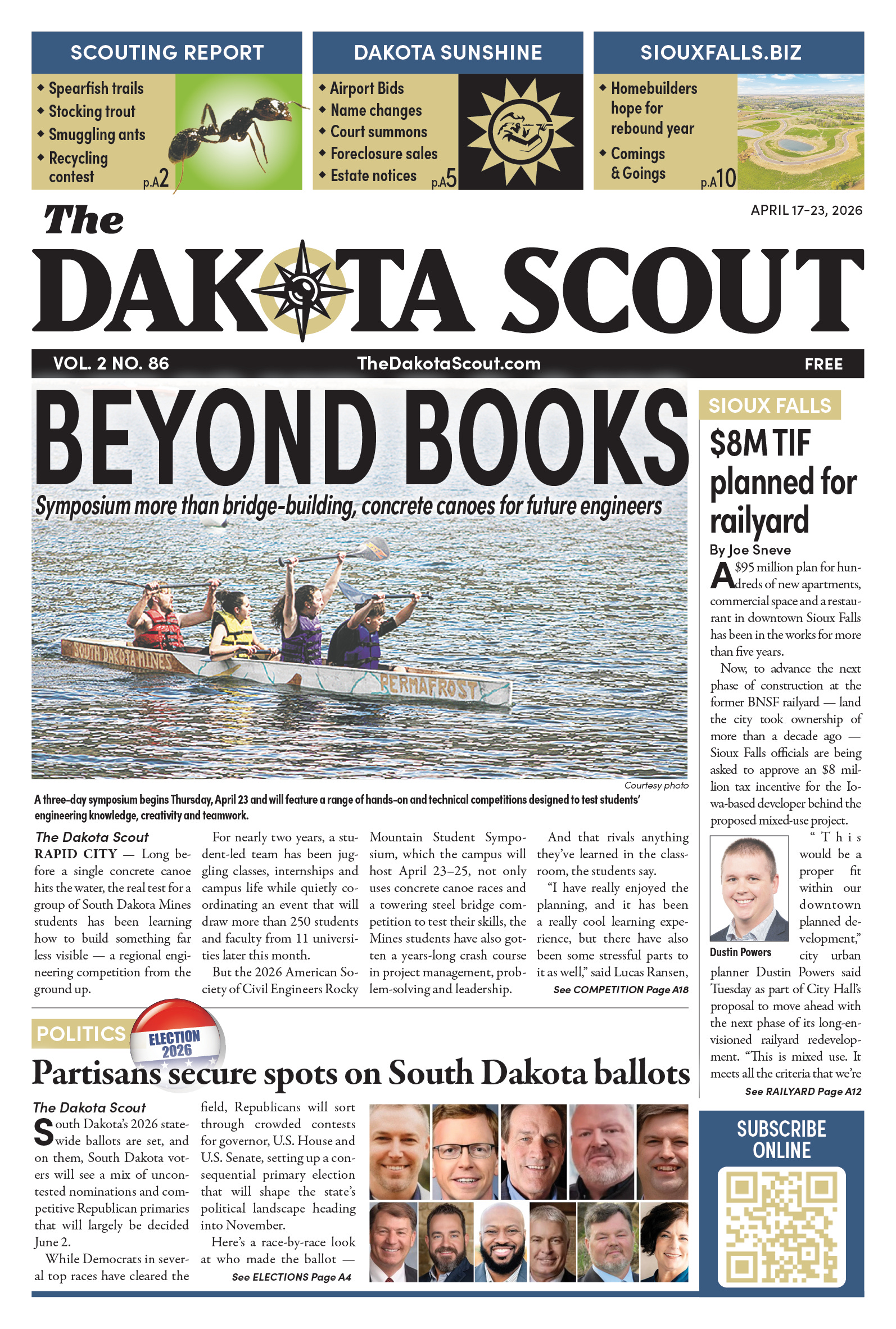 FREE TO READThe Dakota Scout E-edition | April 17-23, 2026Apr 20, 2026∙ PaidShareSioux Falls candidates sharpen contrasts in rapid-fire forumJoe Sneve·Apr 18Read full storySuspected bogus GOP primary candidates prompt criminal probe in South DakotaJoe Sneve·Apr 17Read full storyThe Dakota Scout is reader-supported. To receive new posts and support our work, consider becoming a paid subscriber.SubscribeContinue reading this post for free, courtesy of The Dakota Scout.Claim my free postOr purchase a paid subscription.Previous