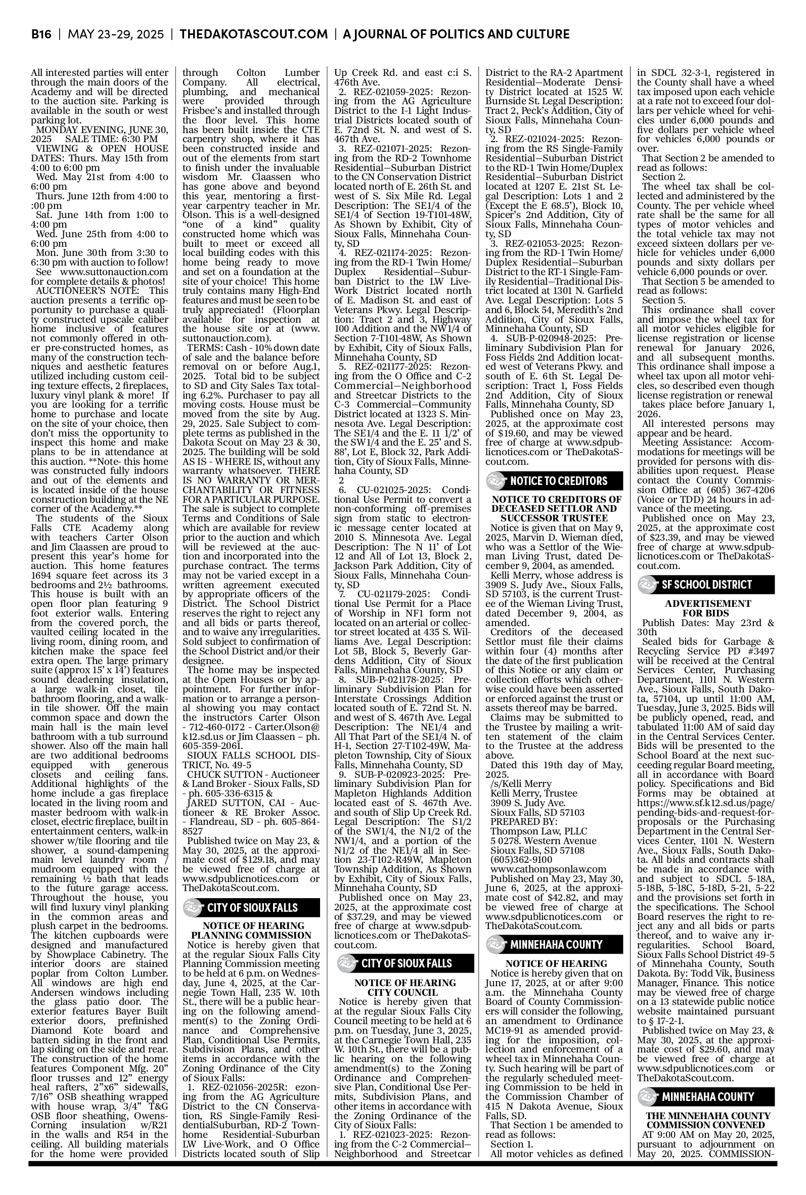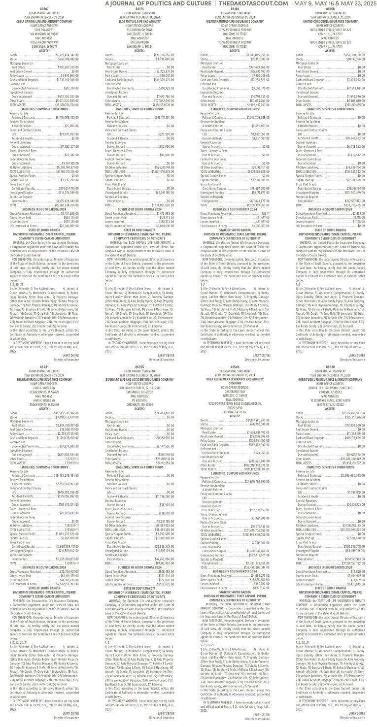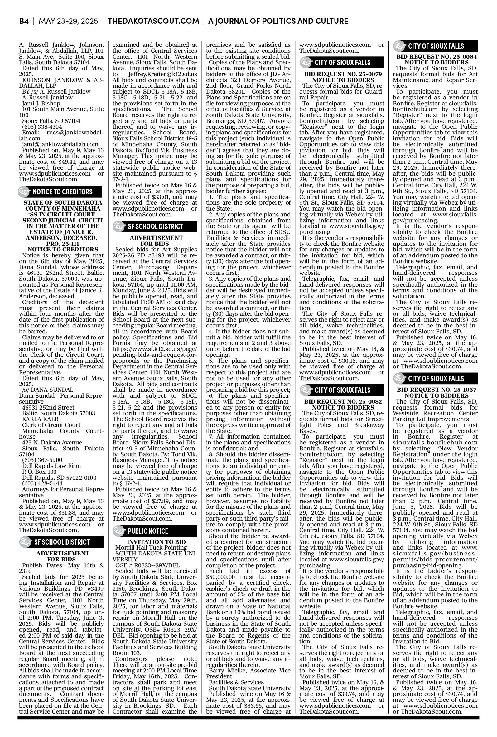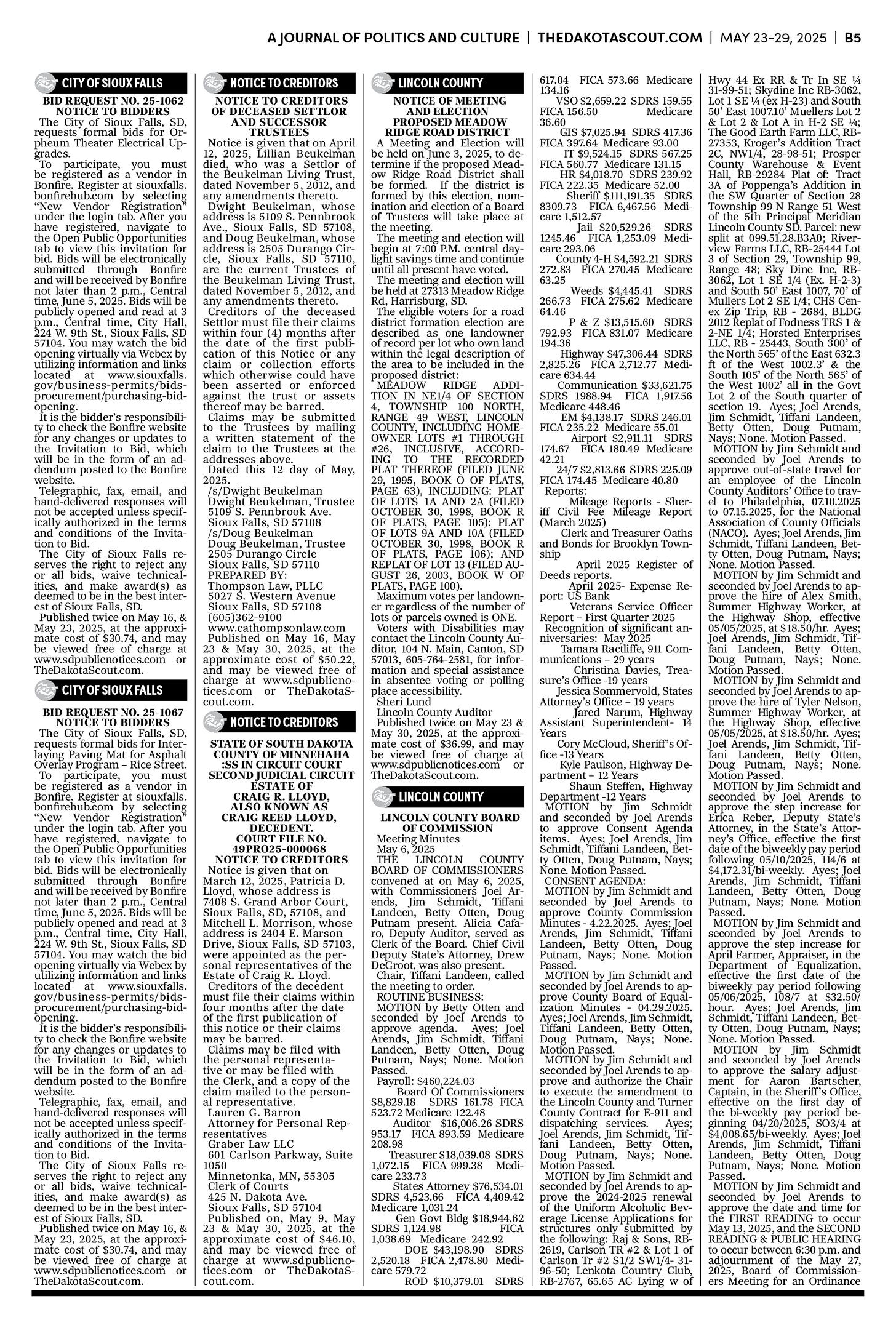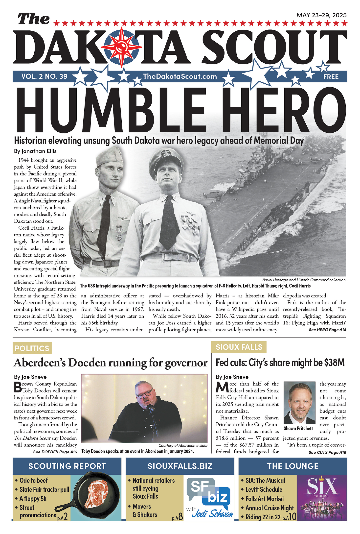 FREE TO READThe Dakota Scout E-edition Vol. 2 No. 39 | May 23-29, 2025The Dakota ScoutMay 26, 20252ShareThe Dakota Scout is reader-supported. To receive new posts and support our work, consider becoming a free or paid subscriber.SubscribeTo submit an obituary, email obits@thedakotascout.comSiouxFalls.BusinessThe Dakota Scout is reader-supported. To receive new posts and support our work, consider becoming a free or paid subscriber.SubscribeSiouxFallsLive.comLegals & Public Notices: May 23, 2025May 23Read full storyPreviousNext