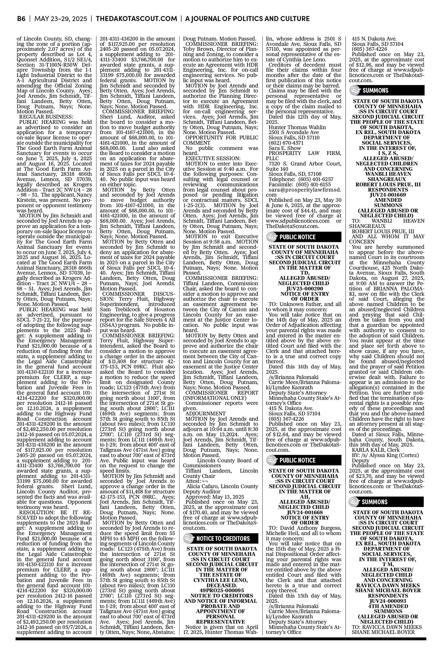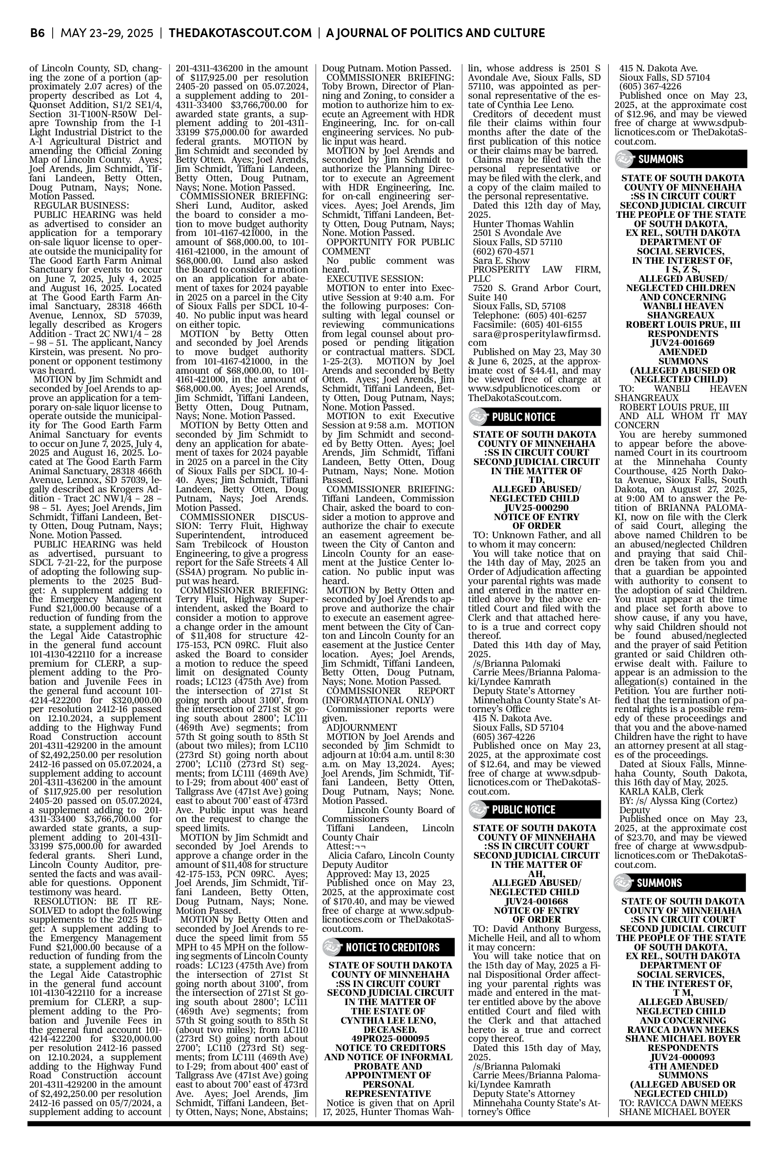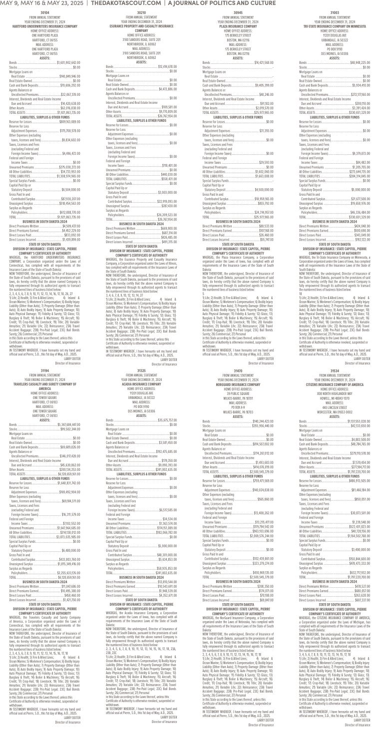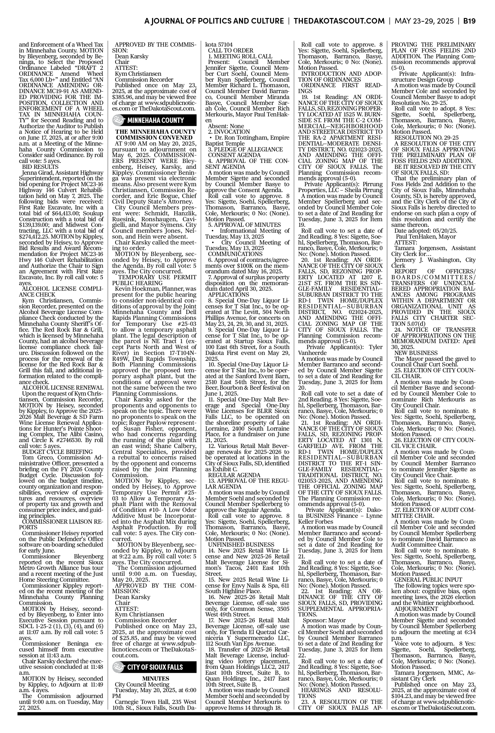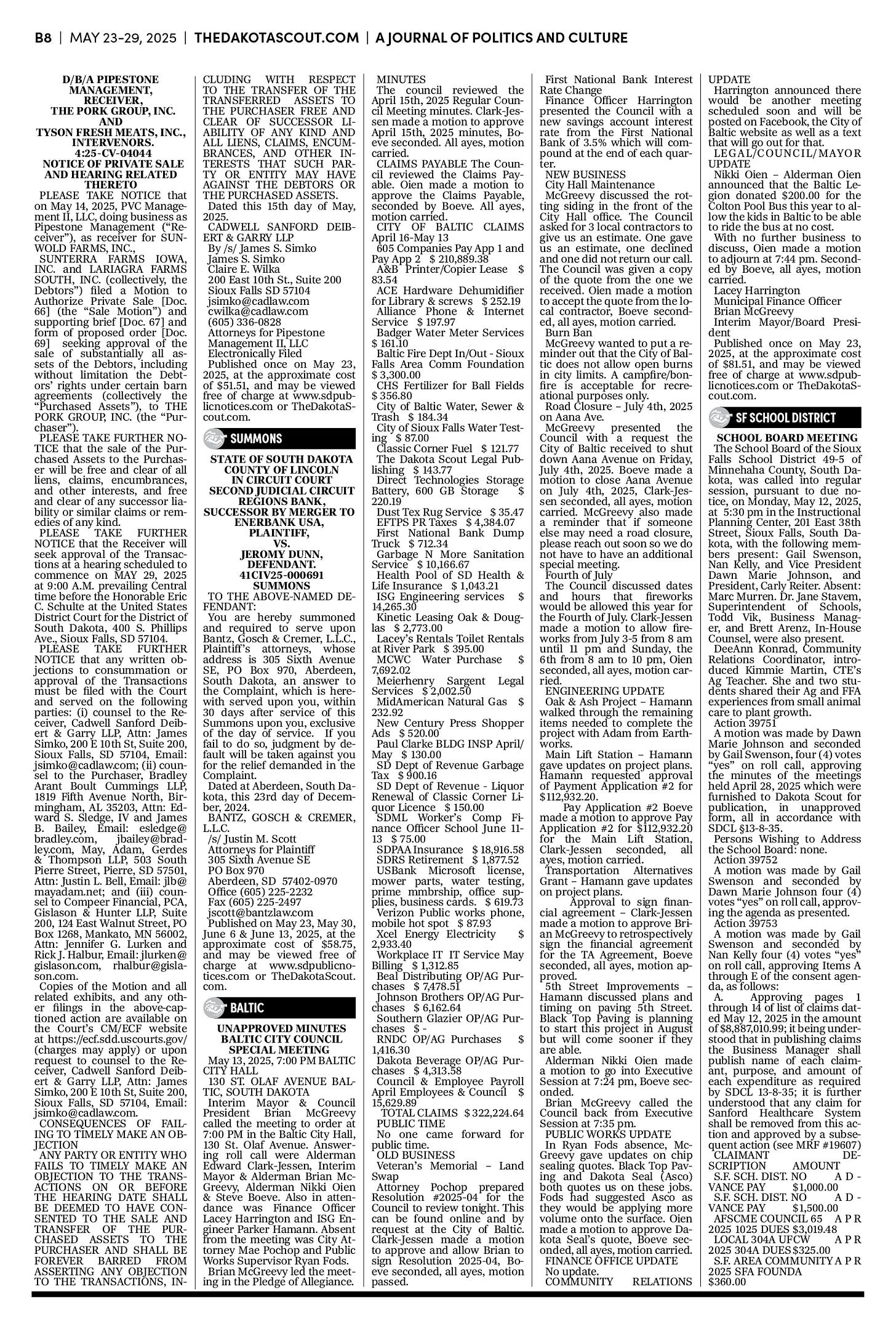 FREE TO READThe Dakota Scout E-edition Vol. 2 No. 39 | May 23-29, 2025The Dakota ScoutMay 26, 20252ShareThe Dakota Scout is reader-supported. To receive new posts and support our work, consider becoming a free or paid subscriber.SubscribeTo submit an obituary, email obits@thedakotascout.comSiouxFalls.BusinessThe Dakota Scout is reader-supported. To receive new posts and support our work, consider becoming a free or paid subscriber.SubscribeSiouxFallsLive.comLegals & Public Notices: May 23, 2025May 23Read full storyPreviousNext