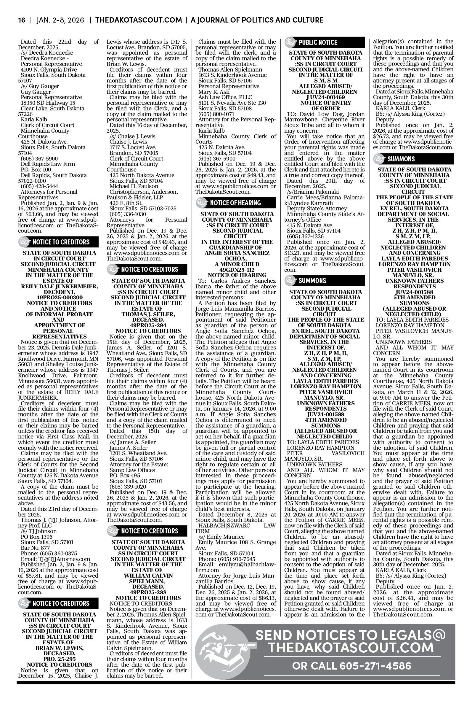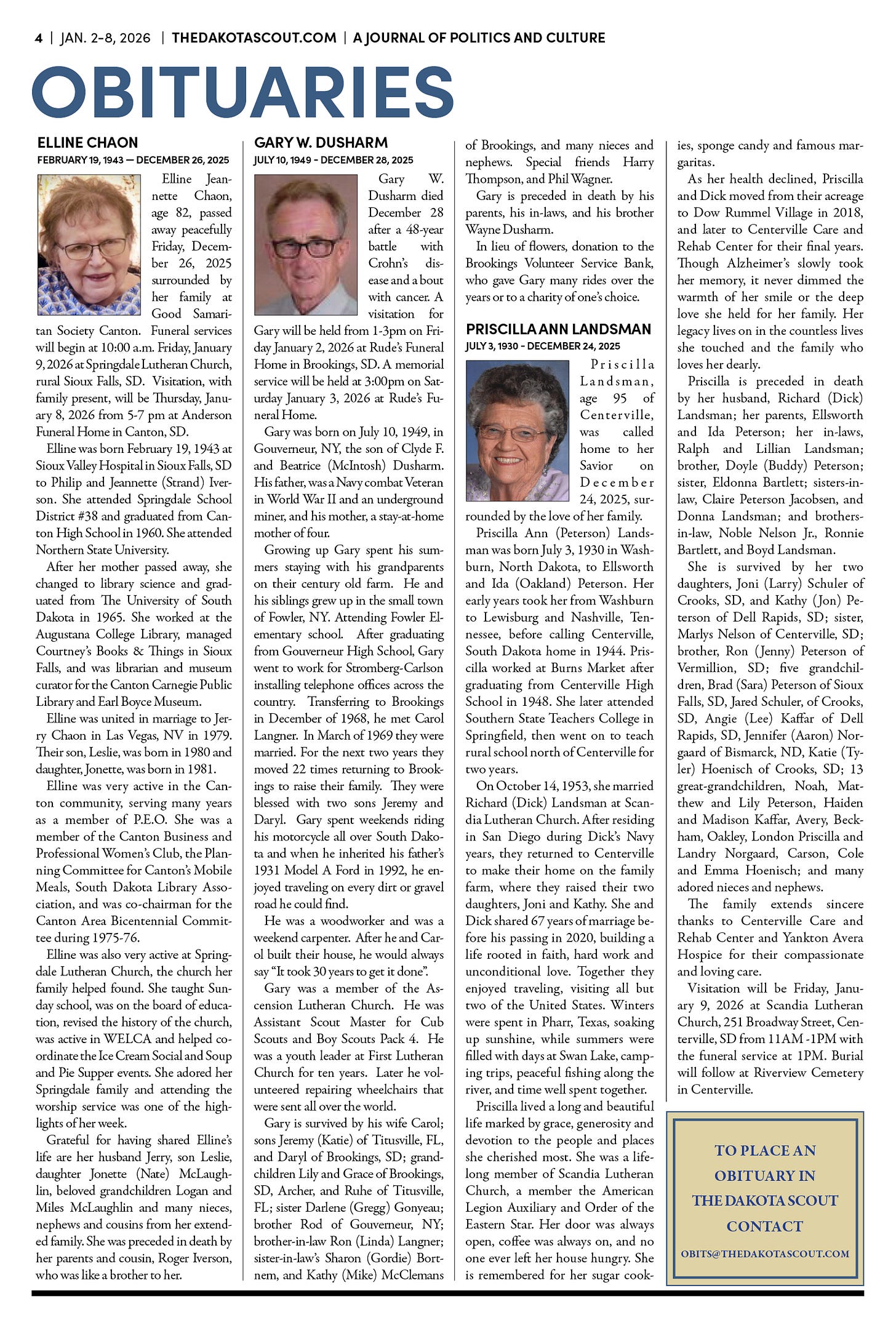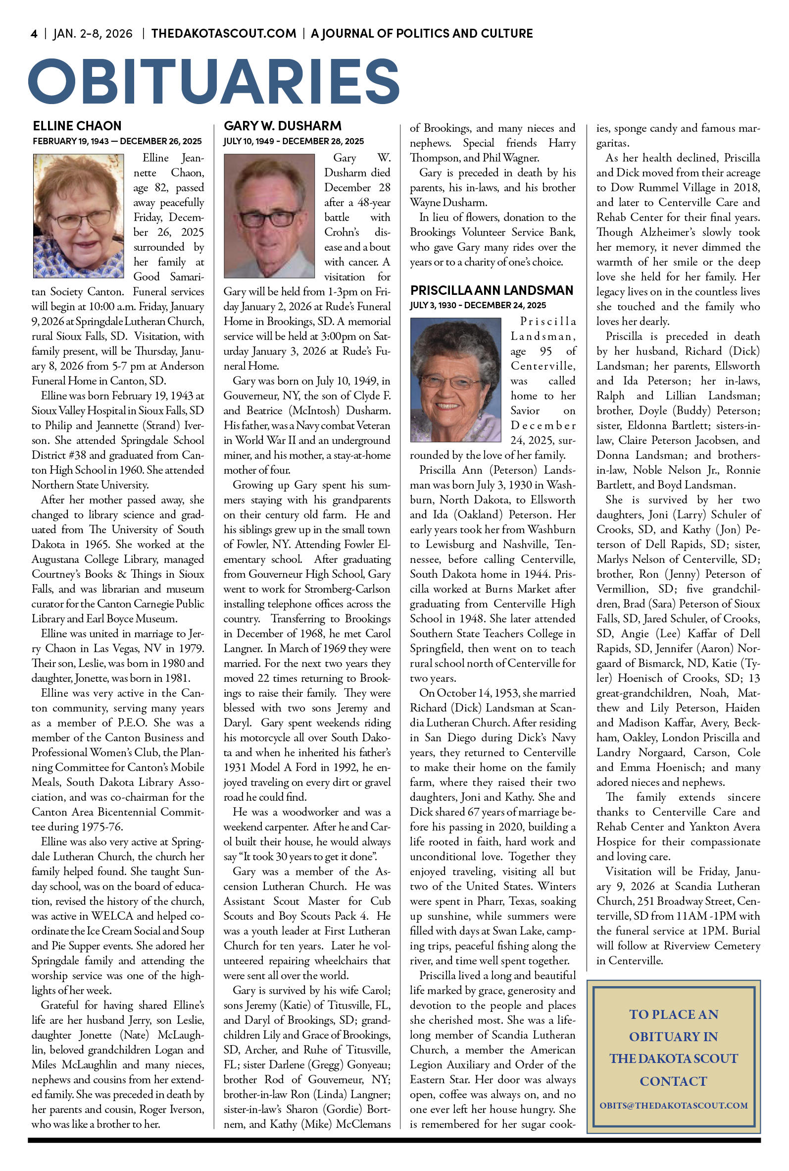 To publish an obituary in The Dakota Scout, email obits@thedakotascout.com