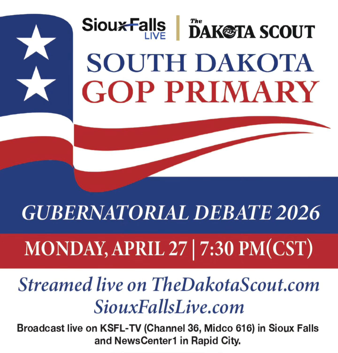 The 90-minute debate begins at 7:30 p.m. in front of a sold-out audience of about 300 subscribers of The Dakota Scout. The debate will air live on KSFL in Sioux Falls (Channel 36 and Midco channel 616) and KNBN in RAPID CITY (NewsCenter 1 Channel 21 and Midco 610), and will be livestreamed on TheDakotaScout.com and SiouxFallsLive.com. It will also be recorded for future public broadcast.