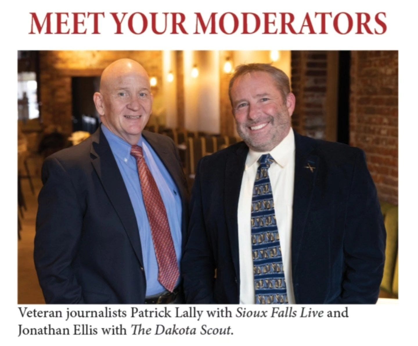 "Veteran South Dakota journalists Jonathan Ellis of The Dakota Scout and Patrick Lalley of SiouxFallsLive.com will moderate the debate. They will enforce time limits and ensure equal participation among candidates. . . All questions were prepared in advance by journalists from The Dakota Scout and Sioux Falls Live, and candidates will not see them prior to the debate . . . Immediately following the debate, tune into TheDakotaScout.com for a special post-debate Scouting Lounge podcast that will be video streamed from the Washington Pavilion.”
