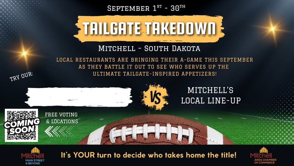 Tailgate Takedown kicks off in Mitchell with a month-long celebration of flavor and football spirit. Local restaurants will compete for the title of Ultimate Tailgate Appetizer Champion, serving up wings, sliders, dips, and more. Participants are invited to taste each dish, vote for their favorite, and support the local culinary scene. Voting is free and available through the "Everything Mitchell" app throughout September.