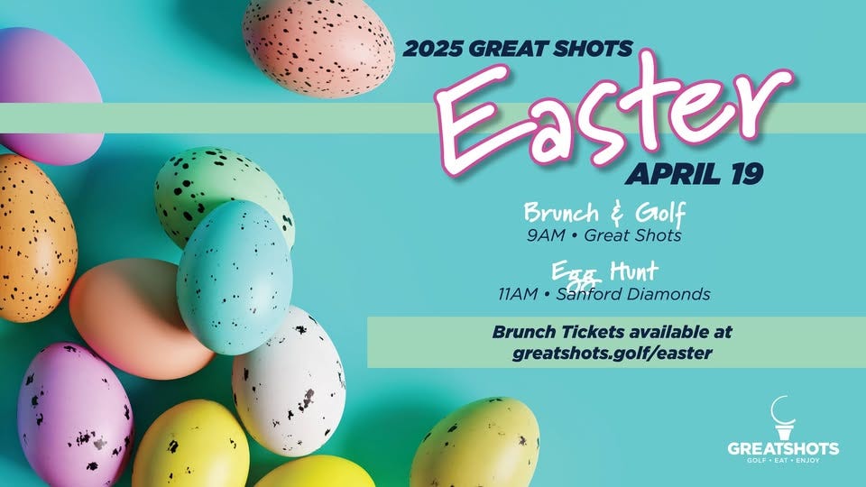 Start your morning with brunch & golf at Great Shots, where guests can enjoy a delicious meal followed by a round of golf in a relaxed setting. Advance ticket purchase is required for this portion of the day. Later in the morning, families are invited to the Easter Egg Hunt at Sanford Diamonds. This free event is open to the public, and participants are encouraged to bring their own Easter baskets.