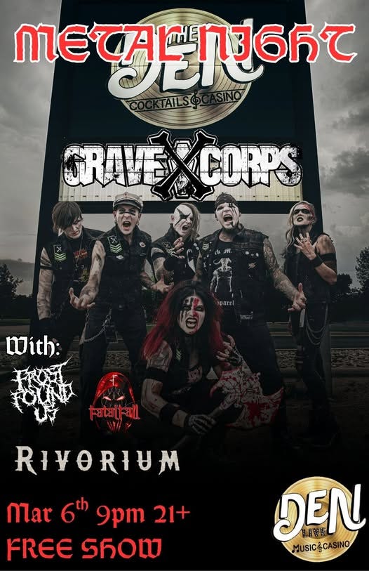 Headbangers await as several local metal bands take the stage for a free show this Friday. This 21+ concert features the horror-themed “Grave Corps,” “Fatal Fall” and “Dissipated” from Sioux City, Fargo’s "Frost Found Us,” and Sioux Falls’ very own, “Rivorium.”
