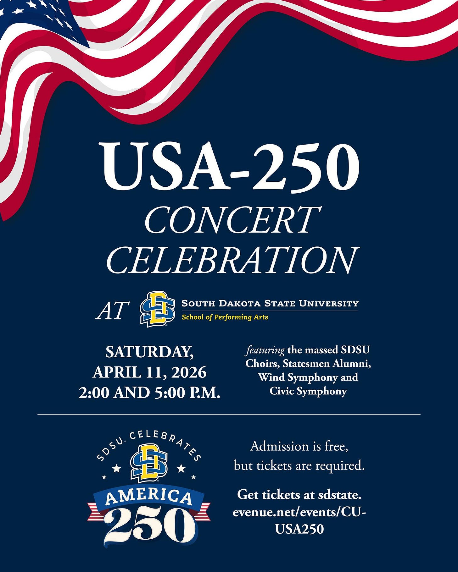 The SDSU School of Performing Arts presents USA 250: A Patriotic Celebration. Concert times are at 2 and 5 p.m. Admission is free, but tickets must be purchased to attend the event.