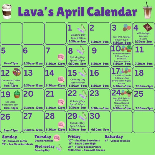 Experiment with succulents, knit the night away, try your hand at canvas painting or whip out your favorite board game—all with your favorite espresso or latte in hand. Enjoy the variety of activities available throughout the month of April.