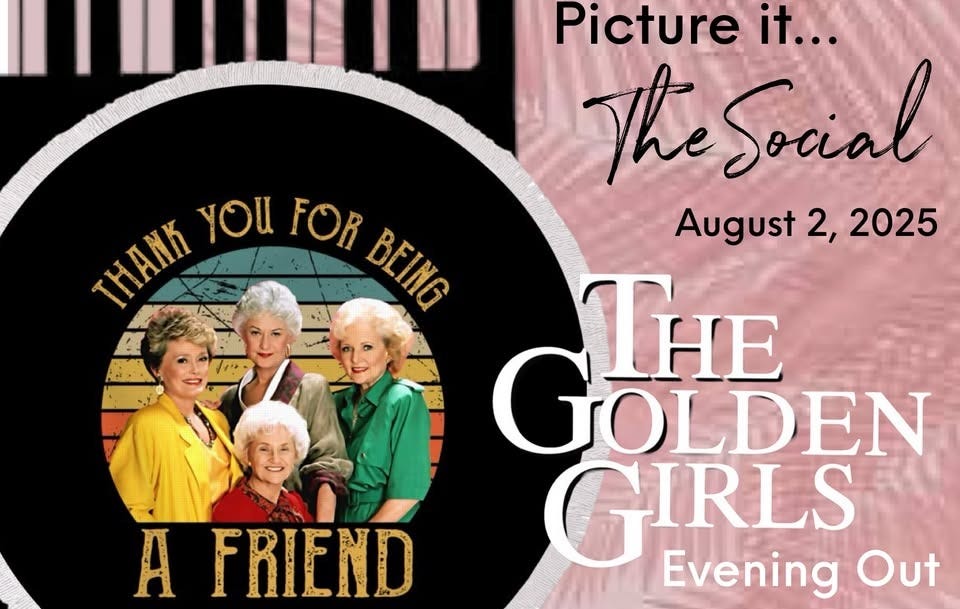 The Social in Sioux Falls hosts a Golden Girls-themed evening featuring a live dueling piano show by the Dueling Duo. Guests will enjoy a traditional Italian meal, cheesecake, and entertainment inspired by the beloved show. Costumes are encouraged for a night of music, laughter, and celebration of friendship.