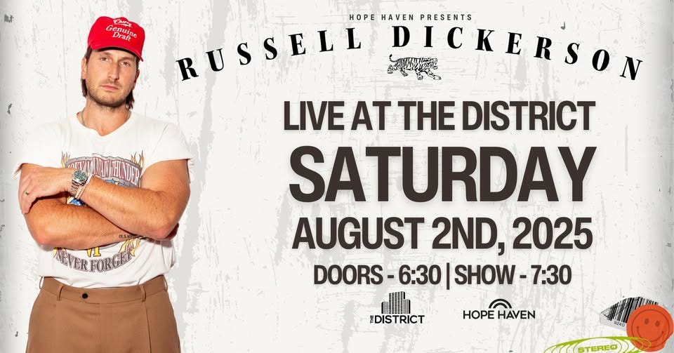 Russell Dickerson performs live at The District, presented by Hope Haven. The evening will showcase his popular country hits and high-energy stage presence. Fans can expect an engaging show filled with memorable music.