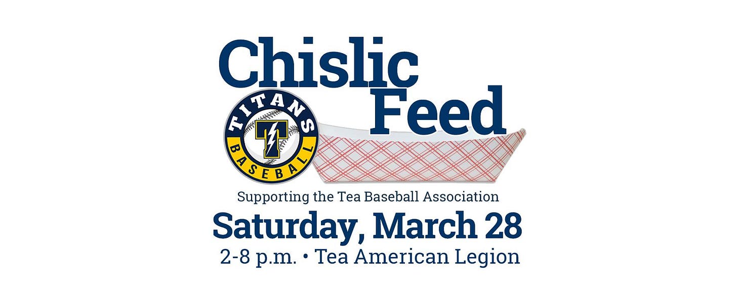 Come for the chislic and stay for the games. The Tea Baseball Association’s 3rd Annual Chislic Feed & Silent Auction is looking to bring the Tea area community together to support local baseball. All ages are invited to play bingo and win prizes, including 50/50 cash games as well as more kid-friendly prizes. Bingo starts at 3 p.m.