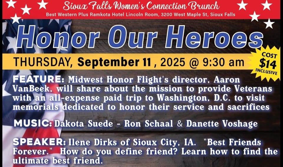 Spend a few meaningful hours in a warm and welcoming atmosphere at this special brunch event. Centered around the theme "Honor Our Heroes," the morning will feature Aaron VanBeek, director of Midwest Honor Flight, who will share the organization’s mission to provide veterans with all-expense-paid trips to Washington, DC to visit memorials that honor their service and sacrifices. Musical entertainment will be provided by Dakota Suede, featuring Ron Schaal and Donette Voshage. Guest speaker Ilene Dirks of Sioux City, Iowa, will present “Best Friends Forever,” a thoughtful reflection on the meaning of friendship and how to find the ultimate best friend.